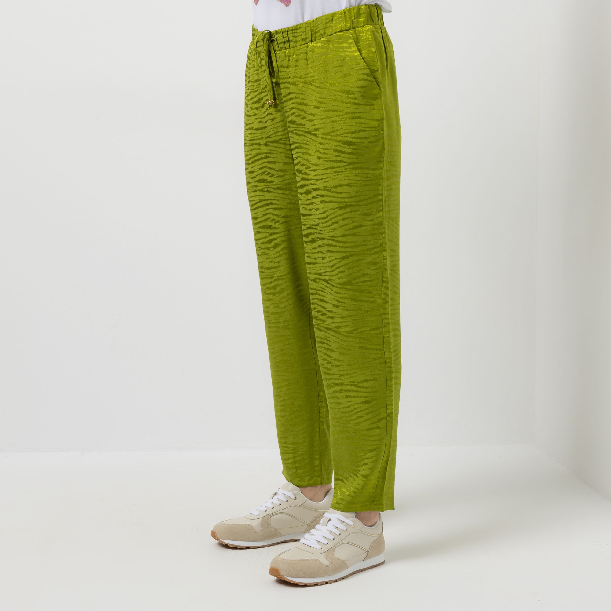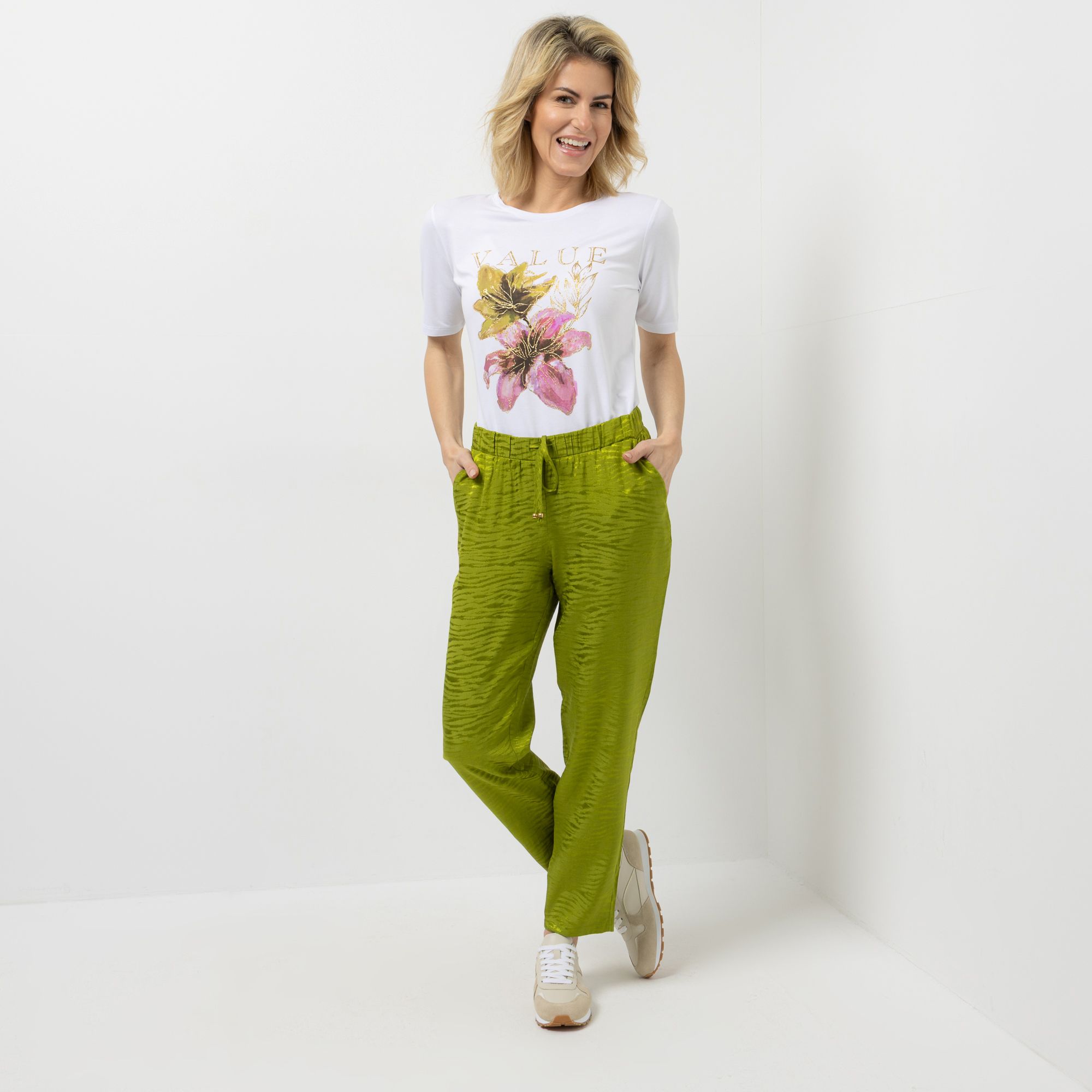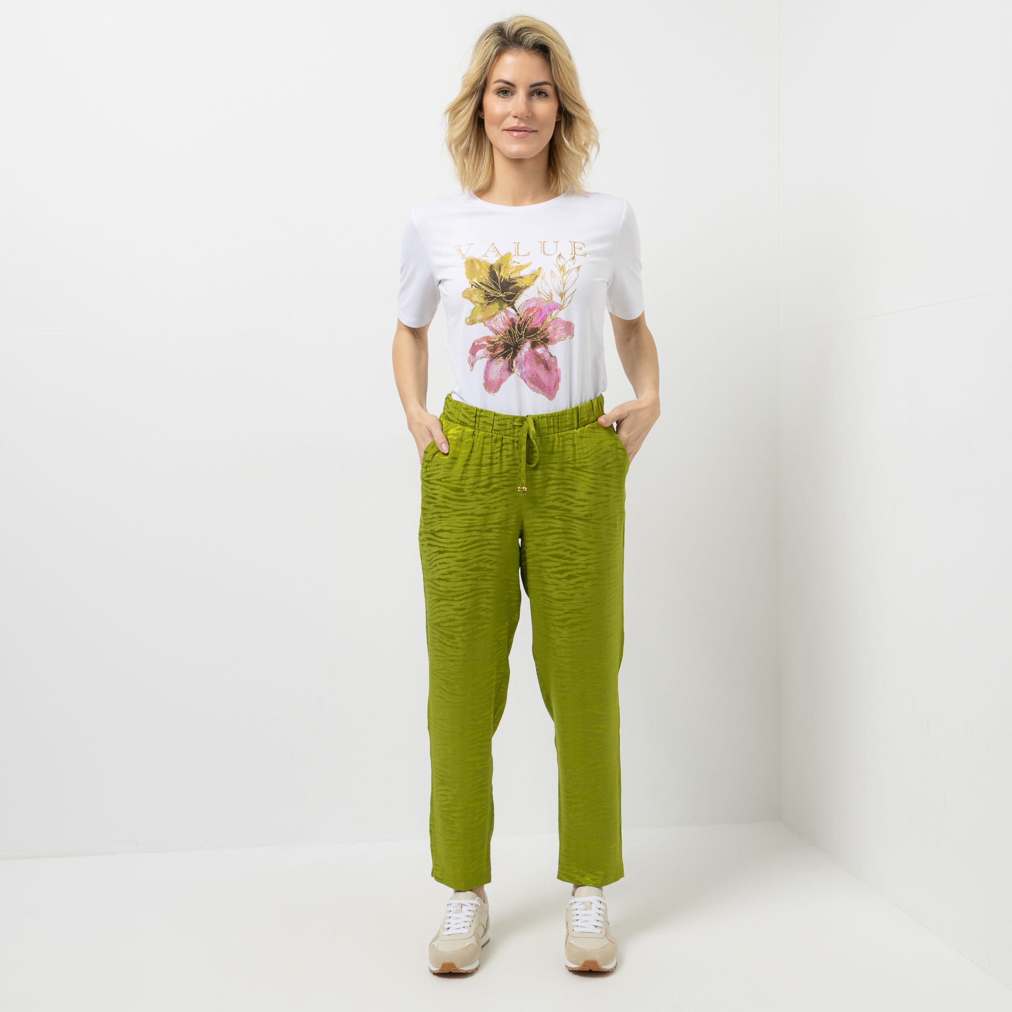 VIA MILANO bringt mit dieser Hose ein frisches Design in deinen Alltag. Die Kombination aus Animalprint und konischem Beinverlauf verleiht dem Klassiker einen modernen Twist, während der Rundumdehnbund und die praktische Kordel für angenehme Bewegungsfreiheit sorgen.