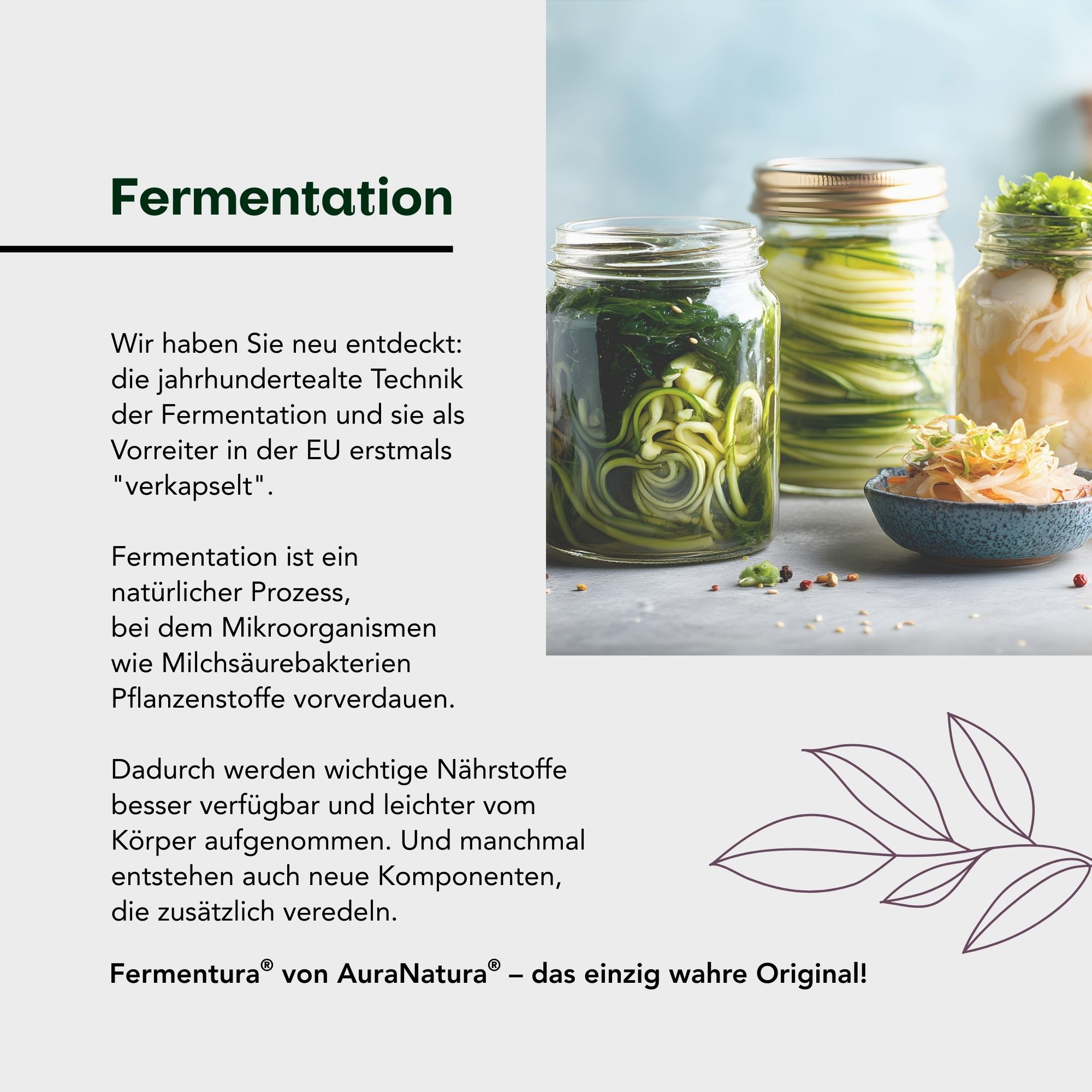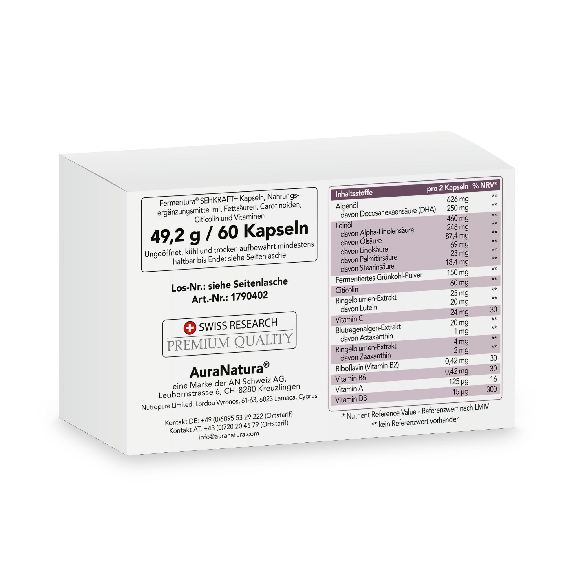 Fermentura® Sehkraft+ ist ein Nahrungsergänzungsmittel der Marke AuraNatura®. Es beinhaltet eine fein abgestimmte 11-fach Kombination aus fermentiertem Grünkohl, der Omega-3-Fettsäure DHA aus Algenöl, Citicolin, Zeaxanthin und Lutein aus Ringelblumen, Astaxanthin aus Blutregenalgen und Vitaminen.
