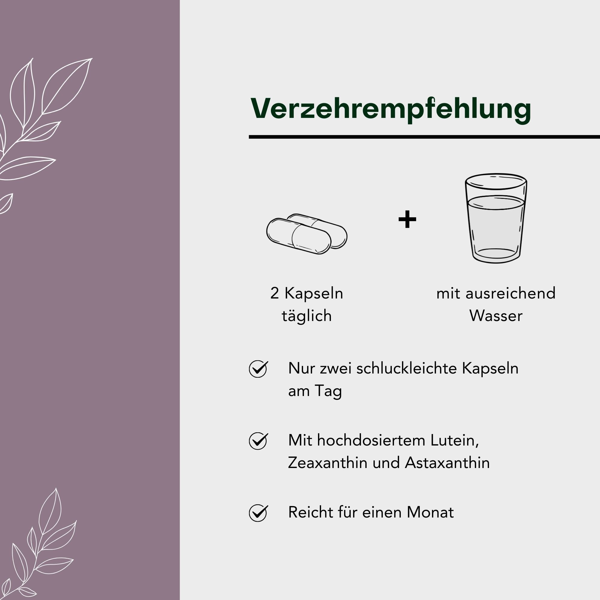 - Nahrungsergänzungsmittel mit einer fein abgestimmten 11-fach Kombination aus fermentiertem Grünkohl, der Omega-3-Fettsäure DHA aus Algenöl, Citicolin, Zeaxanthin und Lutein aus Ringelblumen, Astaxanthin aus Blutregenalgen und Vitaminen