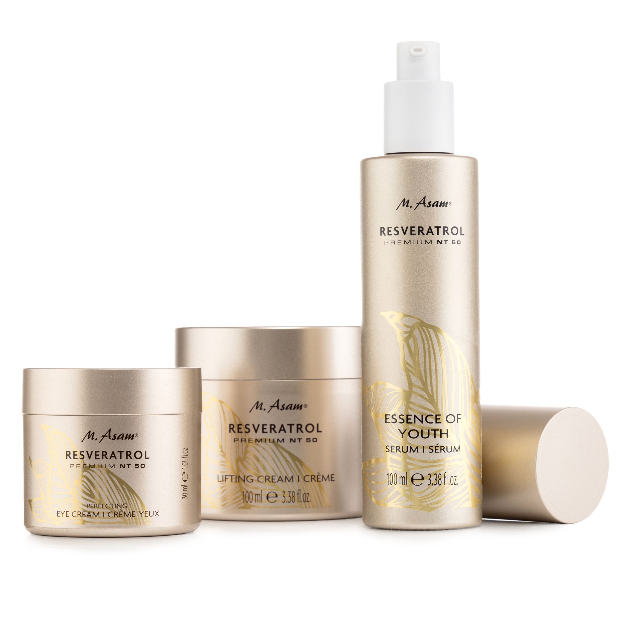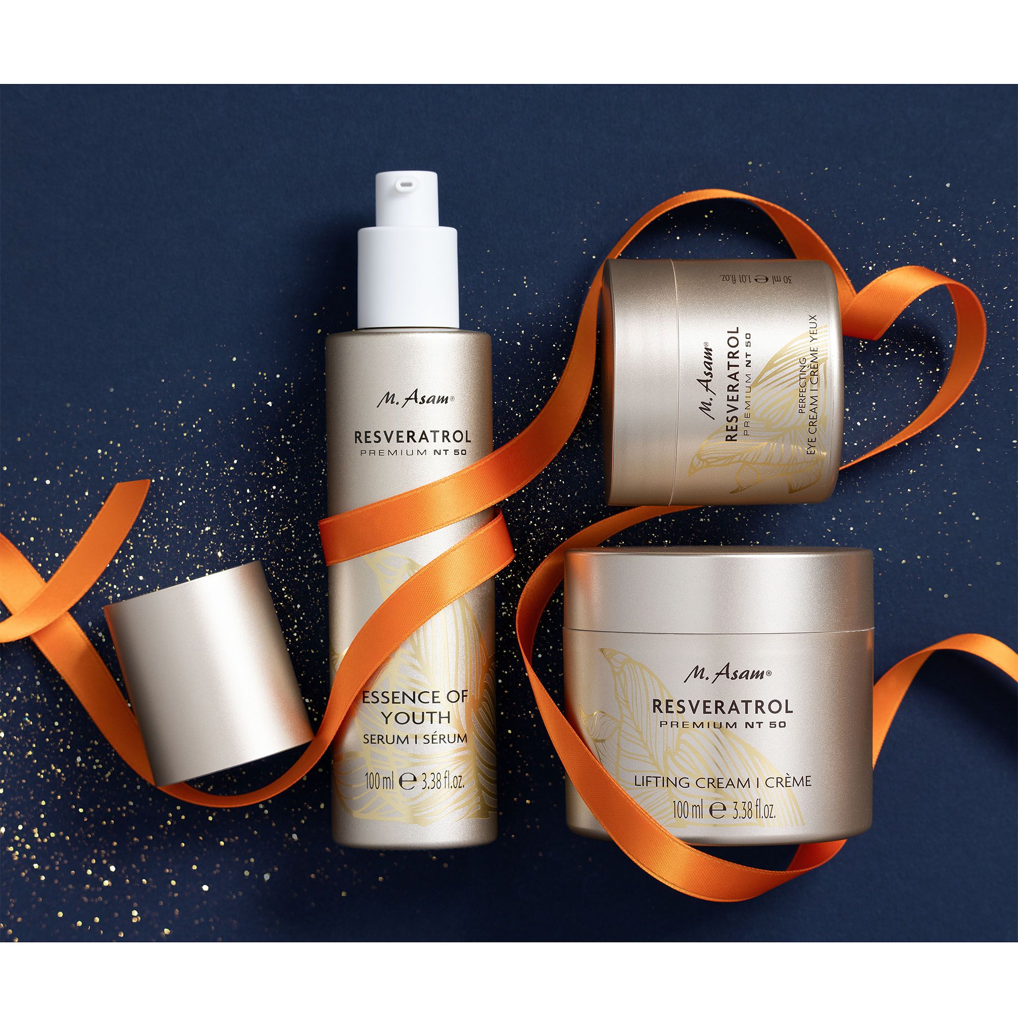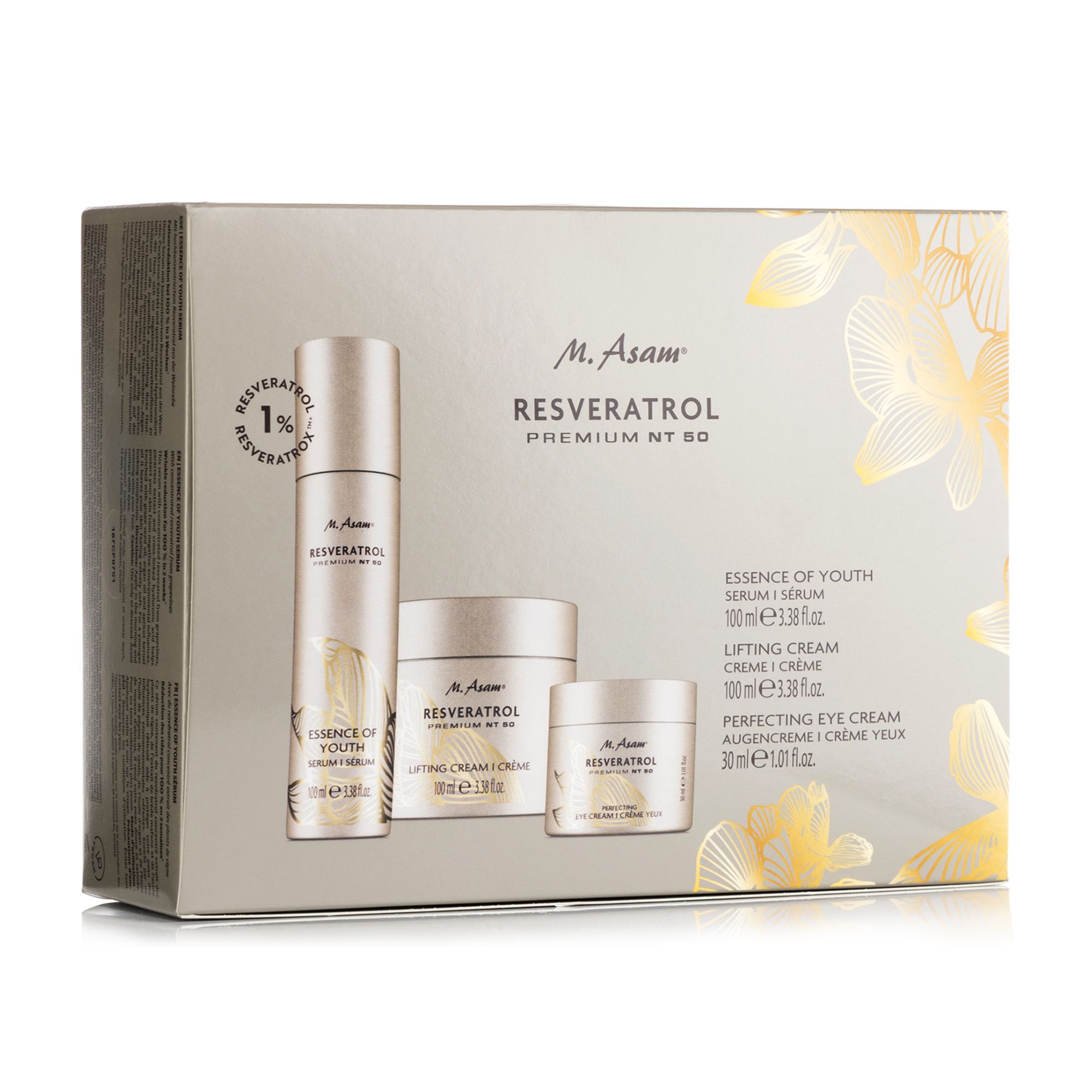 Das M. ASAM® Resveratrol Premium NT 50 Premiumkosmetik-Set vereint drei hochwertige Pflegeprodukte in einer edlen Geschenkschachtel mit goldenem Blütendesign – ideal als Geschenk oder zum Verwöhnen der eigenen Haut. Die Kombination aus Lifting Cream, Essence of Youth und Perfecting Eye Cream nutzt die innovative NT 50-Technologie, um Resveratrol wirksam in die Haut zu transportieren. Für eine strahlend schöne Haut!
