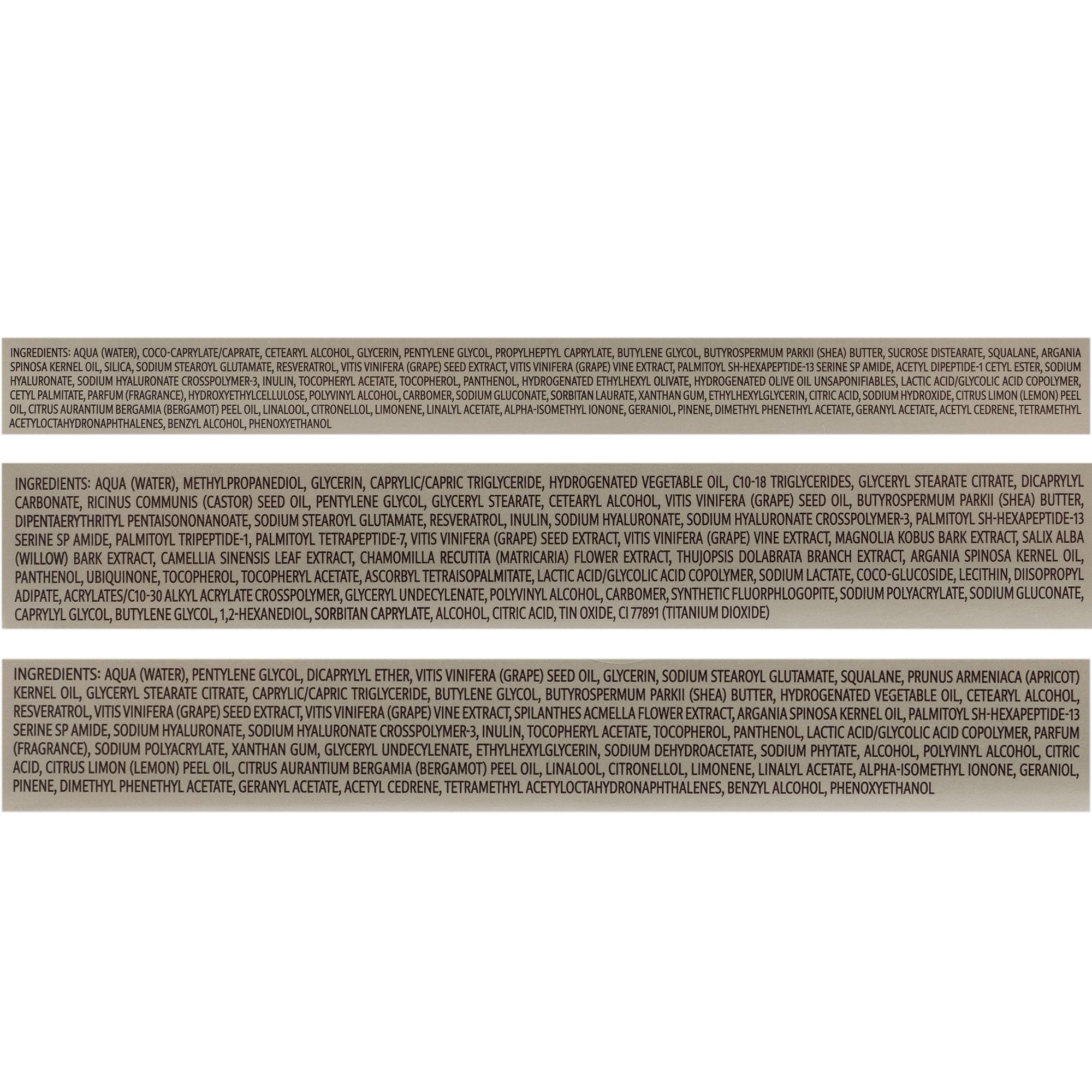 Lifting Creme: Aqua (Water), Coco Caprylate/Caprate, Cetearyl Alcohol, Glycerin, Pentylene Glycol, Propylheptyl Caprylate, Butylene Glycol, Butyrospermum Parkii (Shea) Butter, Sucrose Distearate, Squalane, Argania Spinosa Kernel Oil, Silica, Sodium Stearoyl Glutamate, Resveratrol, Vitis Vinifera (Grape) Seed Extract, Vitis Vinifera (Grape) Vine Extract, Palmitoyl Sh Hexapeptide 13 Serine Sp Amide, Acetyl Dipeptide 1 Cetyl Ester, Sodium Hyaluronate, Sodium Hyaluronate Crosspolymer 3, Inulin, Tocopheryl Acetate, Tocopherol, Panthenol, Hydrogenated Ethylhexyl Olivate, Hydrogenated Olive Oil Unsaponifiables, Lactic Acid/Glycolic Acid Copolymer, Cetyl Palmitate, Parfum (Fragrance), Hydroxyethylcellulose, Polyvinyl Alcohol, Carbomer, Sodium Gluconate, Sorbitan Laurate, Xanthan Gum, Ethylhexylglycerin, Citric Acid, Sodium Hydroxide, Citrus Limon (Lemon) Peel Oil, Citrus Aurantium Bergamia (Bergamot) Peel Oil, Linalool, Citronellol, Limonene, Linalyl Acetate, Alpha Isomethyl Ionone, Geraniol, Pinene, Dimethyl Phenethyl Acetate, Geranyl Acetate, Acetyl Cedrene, Tetramethyl Acetyloctahydronaphthalenes, Benzyl Alcohol, Phenoxyethanol