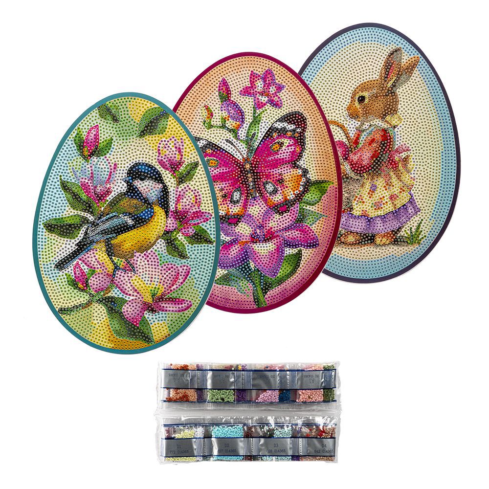 6 Diamond-Painting-Aufleger in Eiform, 2 x 3 verschiedene Designs & Größen (Schmetterling: 26,6 x 19,7 cm / Hase: 25,3 x 18,5 cm / Kohlmeise: 24,1 x 17,3 cm), 300g/m², vollflächig klebend