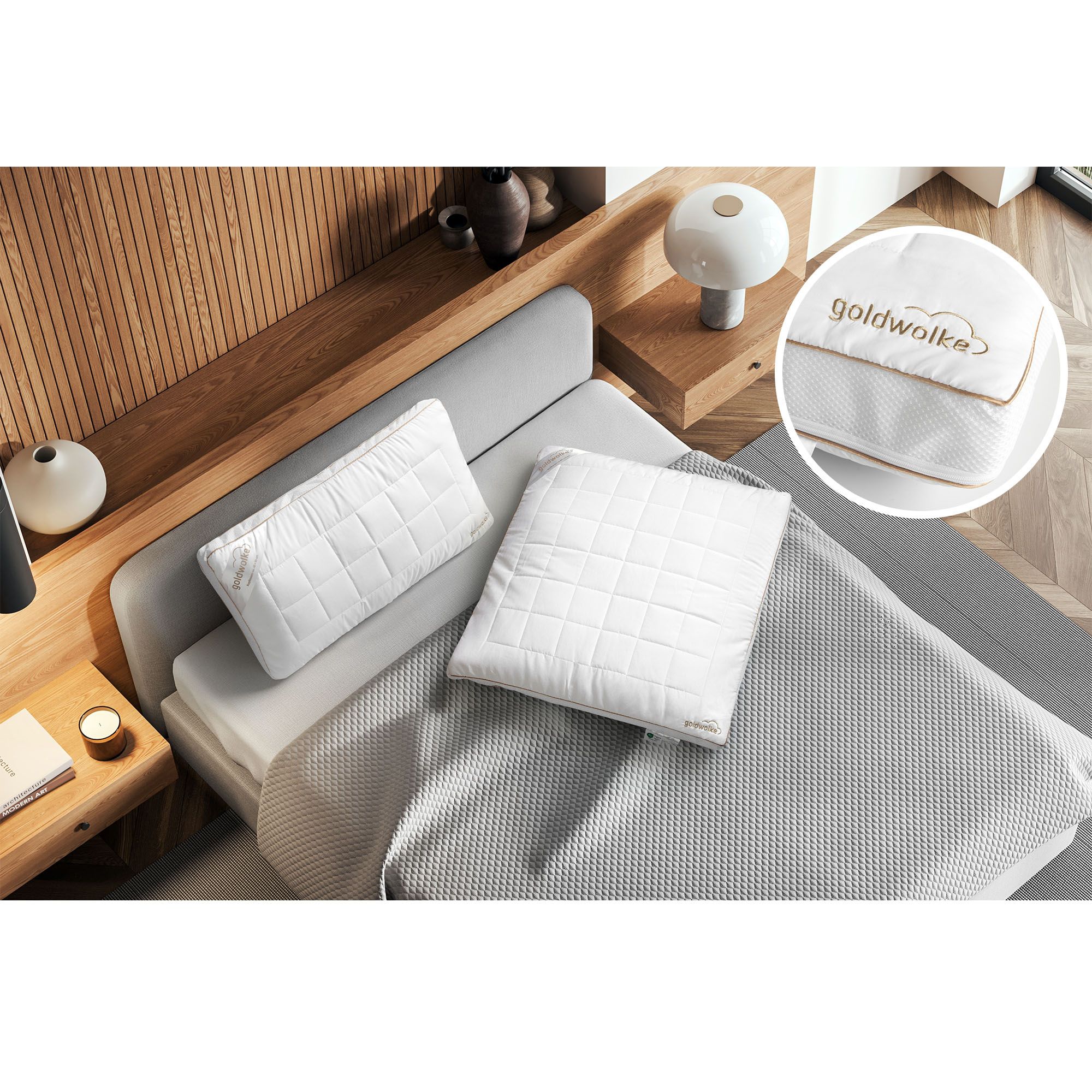 Das GOLDWOLKE Kissen vereint innovative Materialien und durchdachtes Design für höchsten Schlafkomfort. Die Kombination aus einer gesteppten Mikrofaserhülle, der beliebten GOLDWOLKE Standardfüllung und herausnehmbaren Memory-Foam-Einlegern ermöglicht eine individuelle Anpassung des Kissens, ideal für verschiedene Schlafbedürfnisse. Ob du das Kissen mit einem Einleger, beiden oder ohne nutzen möchtest, kannst du für jede Nacht neu entscheiden.