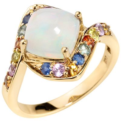 Der Croisé-Ring aus unserer „Afrikanischer Opal“ Schmuckkollektion besteht aus 585er poliertem Gold und präsentiert einen afrikanischen Opal im Kissenschliff in Krappenfassung. Außerdem ist der Ring mit 18 multicoloren Saphiren besetzt.