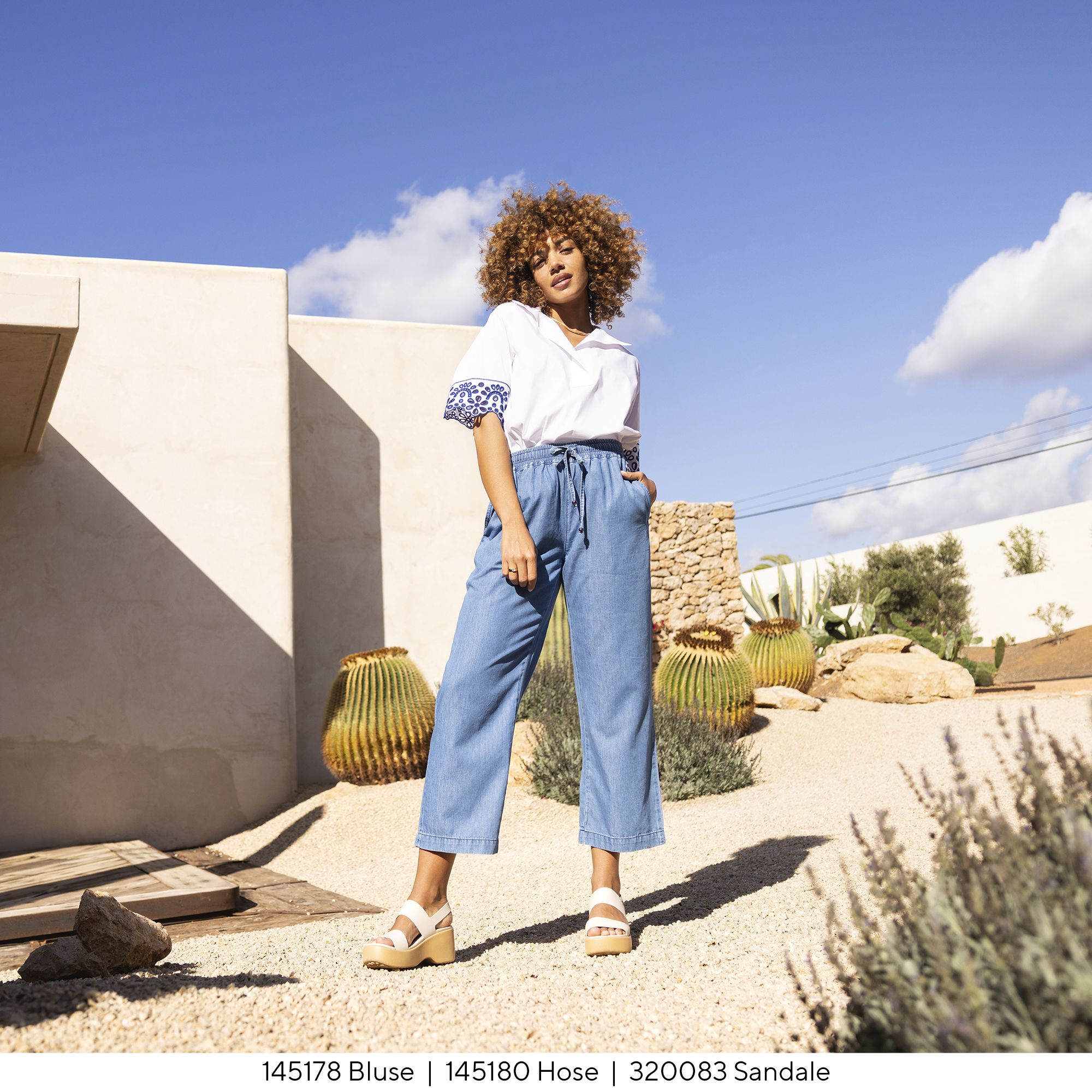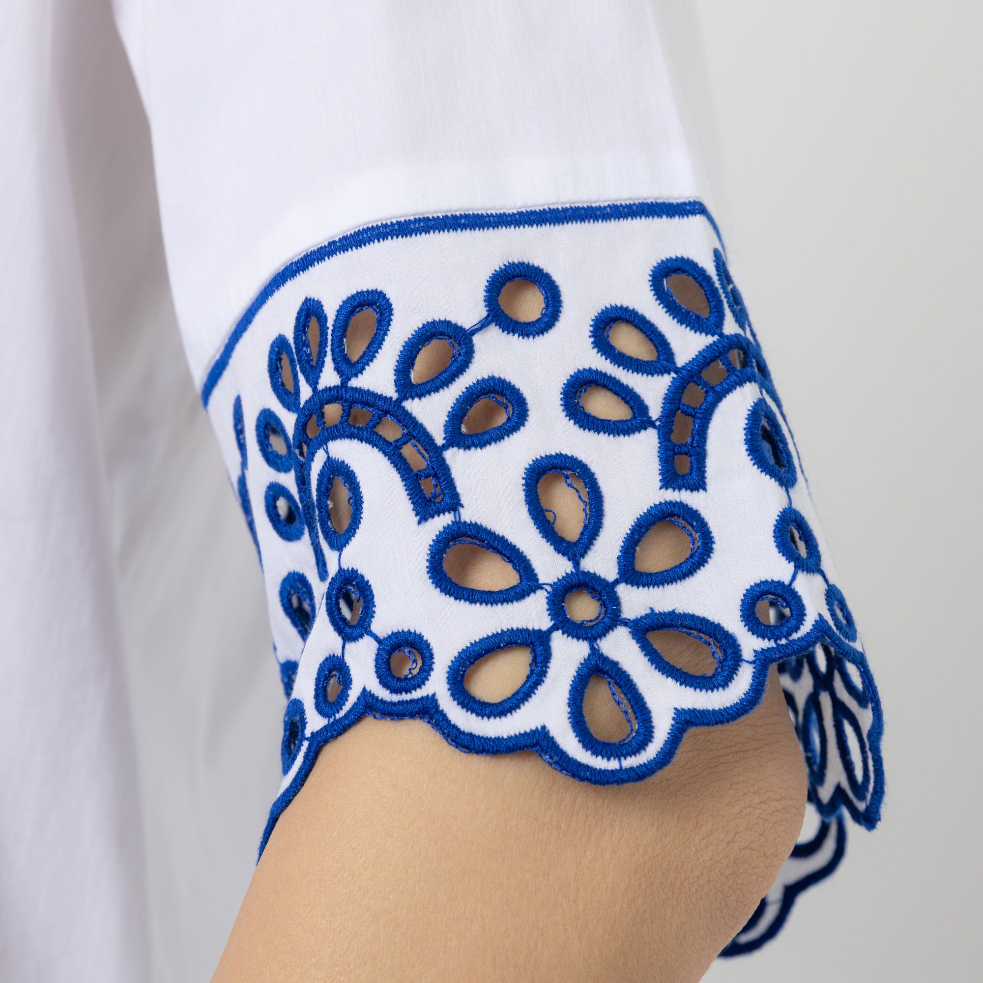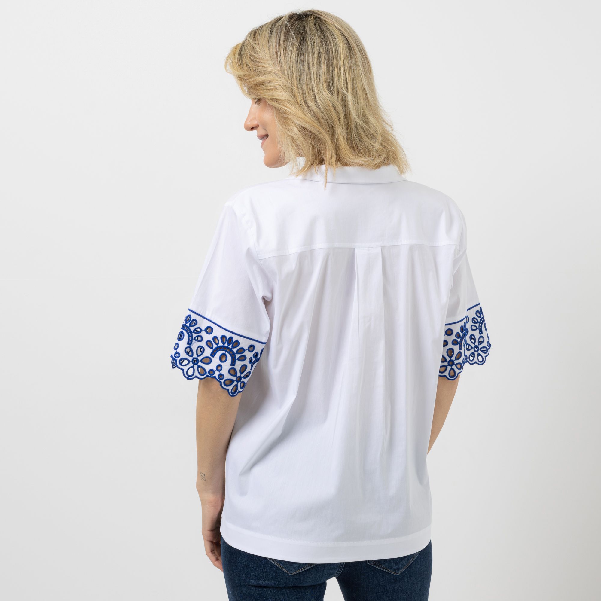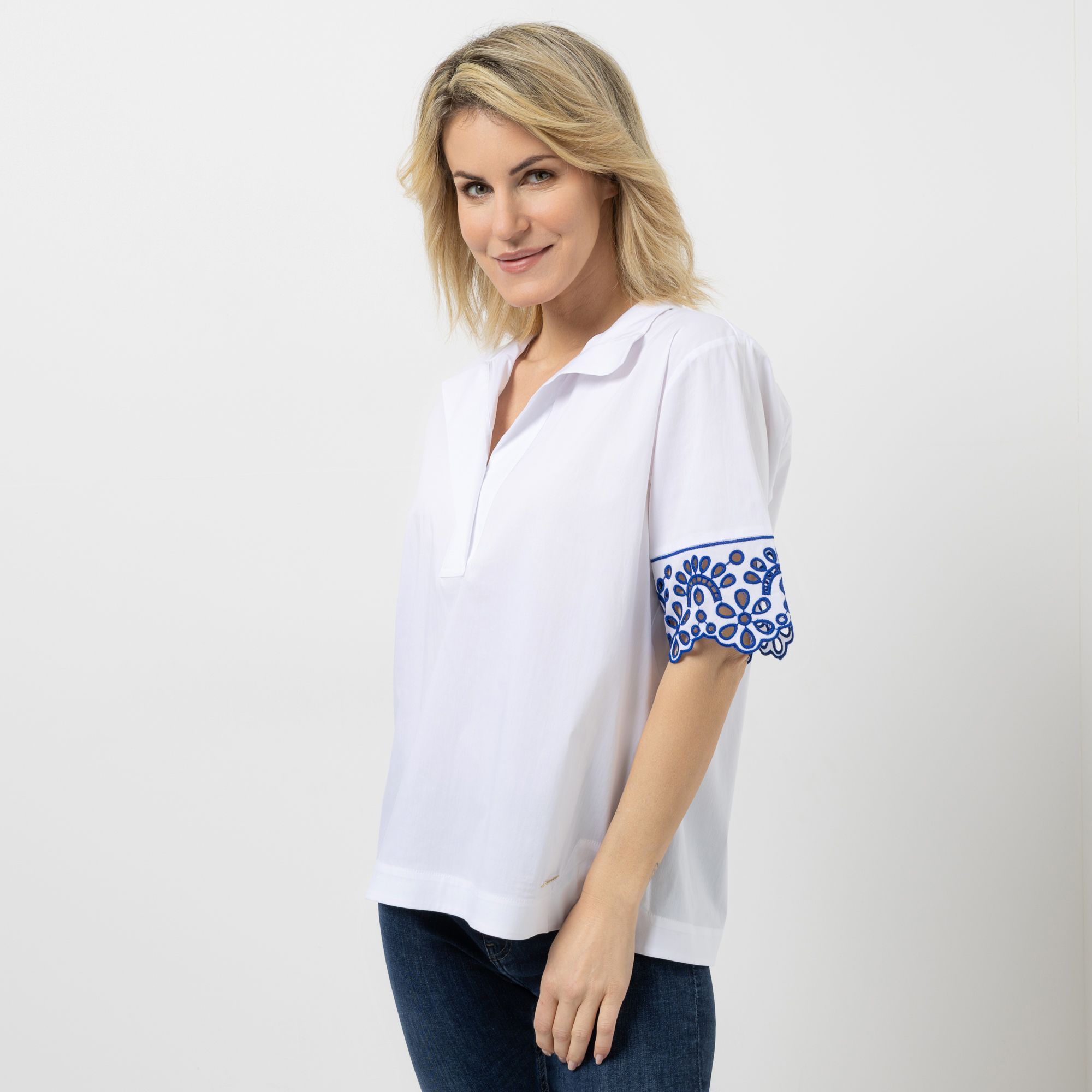 Mit der Bluse von AMINATI® holst du dir ein zeitloses und feminines Lieblingsstück in deinen Kleiderschrank, das durch bezaubernde Lochstickerei und praktische Details überzeugt.