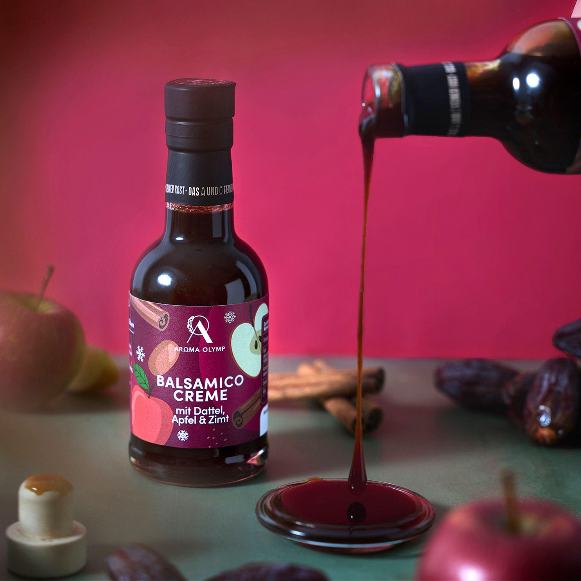 Die AROMA OLYMP Balsamico Creme mit Dattel, Apfel und Zimt vereint antike Inspiration und orientalische Raffinesse zu einem karamellig-warmen Genusserlebnis, das mit sonnengetrockneten Datteln und erntefrischen Äpfeln begeistert.