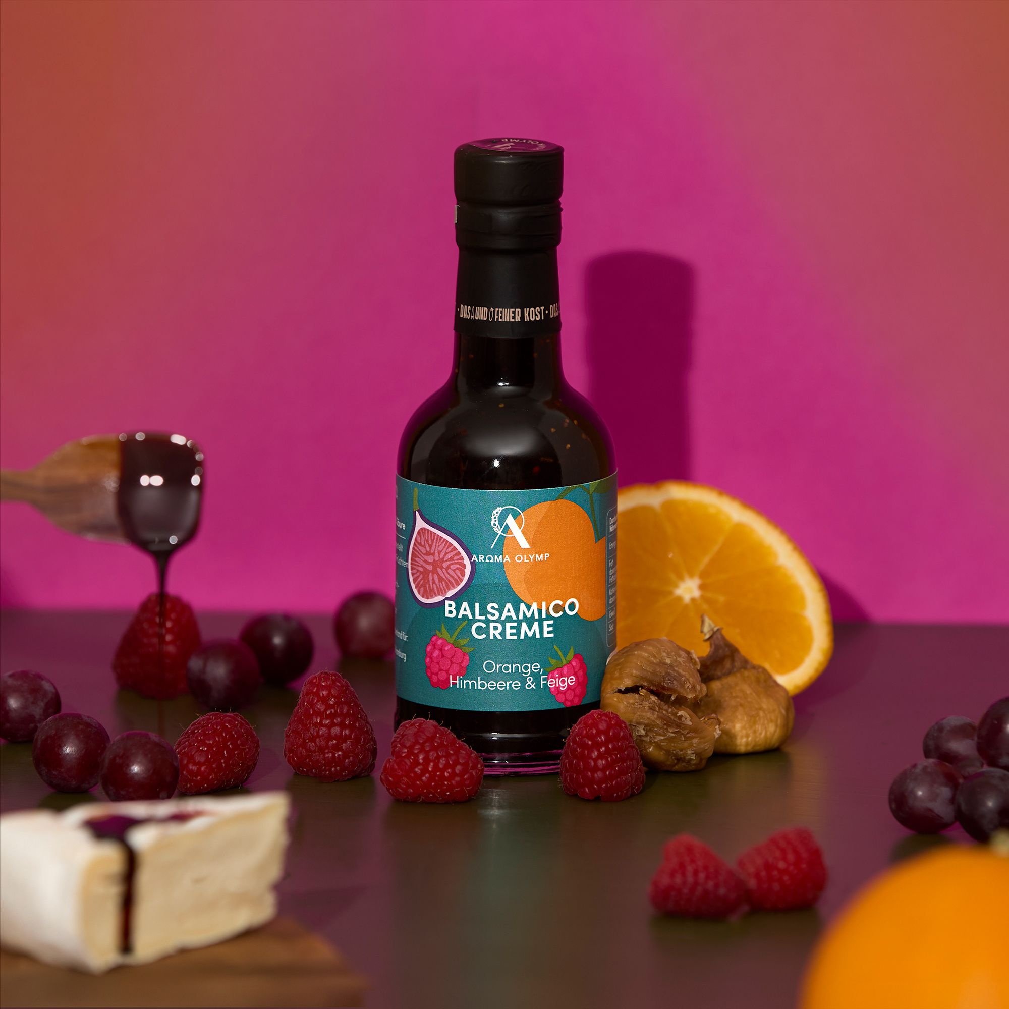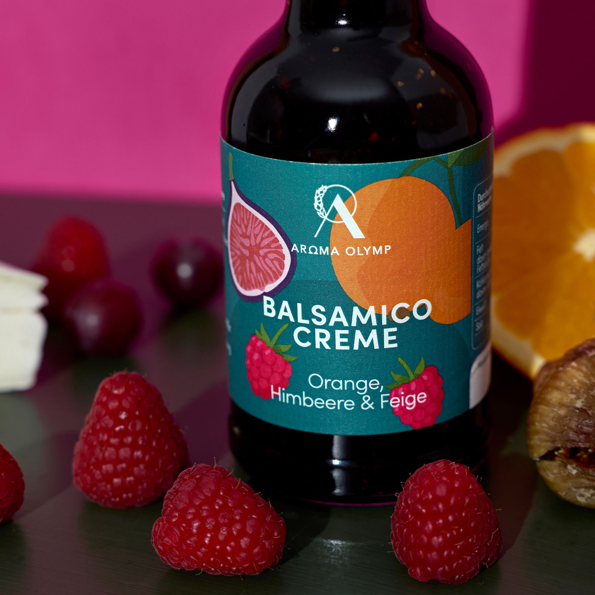 Genussmomente mit AROMA OLYMP: Auf Kreta entsteht diese besondere Balsamico Creme aus sonnengereiften Orangen, Himbeeren und Feigen, die mit ihrem aufregenden Aroma und ausgewogener Süße jede Kost veredelt.