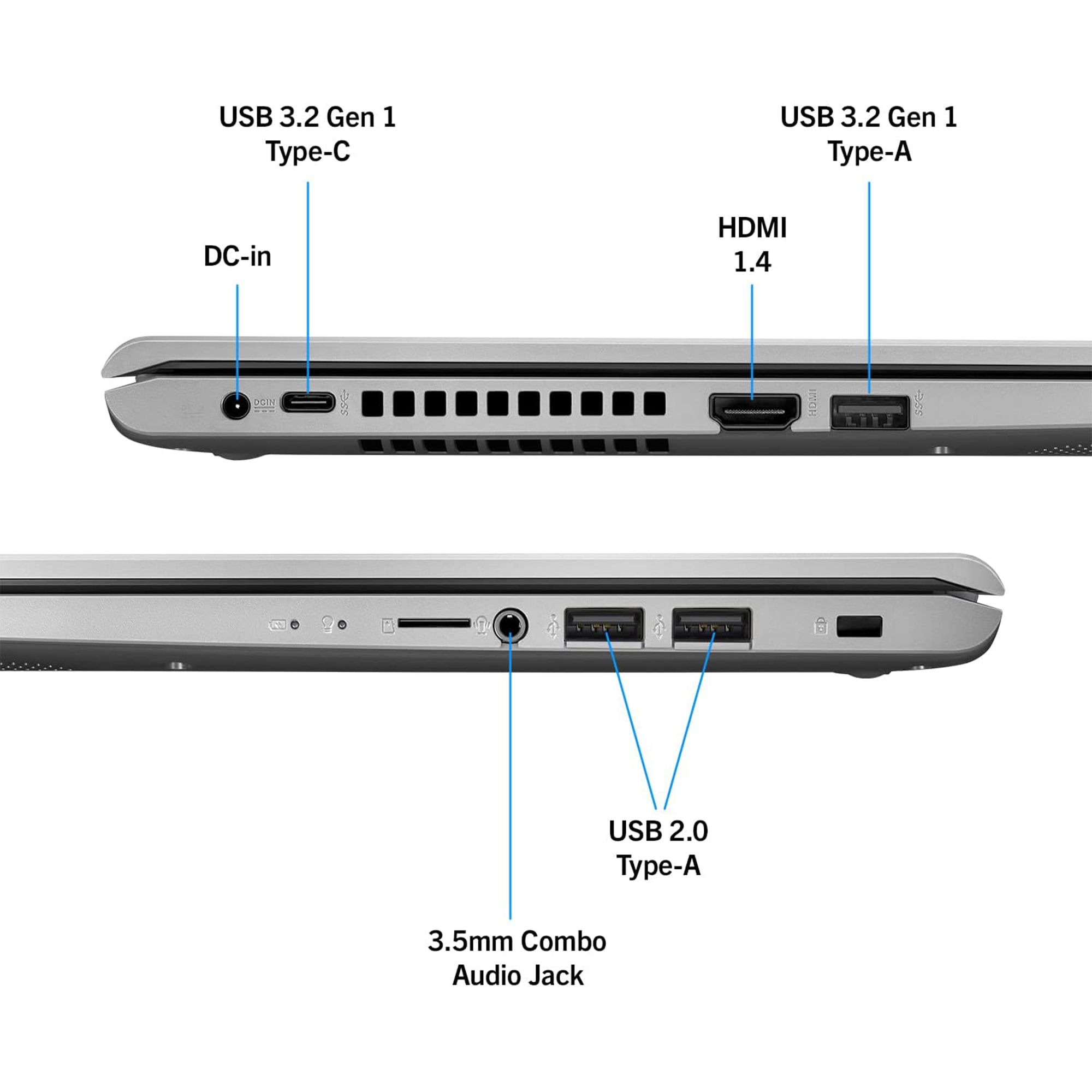 • USB-C 3.0 (5Gb/s), USB-A 3.0 (5Gb/s), 2 x USB-A 2.0 (480Mb/s), HDMI 1.4, 3,5 mm Klinke, Hohlbuchse (Netzanschluss)