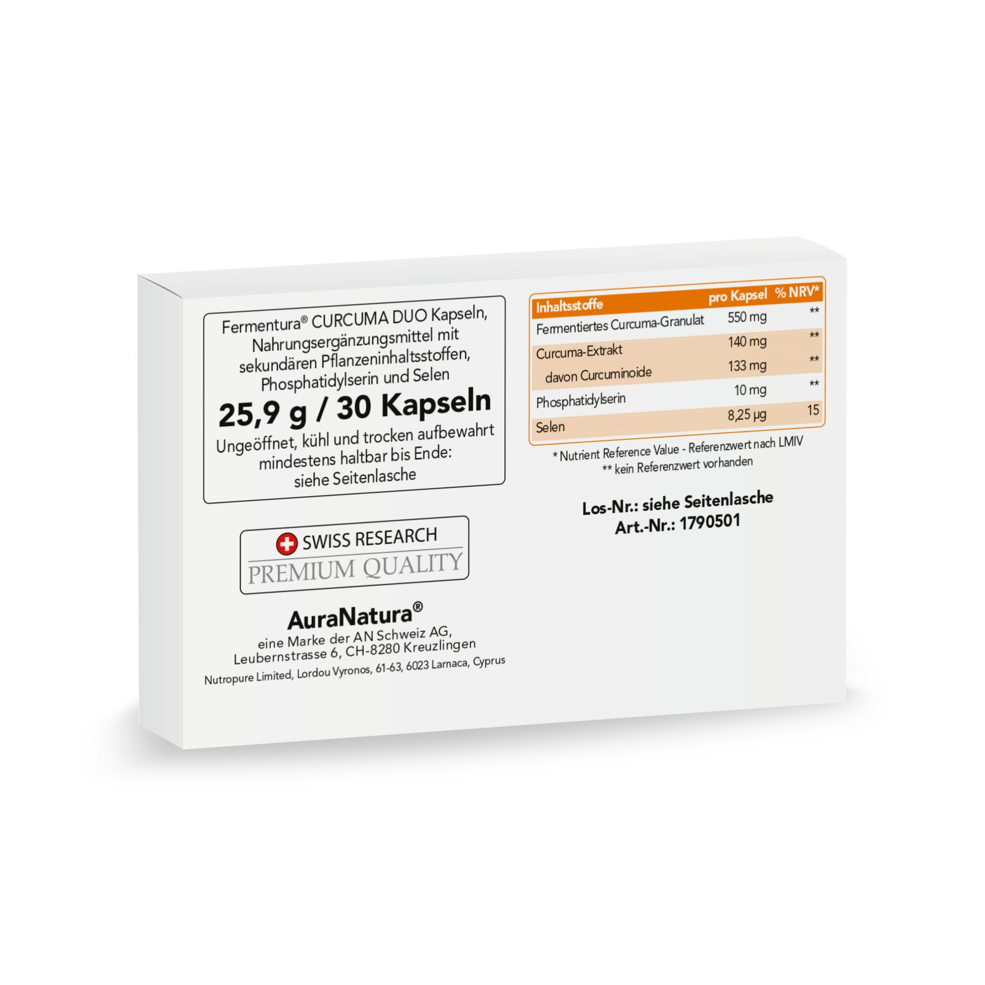 Fermentura® Curcuma Duo ist ein Nahrungsergänzungsmittel der Marke AuraNatura®. Es beinhaltet eine Kombination aus fermentierter Curcuma, Curcuma-Extrakt, Phosphatidylserin und Selen.