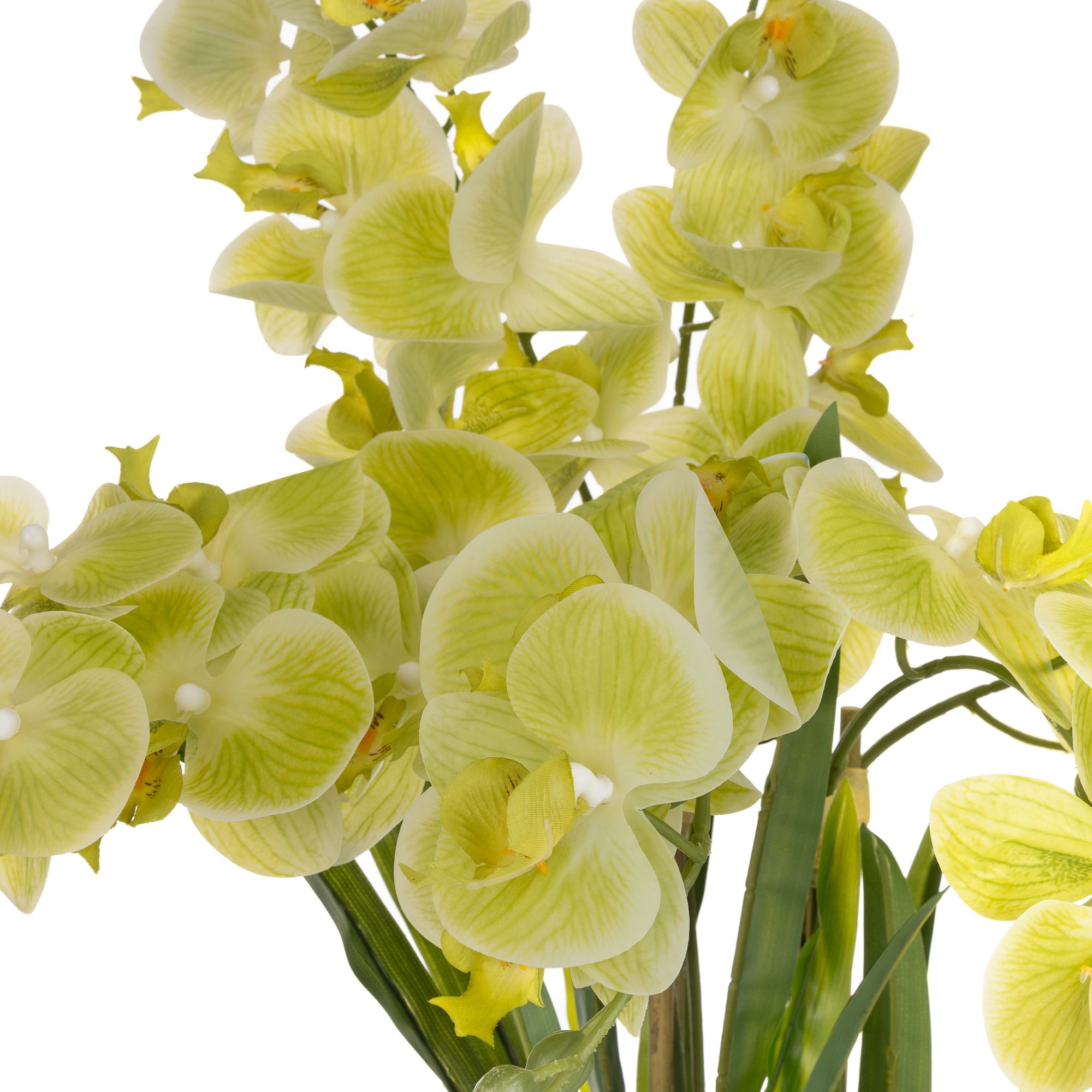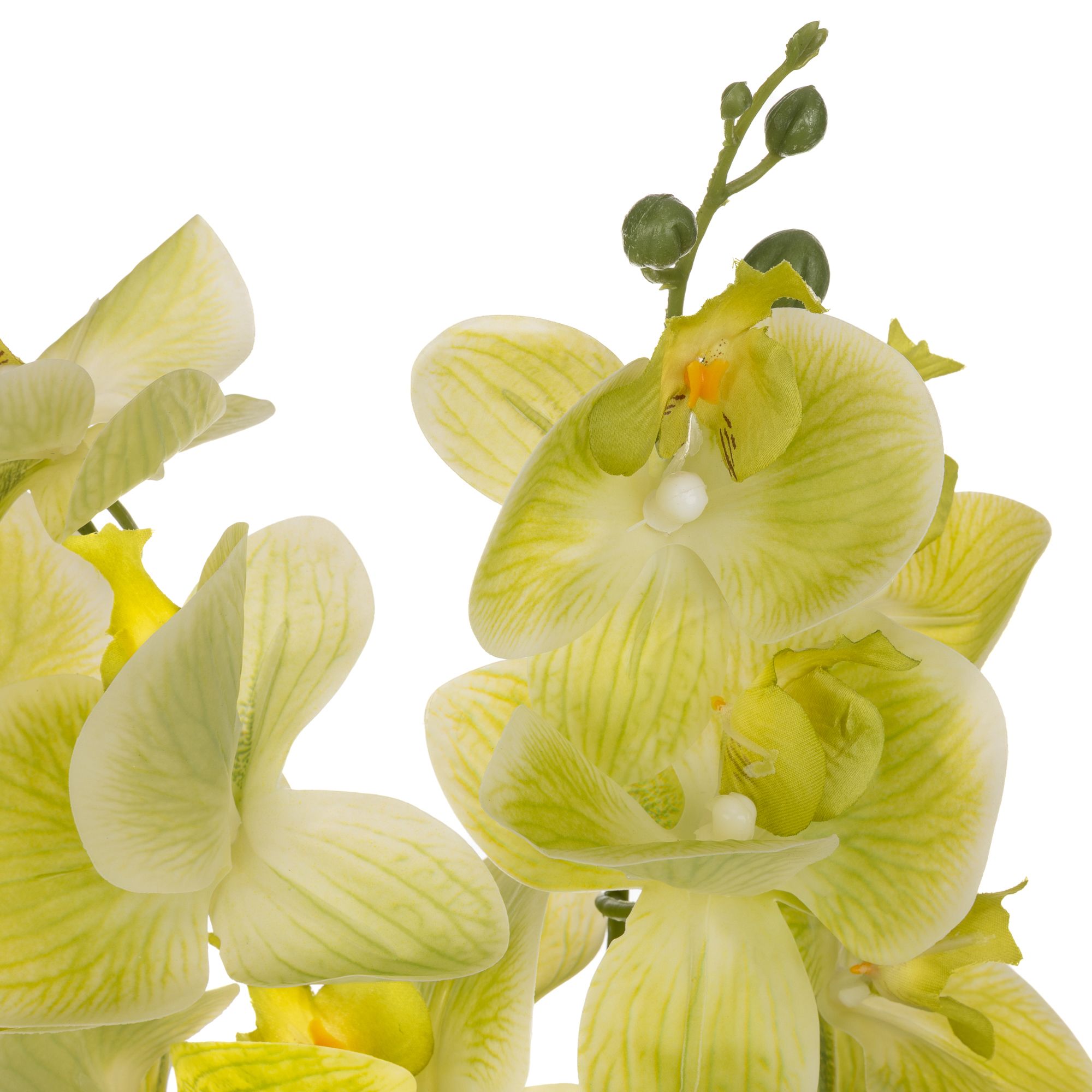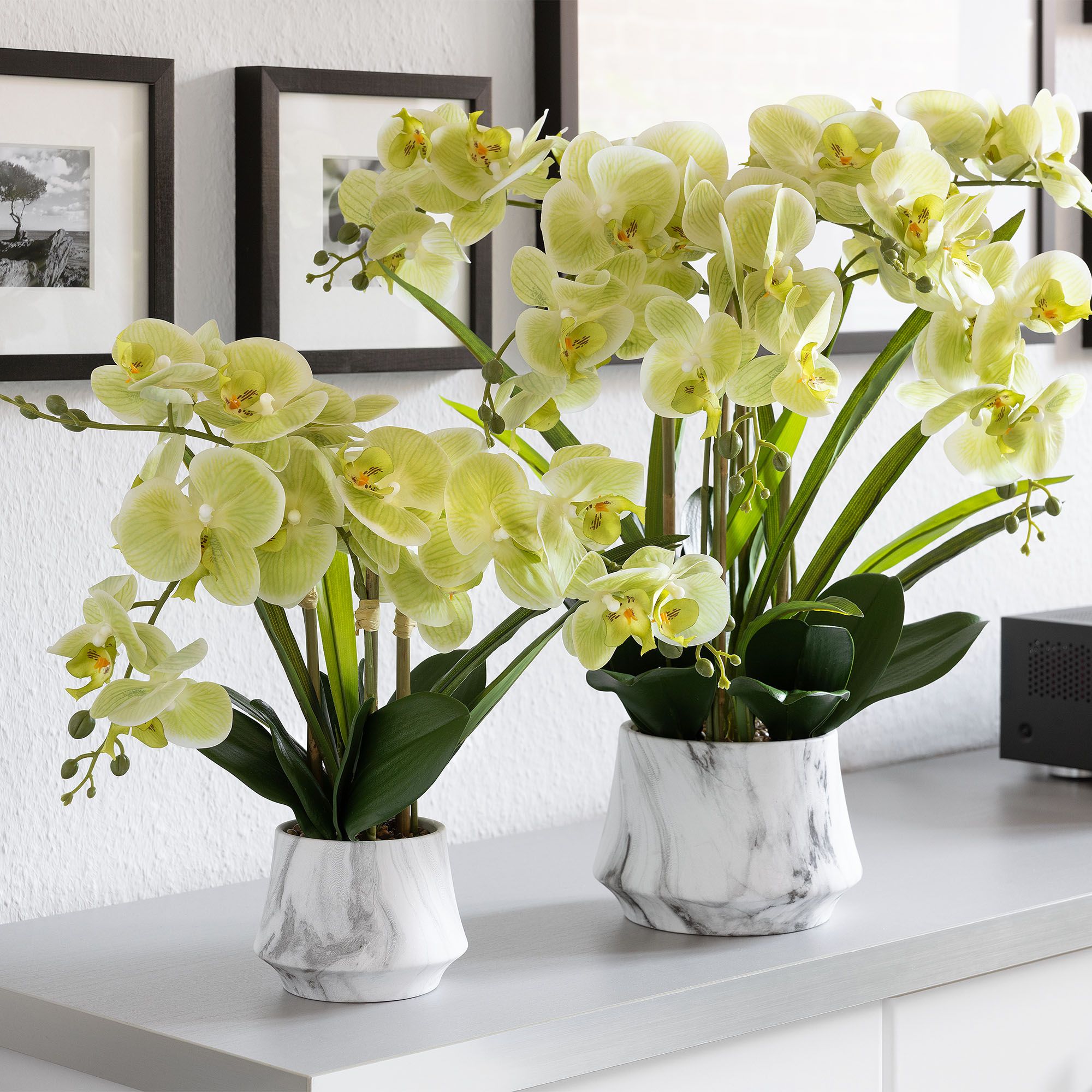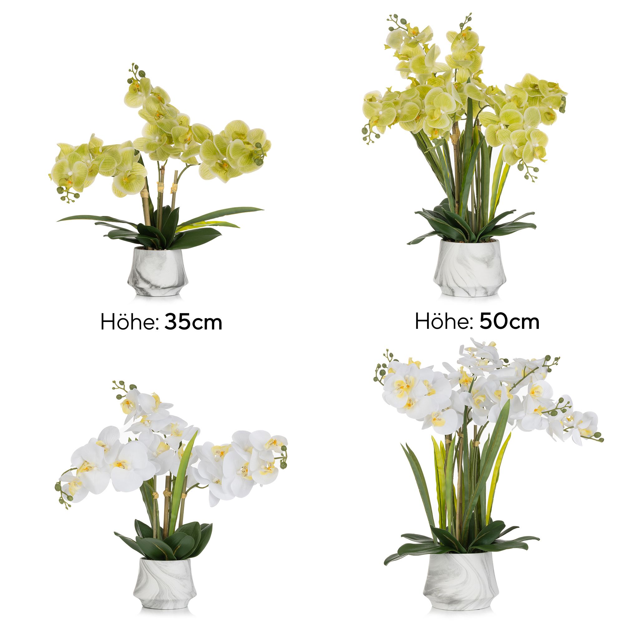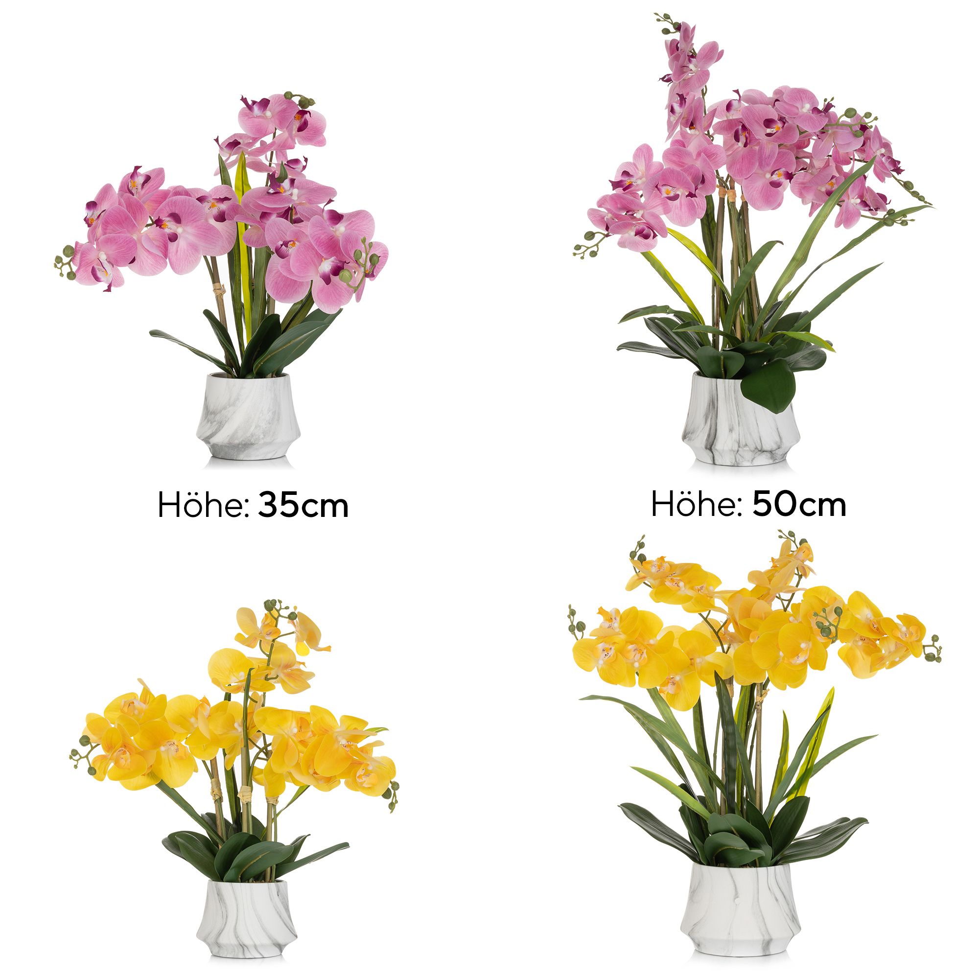 Die Orchidee gibt es in zwei Größen, 35 cm hoch mit 18 Blüten und 50 cm hoch mit 36 Blüten. Außerdem hast du die Wahl, ob du die Blüten in Gelb, Limette , Pink oder Weiß bevorzugst. Für welche Variante du dich auch entscheidest, die Orchidee steckt in einem hübschen Keramiktopf in Marmoroptik und ist damit sofort nach dem Auspacken ein herrlicher Blickfang, an dem du dich täglich neu erfreuen kannst.