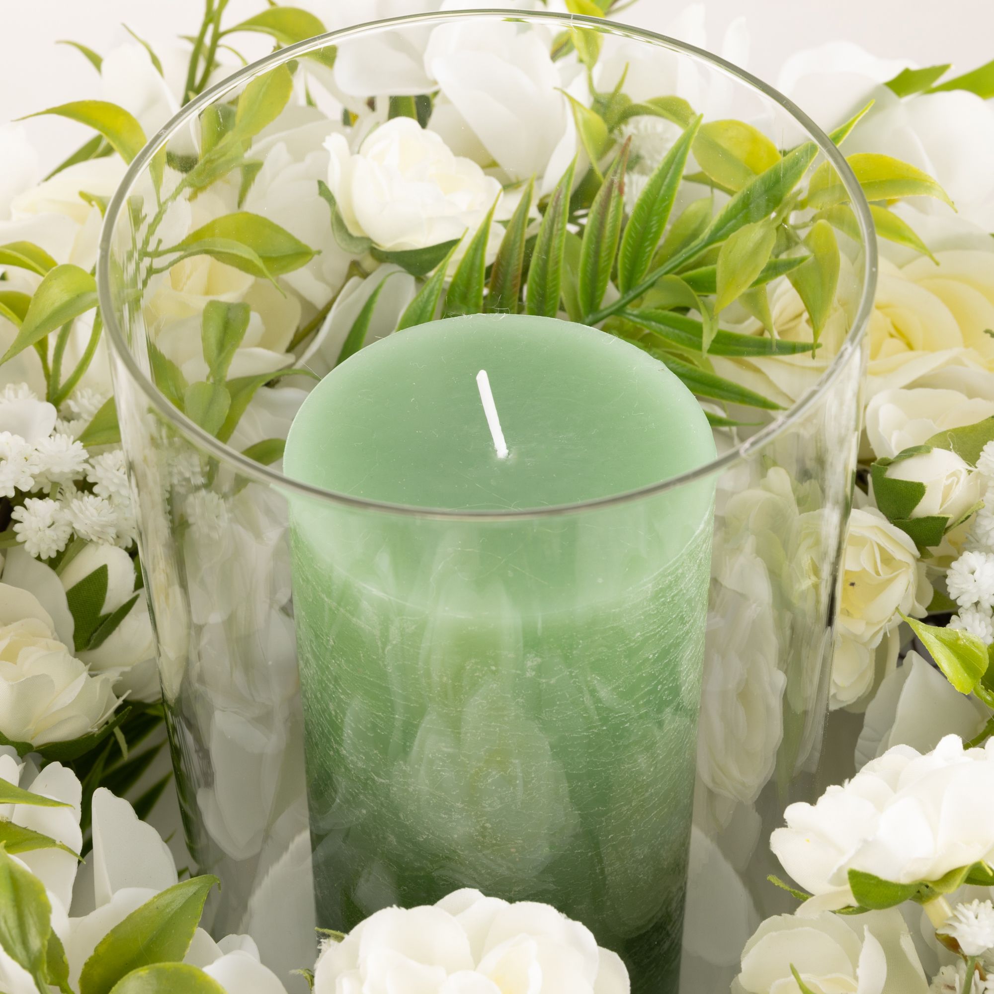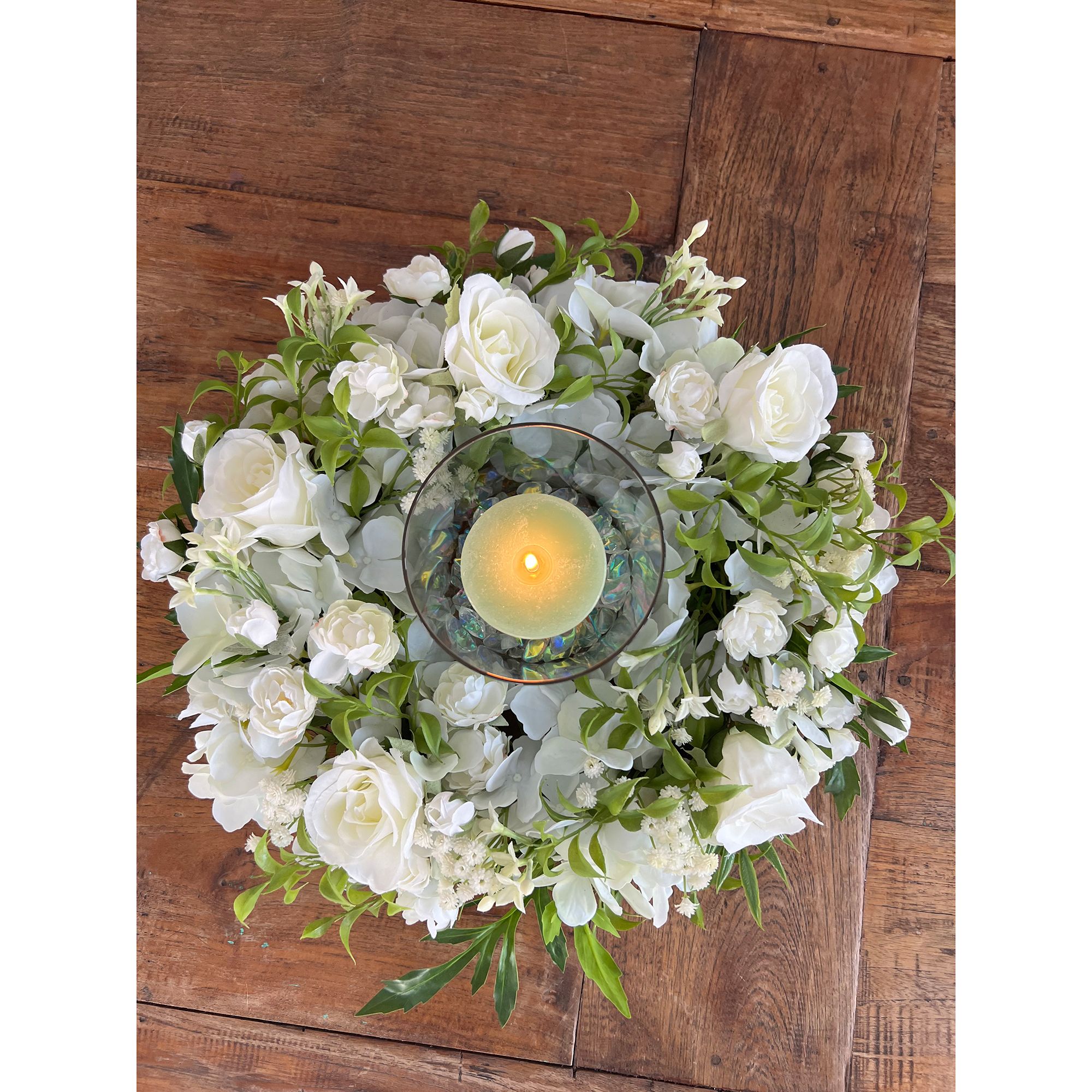 - Kranz besteht aus Textil- und Realtouchblüten und ist farblich auf die Kerzen abgestimmt