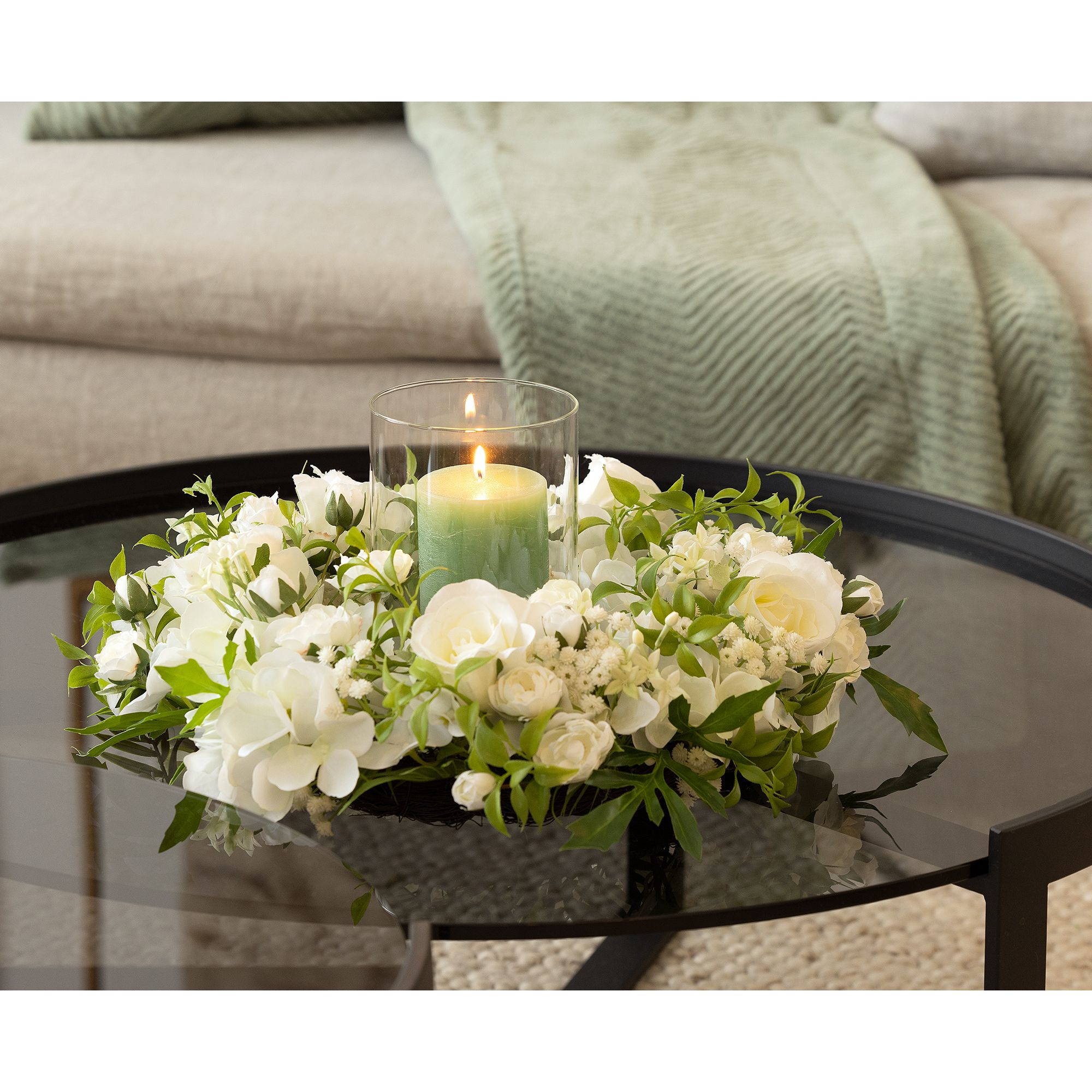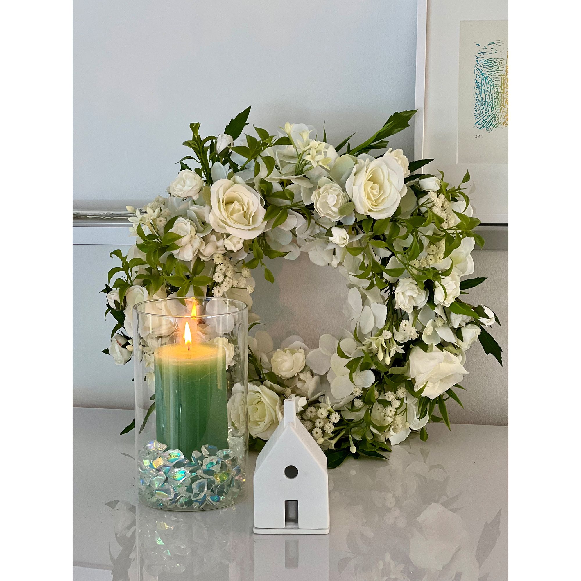 Dekokranz mit Windlicht und Kerze