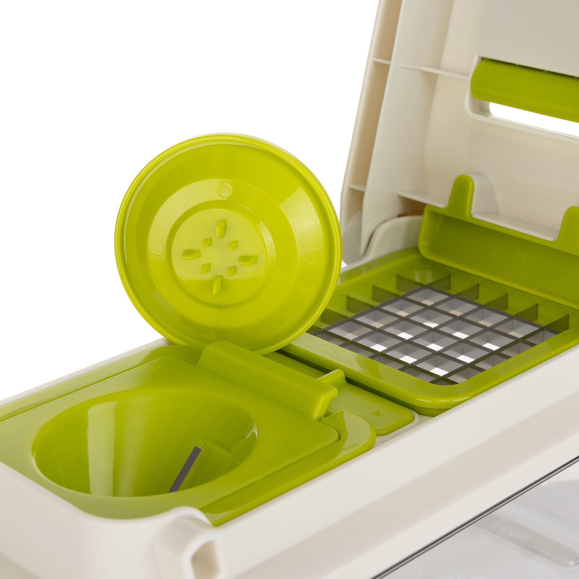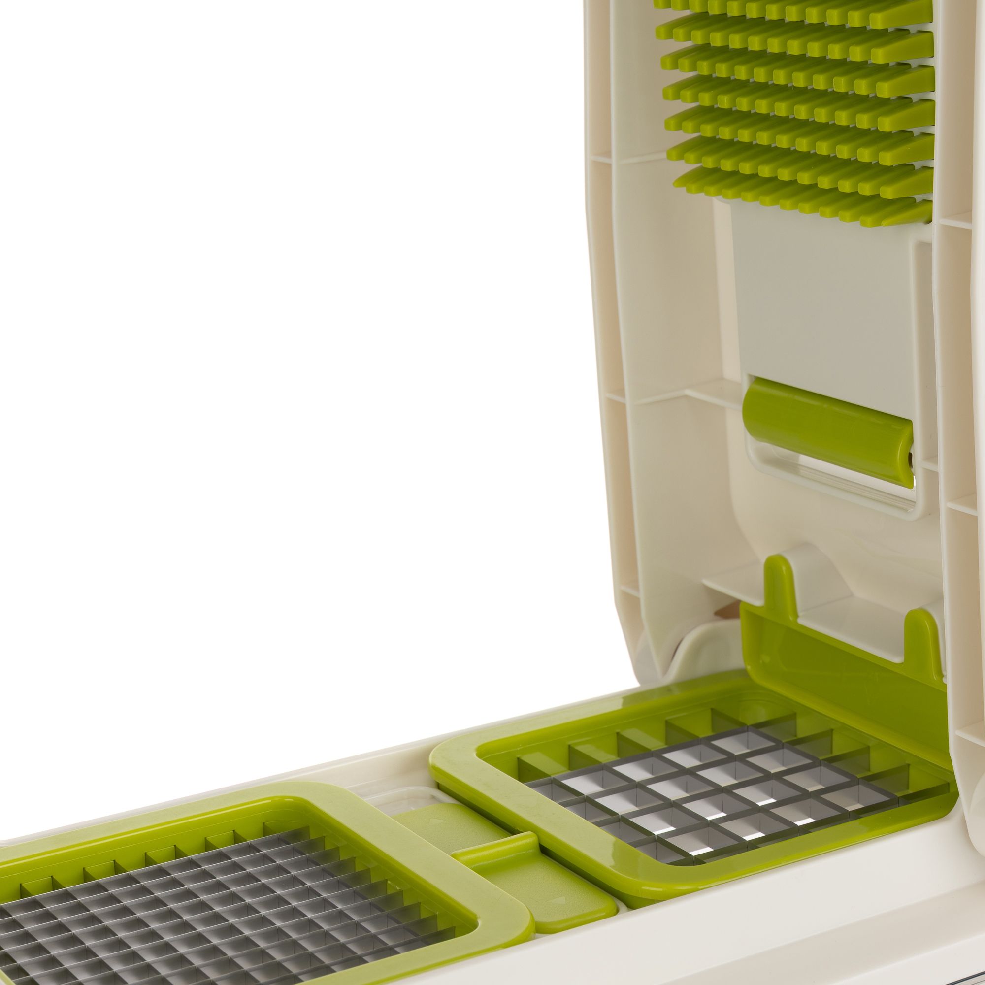 - 4 Klingen: 6,8-mm-Würfelschneider, 13,6-mm-Würfelschneider, feiner Julienne-Spiralschneider, Spiral-Scheiben-Spiralschneider
