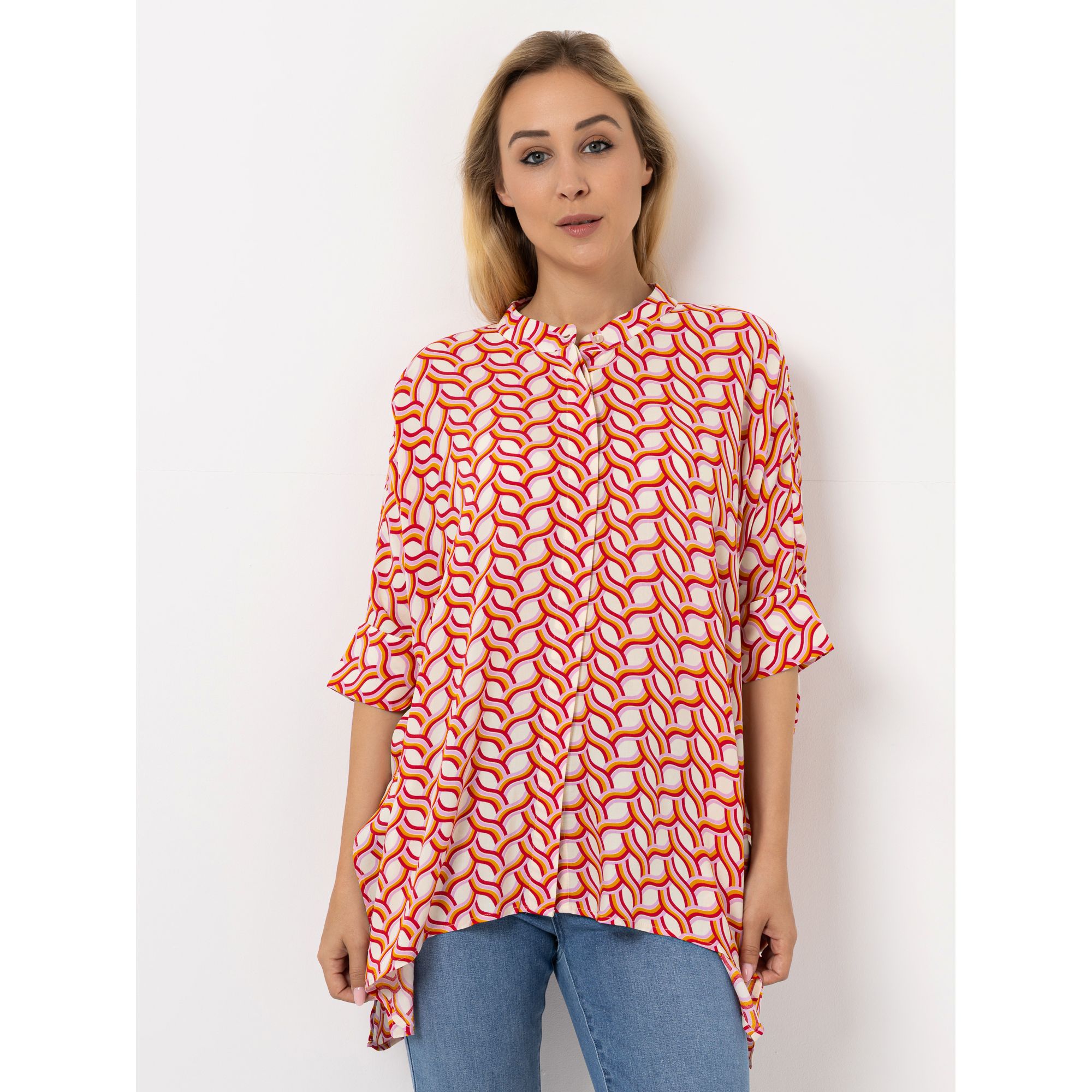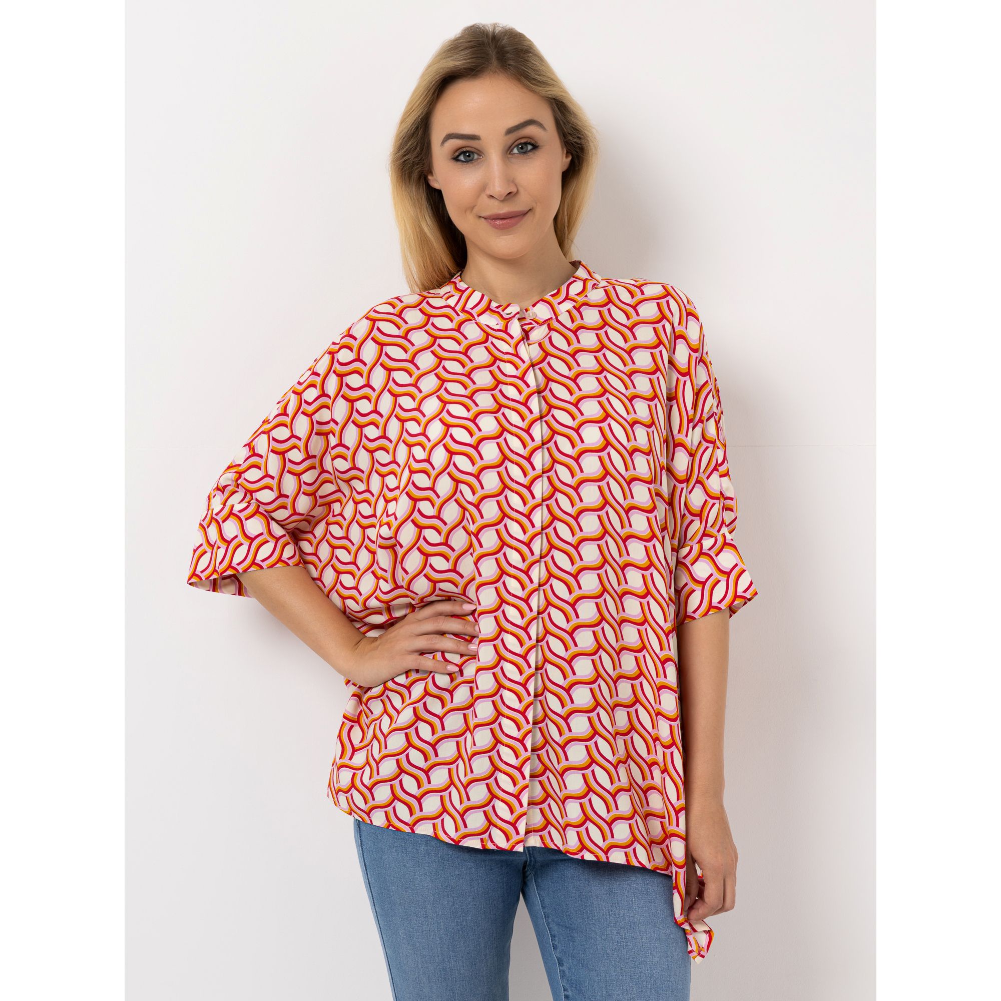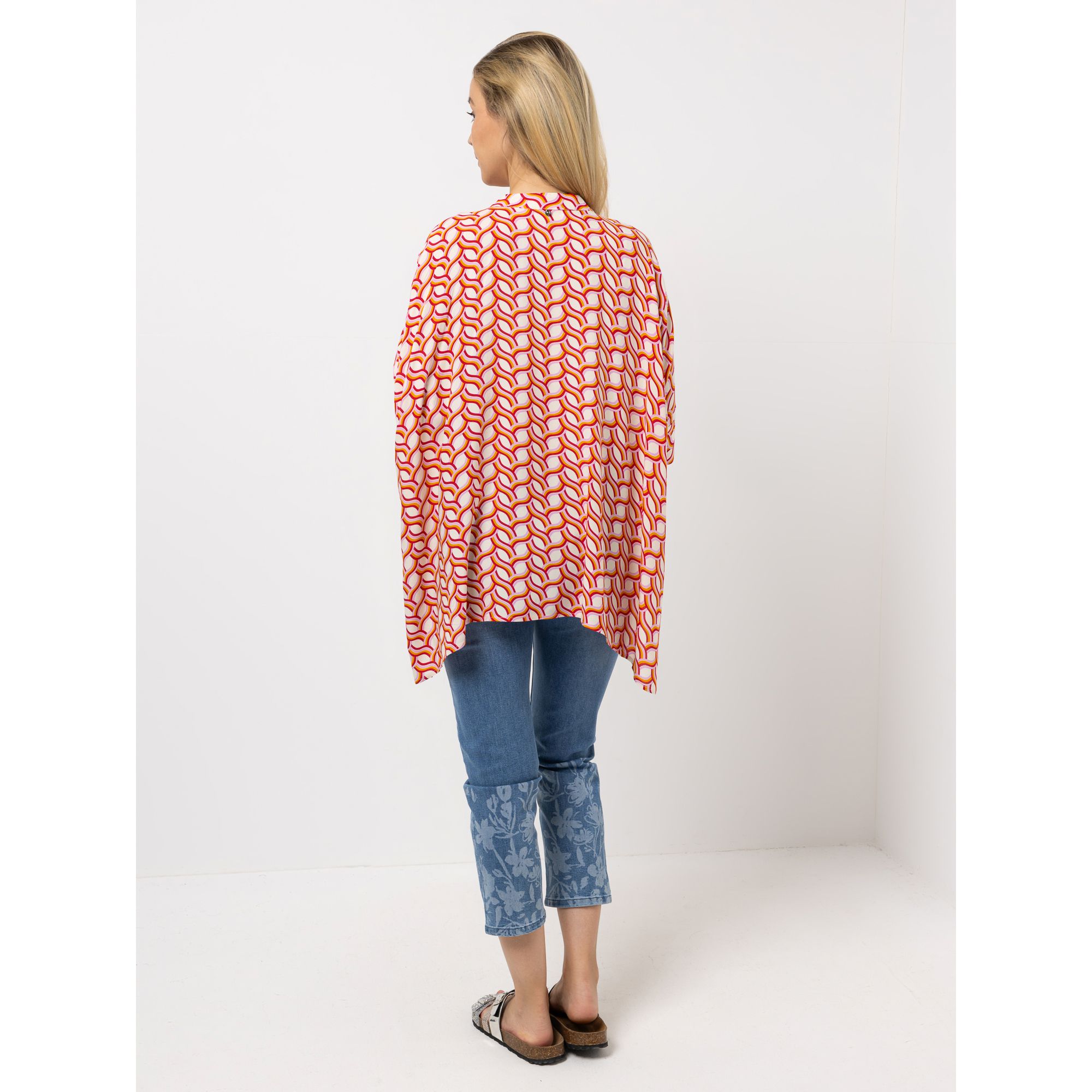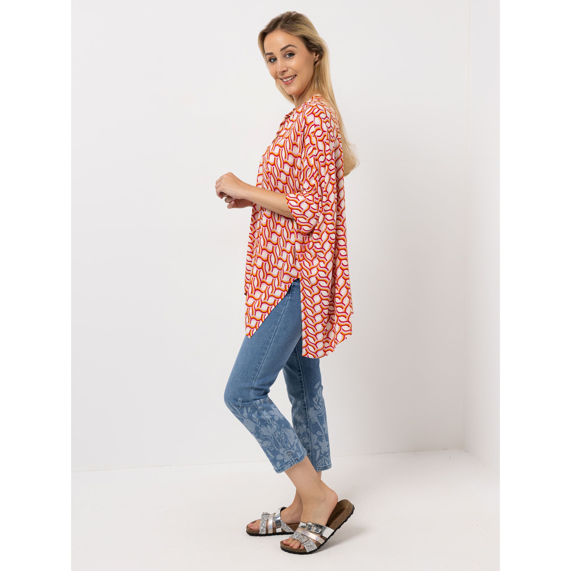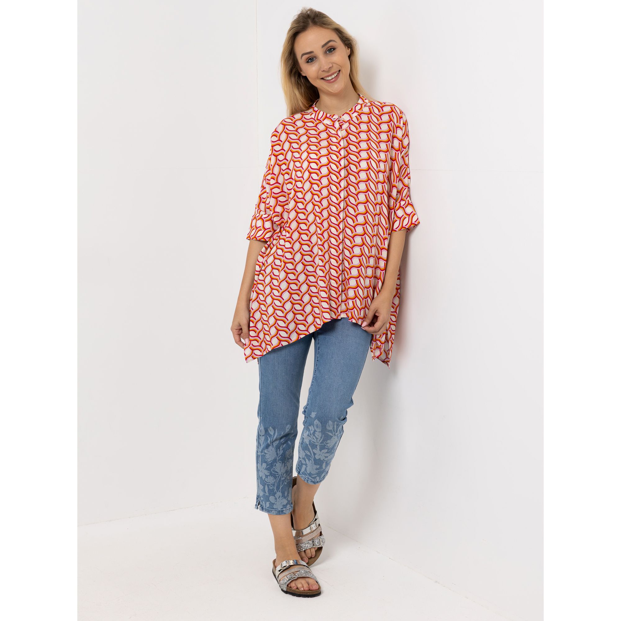 Die DINE 'N' DANCE Bluse mit ihrem fließenden Viskose-Stoff und korallfarbenen Muster ist perfekt für laue Sommerabende auf der Terrasse – leicht, luftig und stilvoll zugleich.