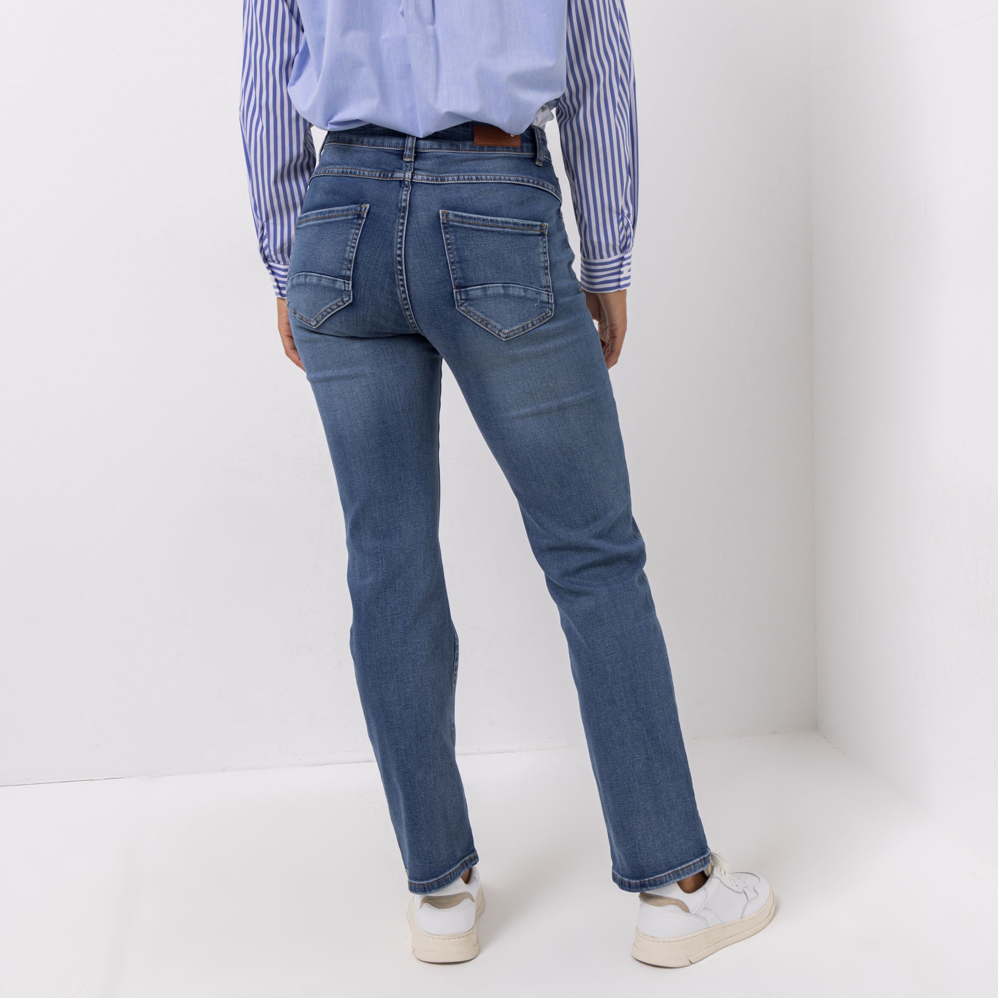 Die gelungene Kombination aus zeitlosem 5-Pocket-Design, geradem Bein und dem angesagten Used-Look macht die Hose zu einem flexiblen Allrounder in deinem Kleiderschrank. Genieße maximalen Tragekomfort durch die sehr elastische Ware und setze auf einen Style, der immer passt.