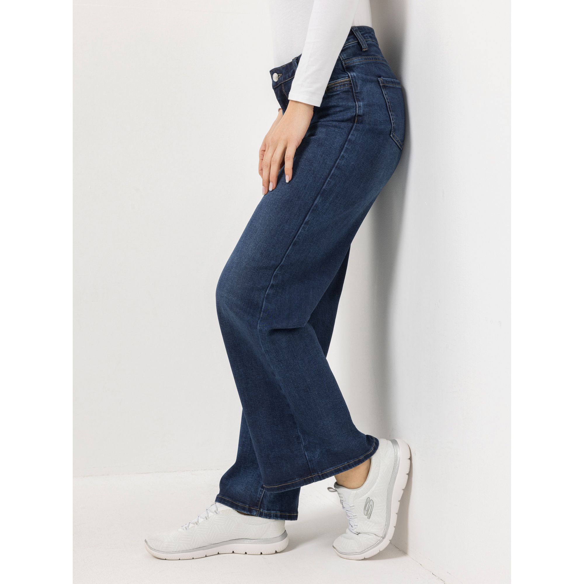 Der Allrounder als unverzichtbares Basic: Die EVA LUTZ Jeanshose in Dunkeljeansblau kommt im klassischen 5-Pocket-Stil mit Gürtelschlaufen, Knopf und Reißverschluss.