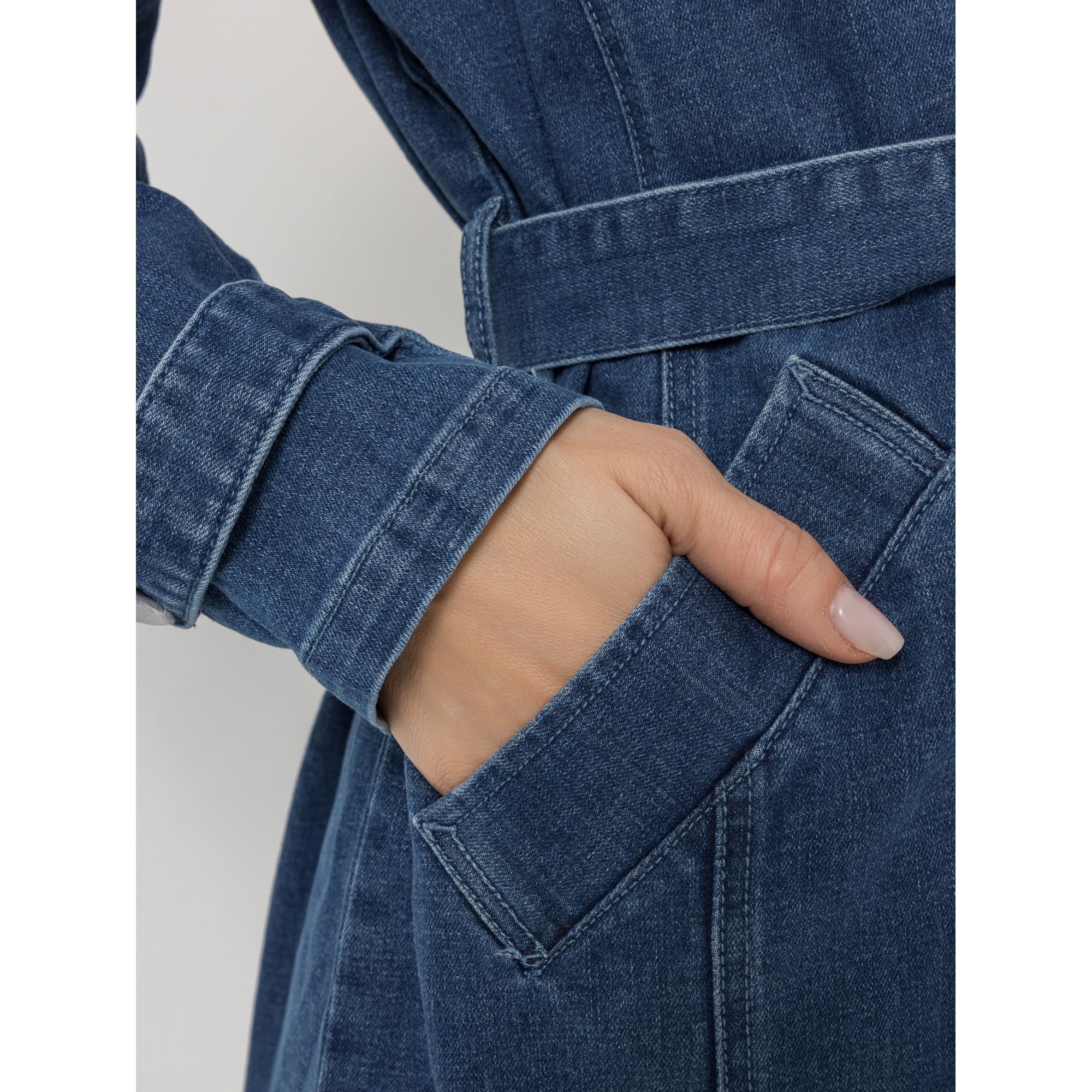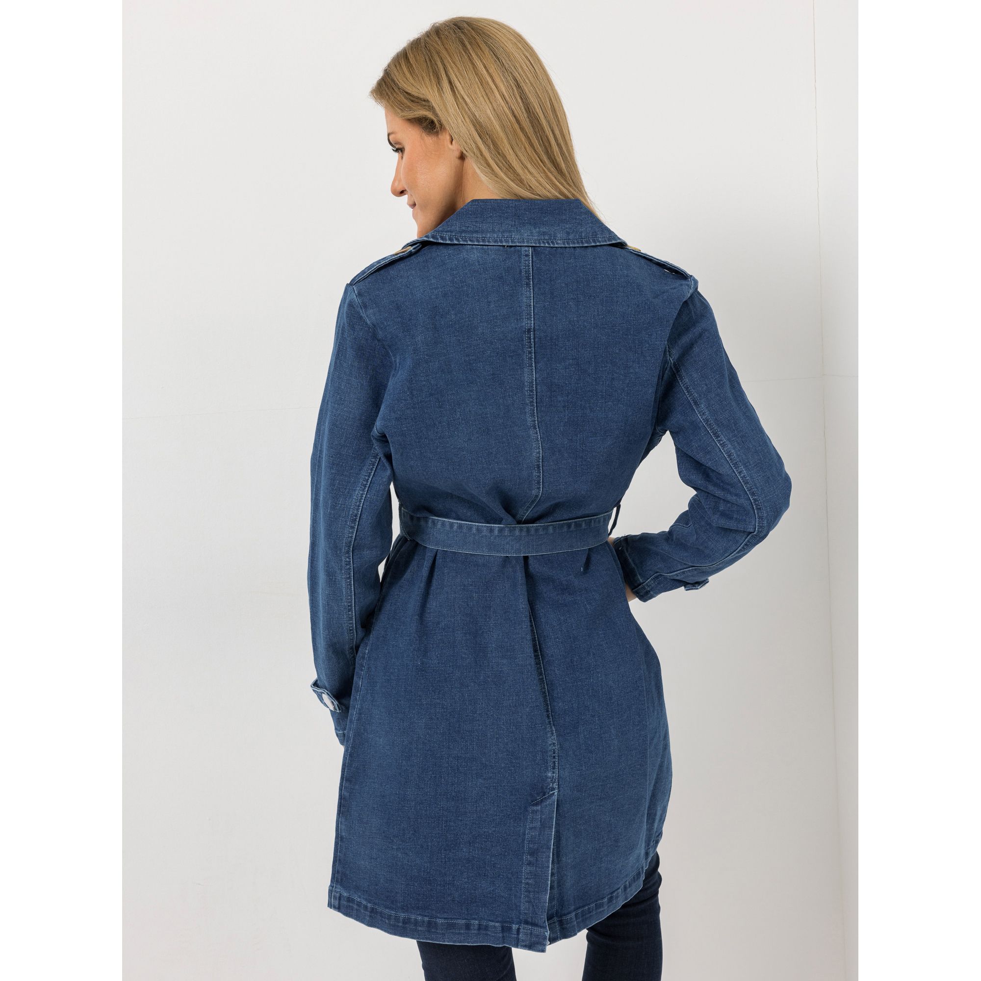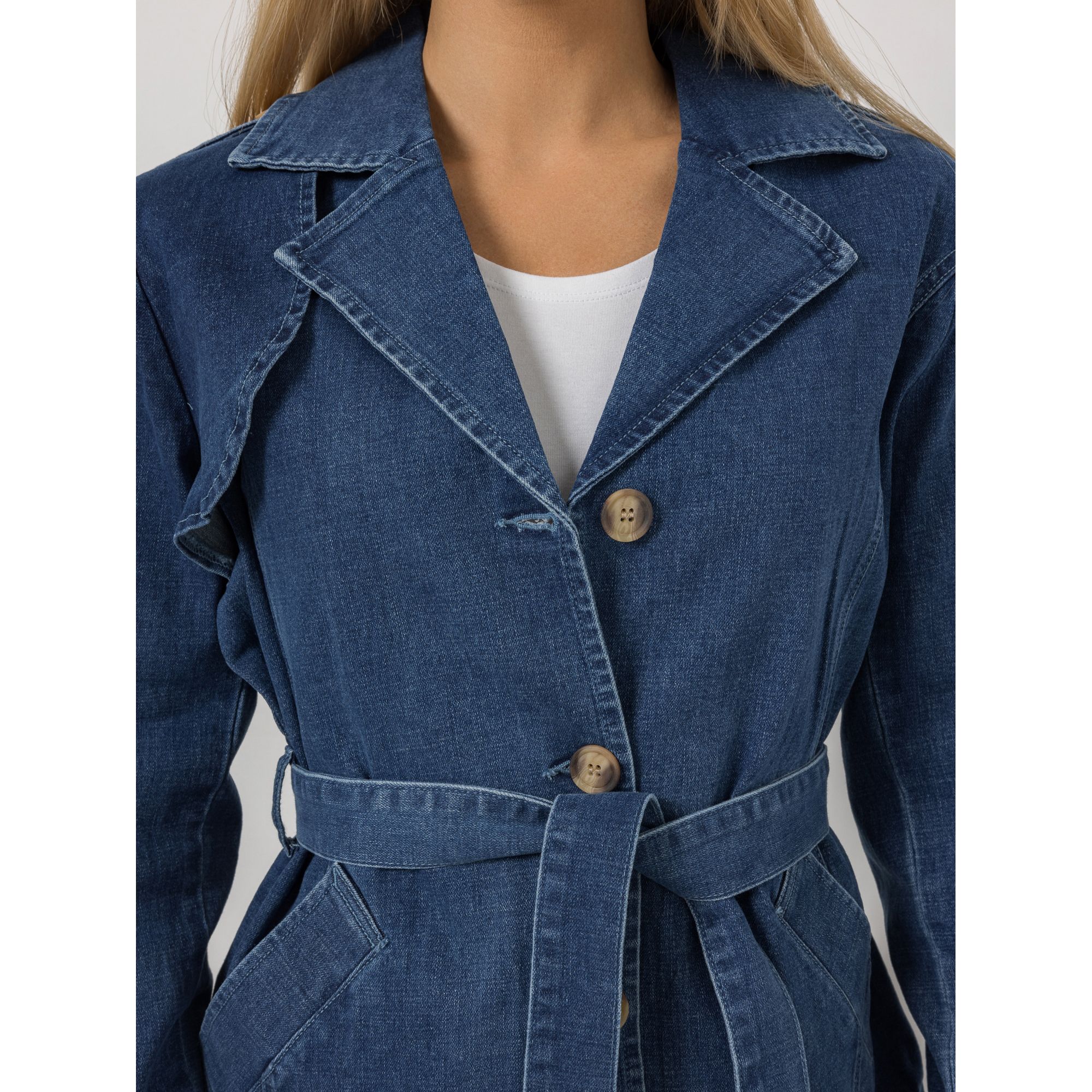 Ein Mantel, mit dem du auffällst: Der EVA LUTZ Jeansmantel hat eine ausgefallene Optik – Reverskragen, Schulterriegel und der Gürtel erinnern an einen Trenchcoat, zugleich spielt er mit der blauen Optik einer Jeansjacke.