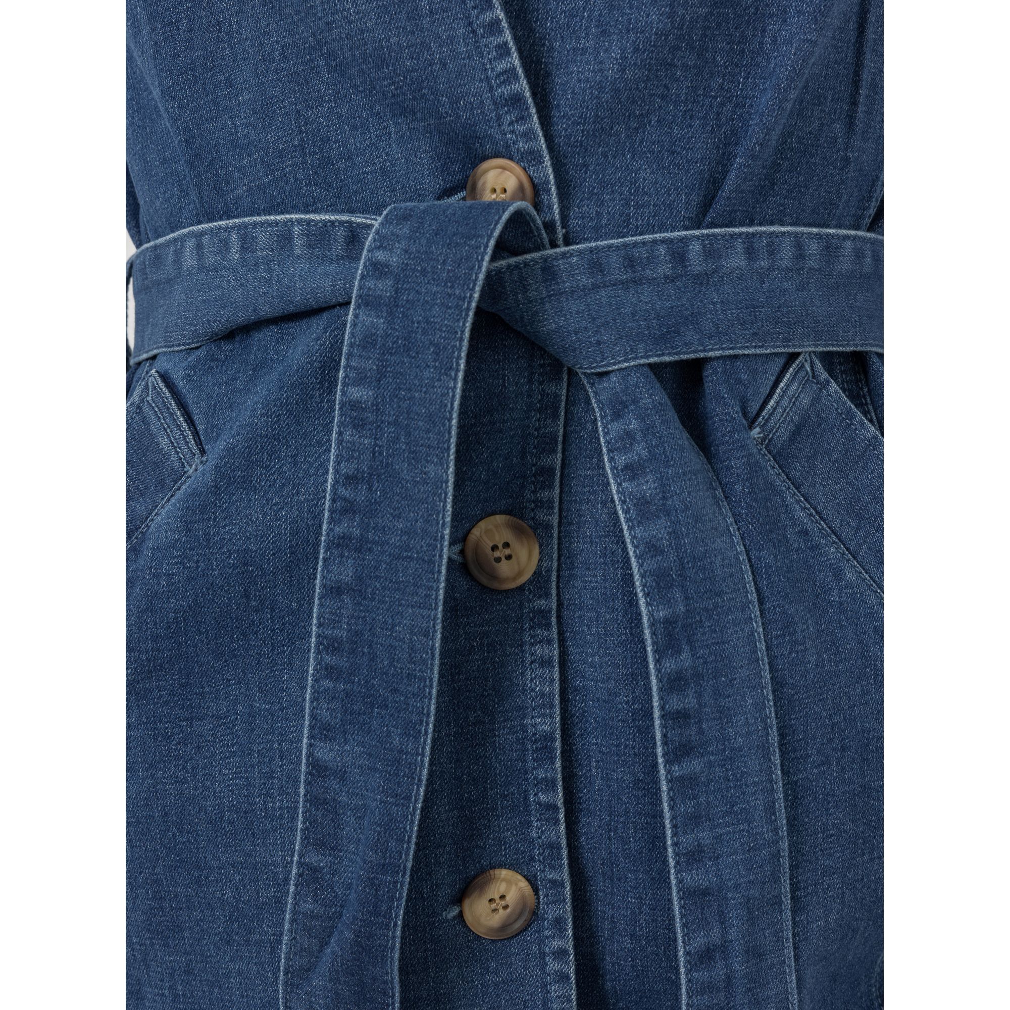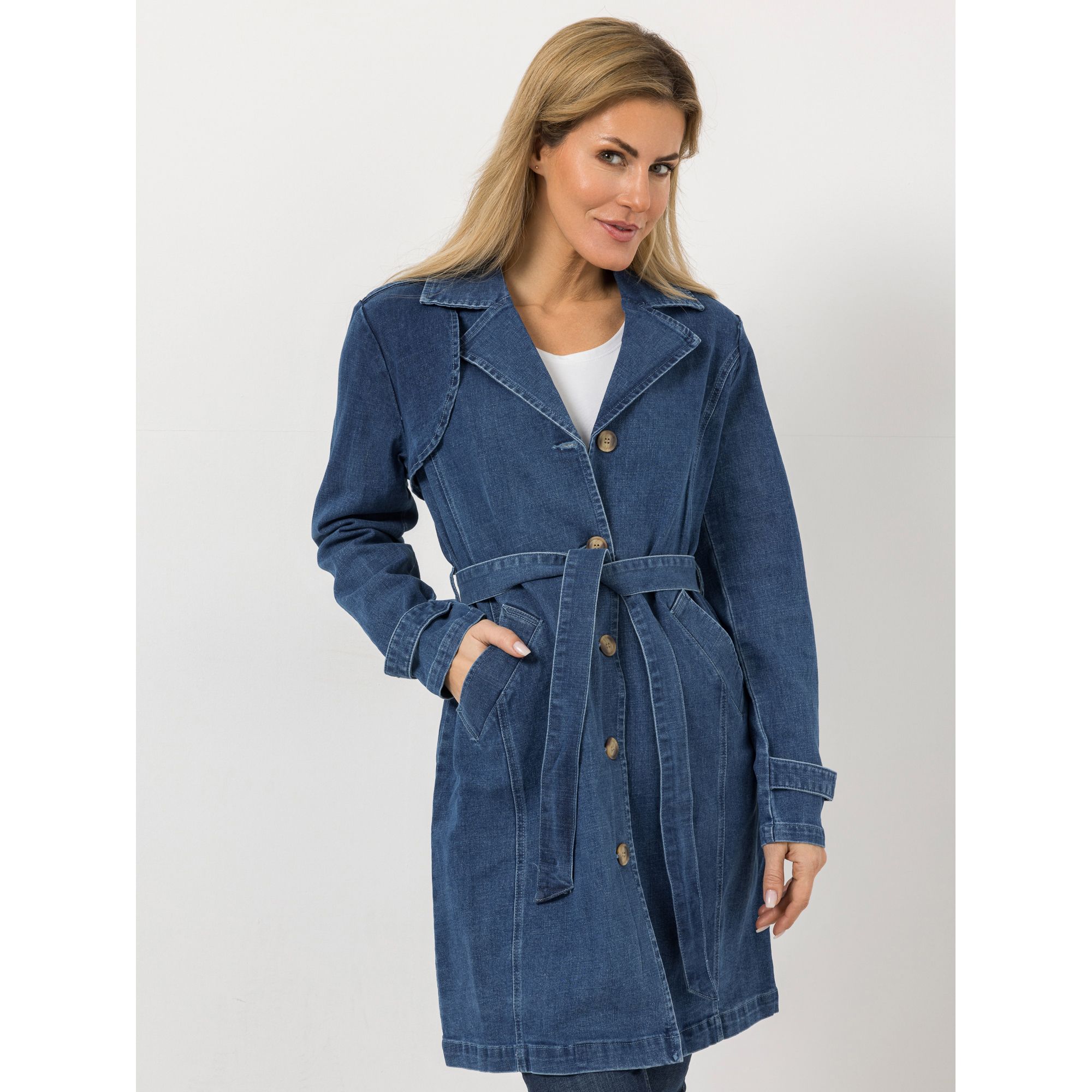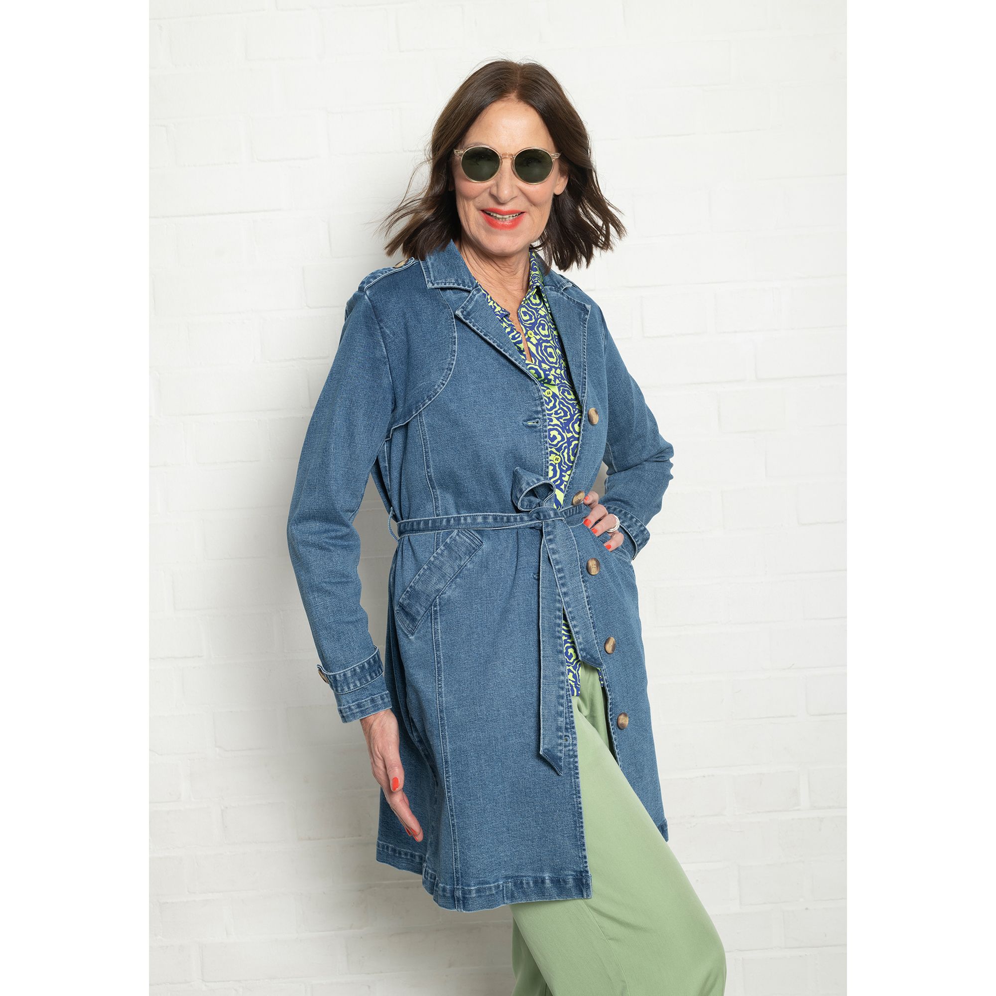 Ein Mantel, mit dem du auffällst: Der EVA LUTZ Jeansmantel hat eine ausgefallene Optik – Reverskragen, Schulterriegel und der Gürtel erinnern an einen Trenchcoat, zugleich spielt er mit der blauen Optik einer Jeansjacke.
