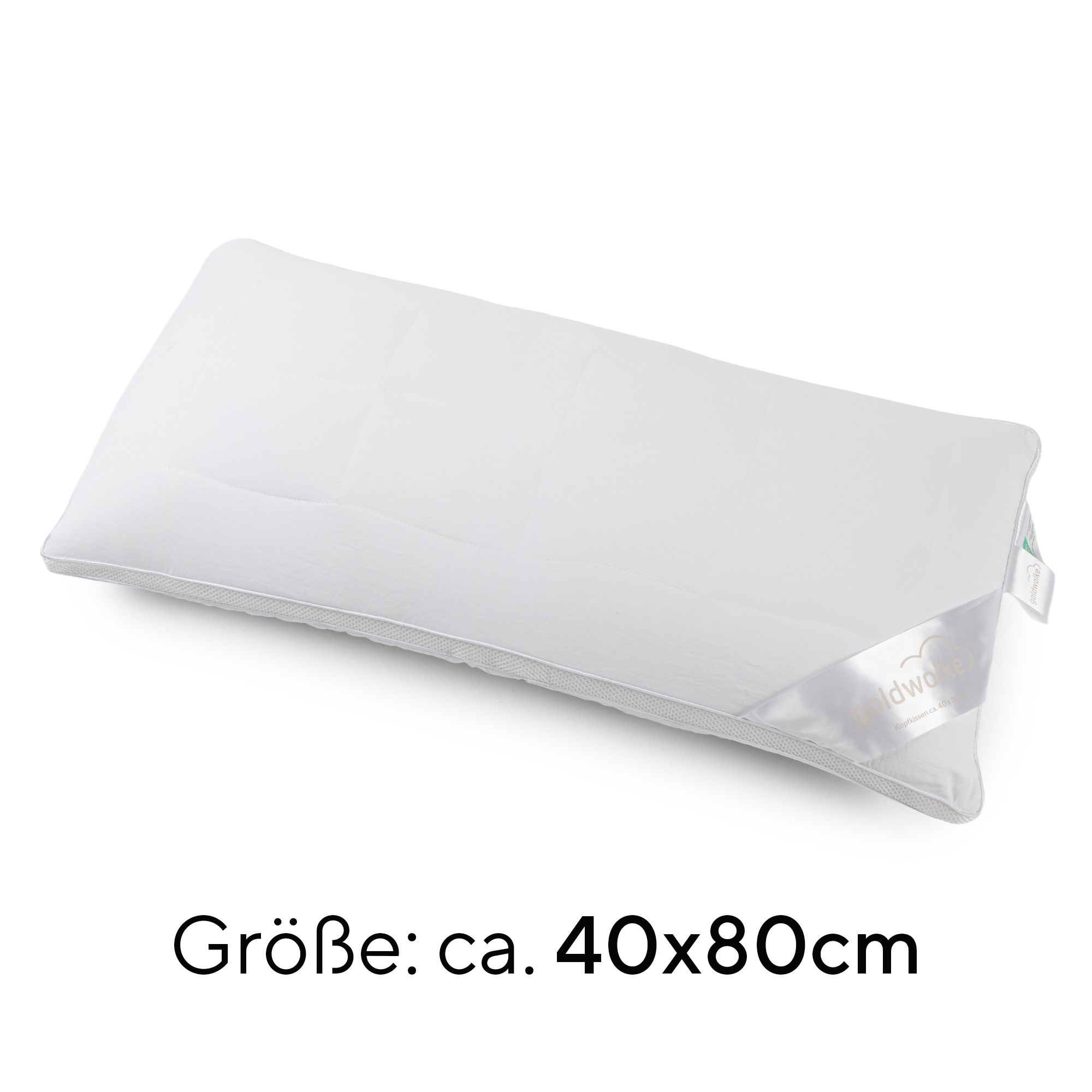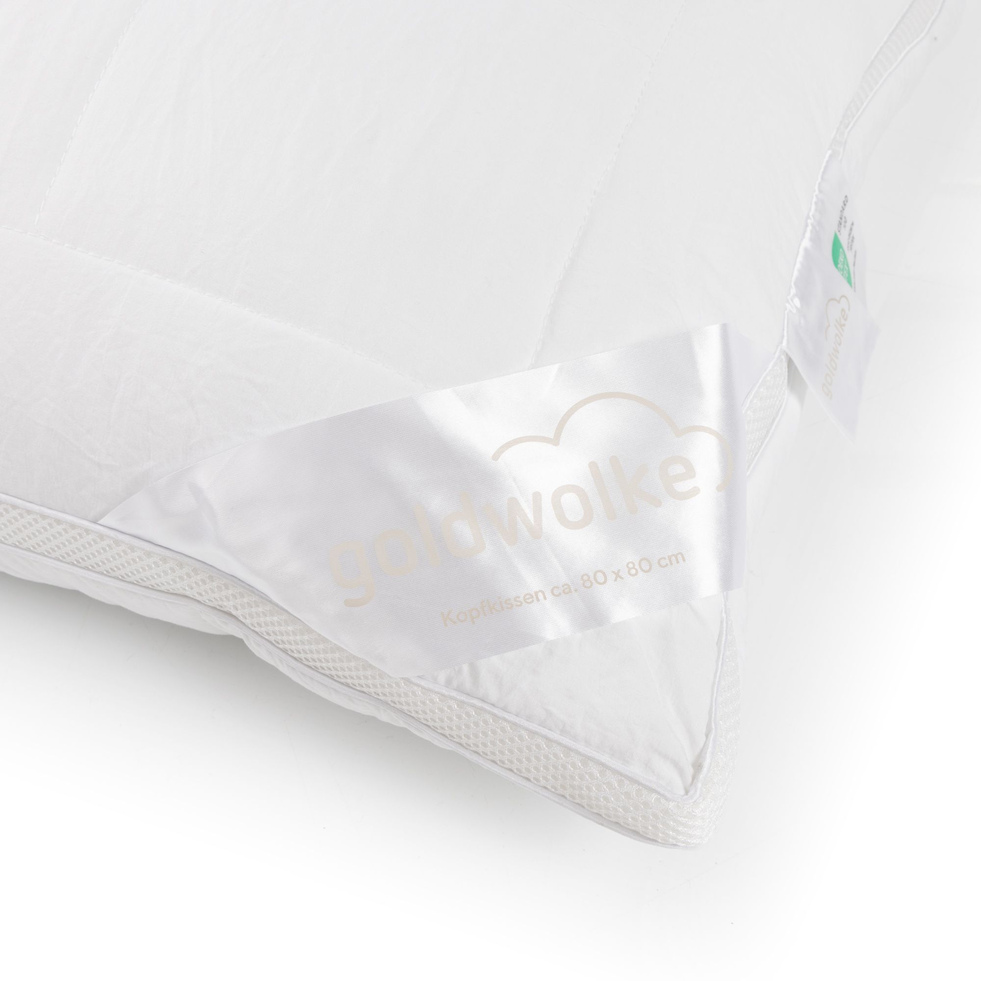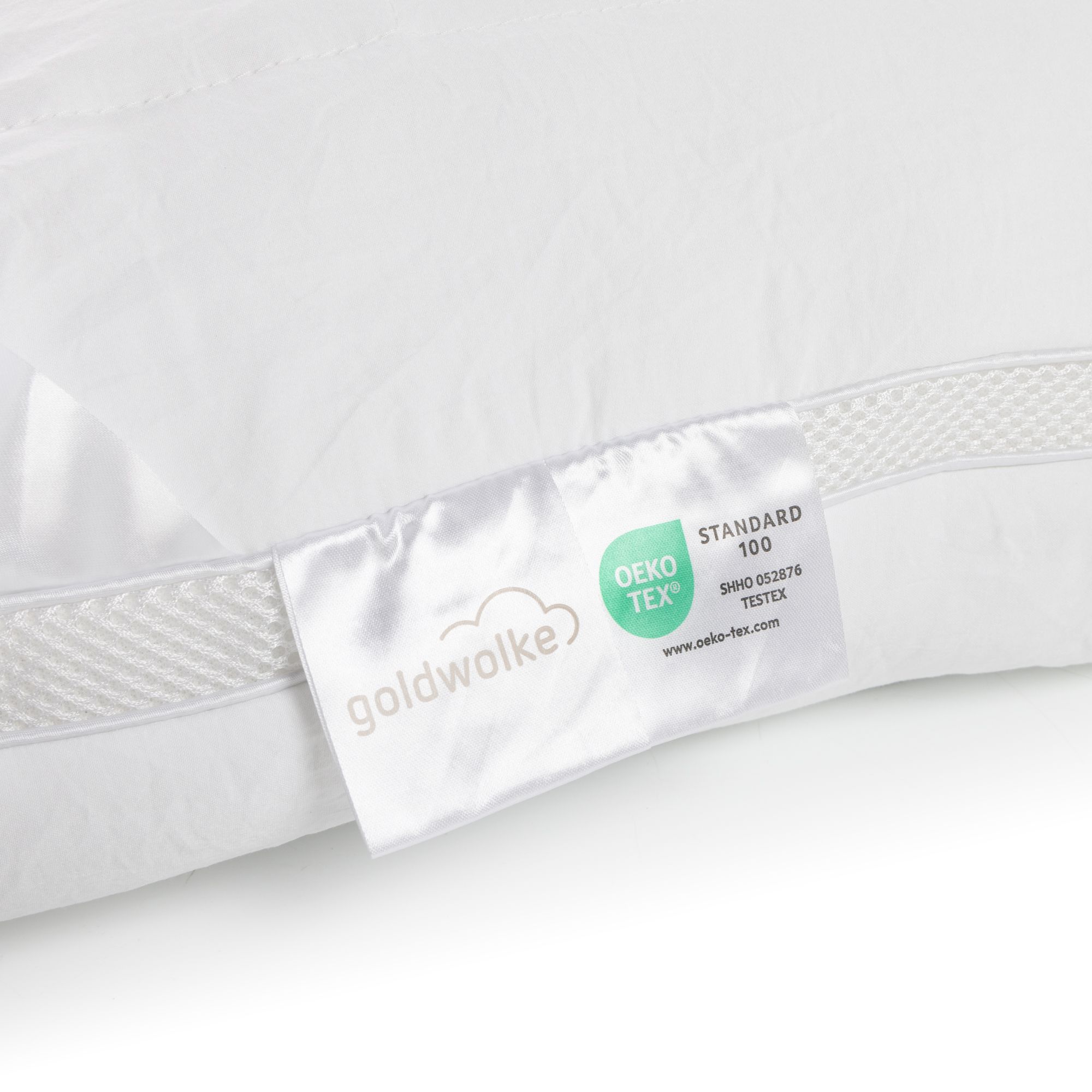 Das Kissen von GOLDWOLKE schenkt entspannten Liegekomfort für Kopf- & Nackenpartie – mit und ohne Bettwäsche