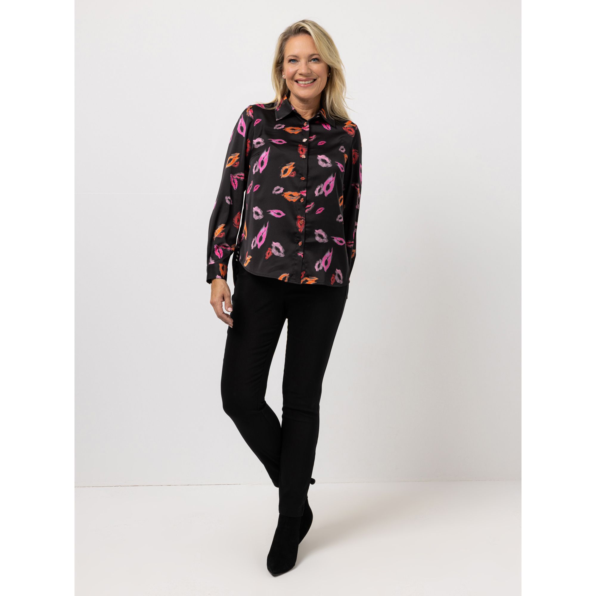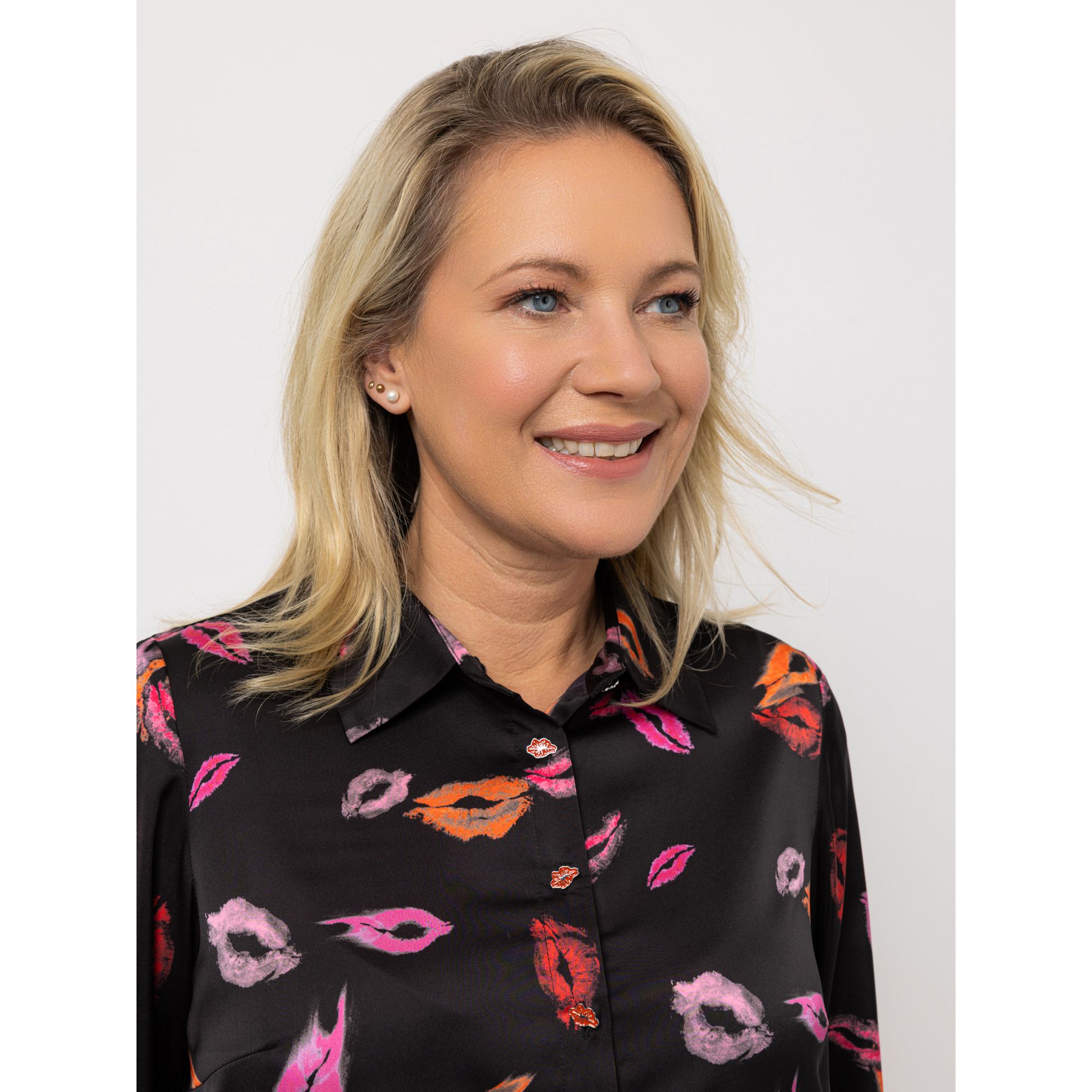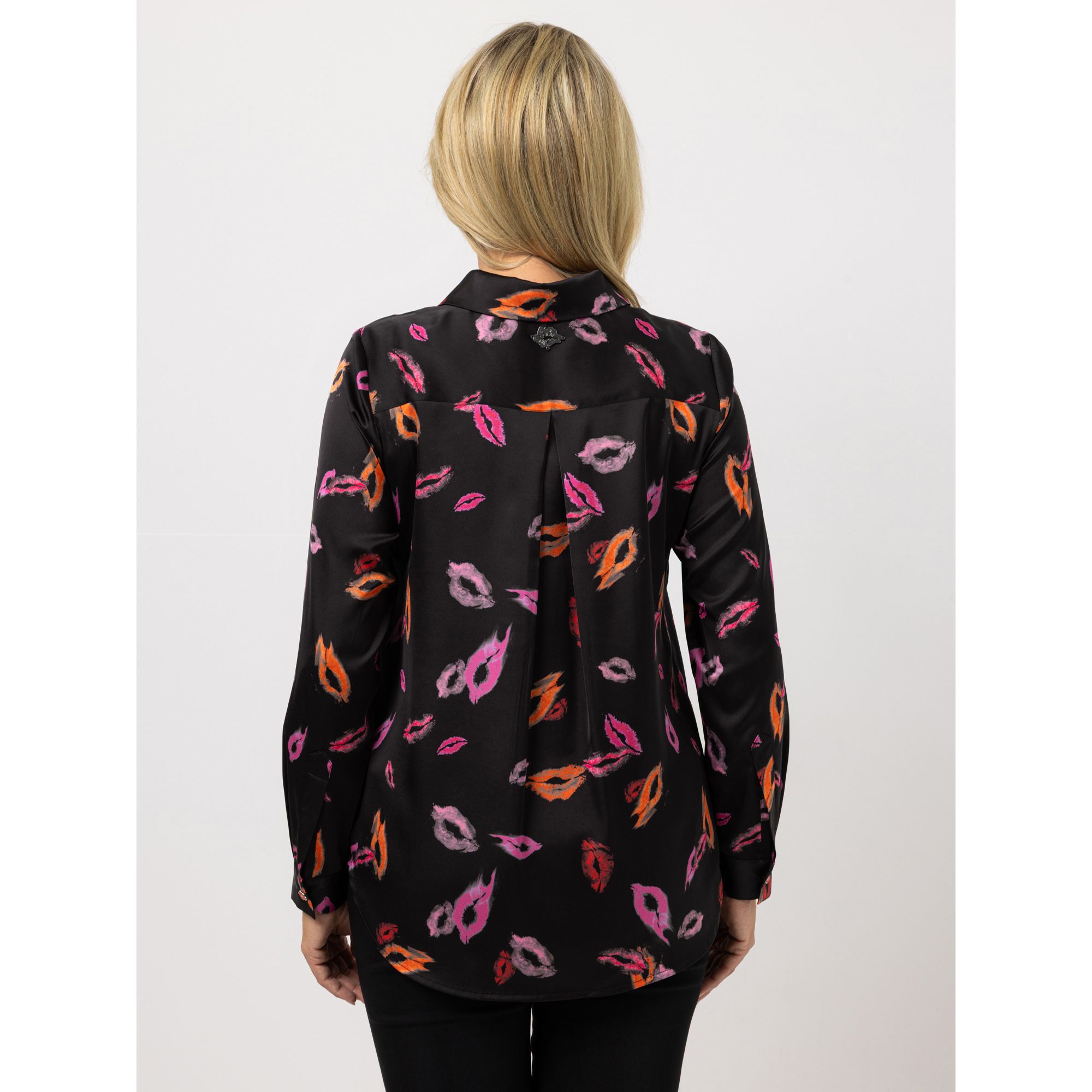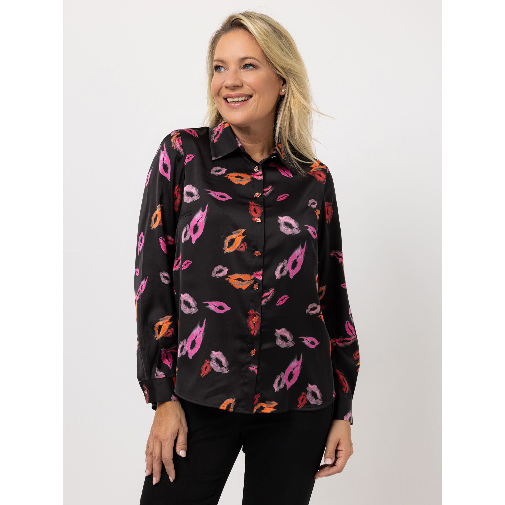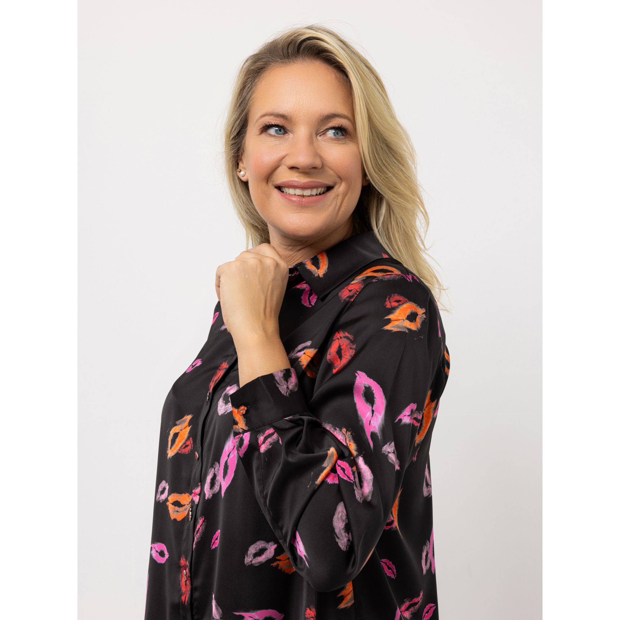 Romantisch-verspielt mit eleganter Note: Die schwarz gemusterte Bluse von KILIAN KERNER SENSES ist mit Knöpfen in Kussform besetzt, außerdem ist sie komplett bedruckt.