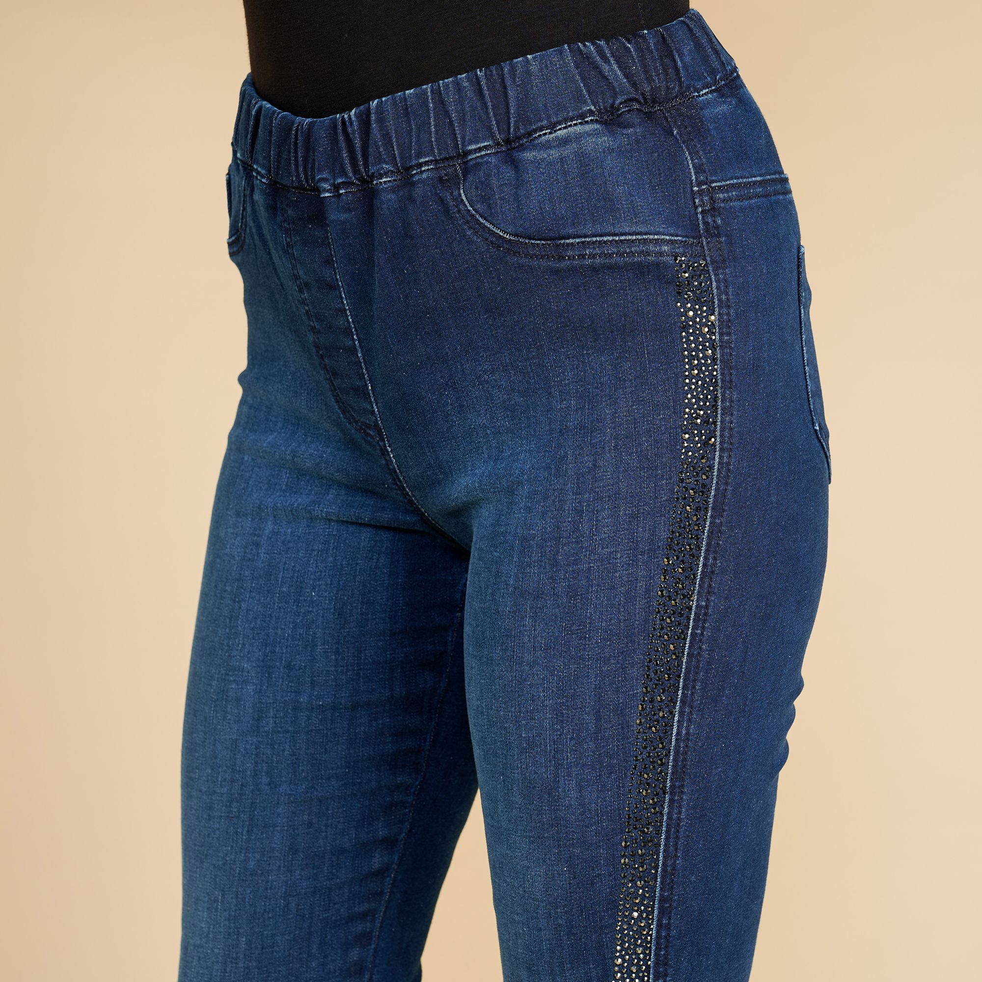 Die Strassveredelung als Galonstreifen auf der SCHIFFHAUER MUNICH® Jeans France ist ein absoluter Blickfang.