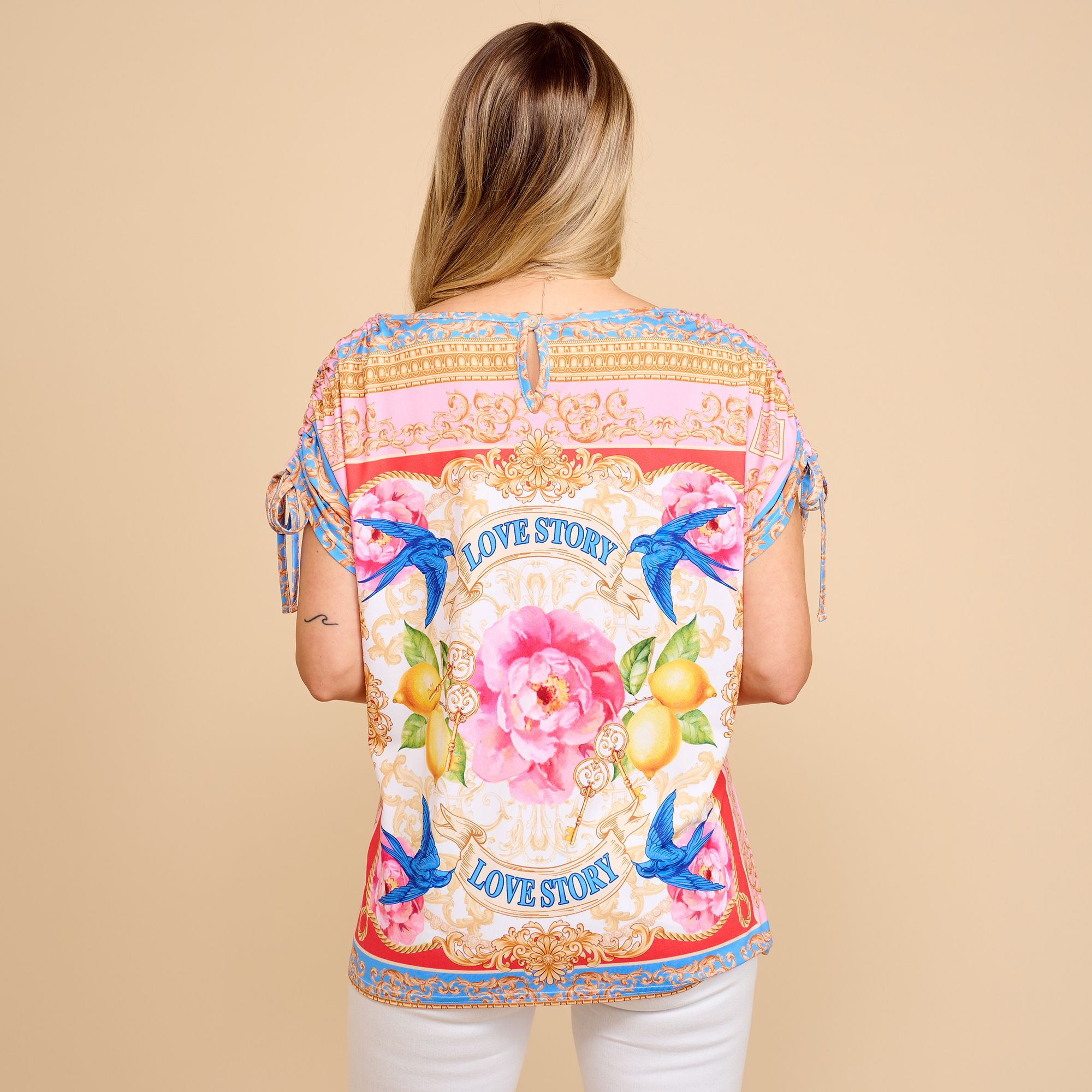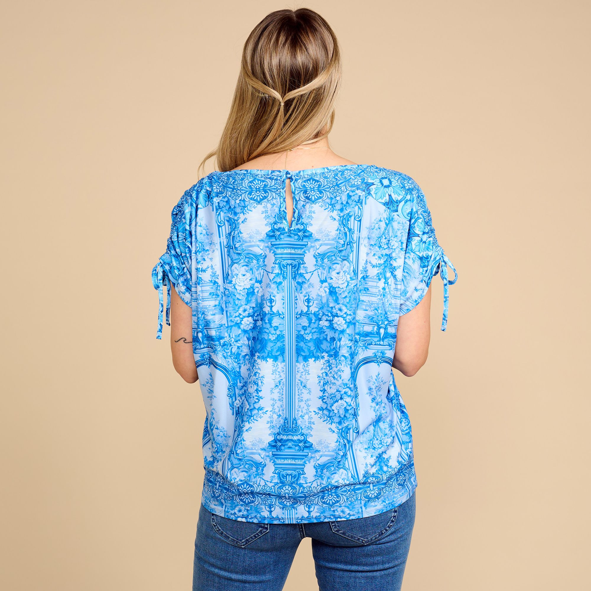 - Raffung an der Schulter mit Bändern zum Binden