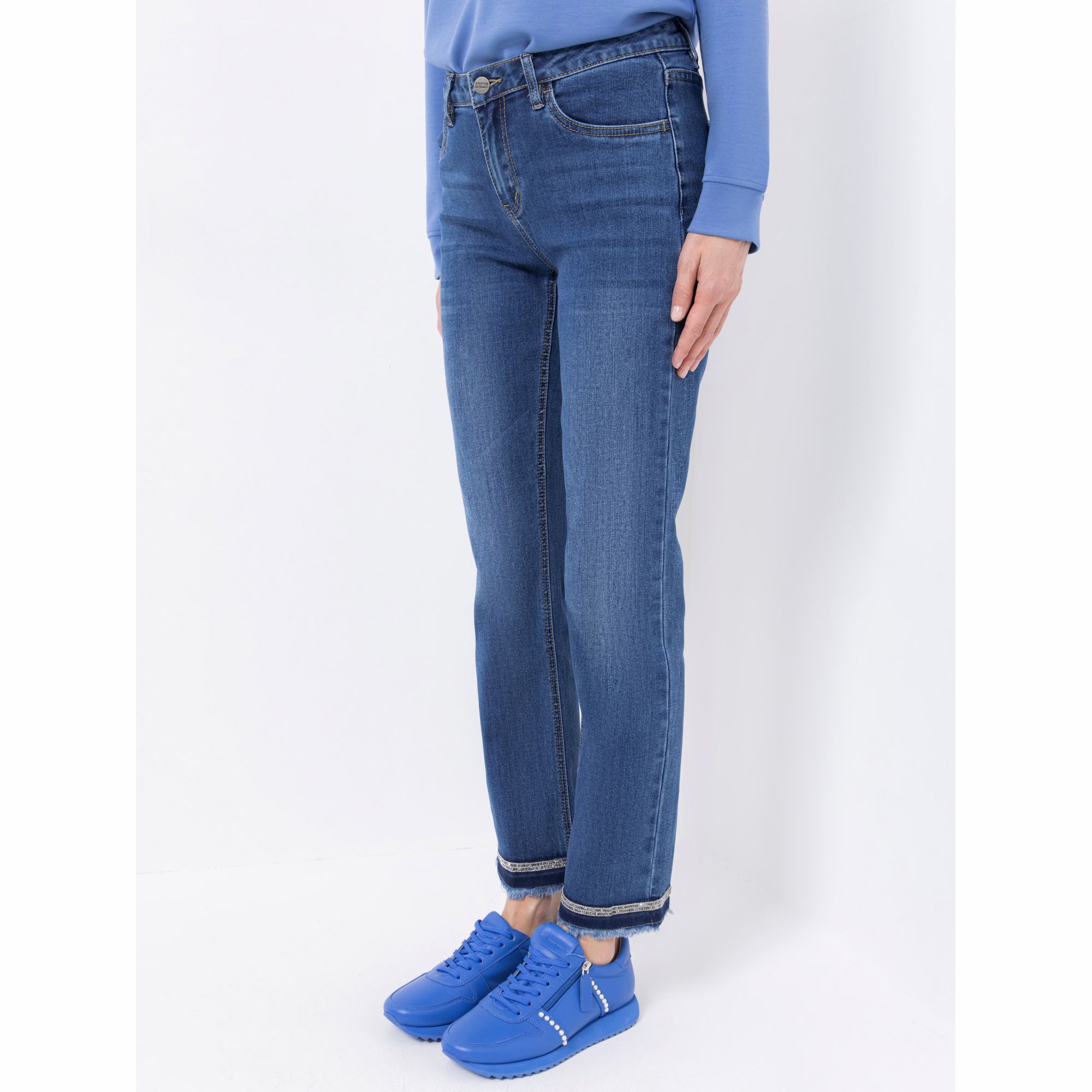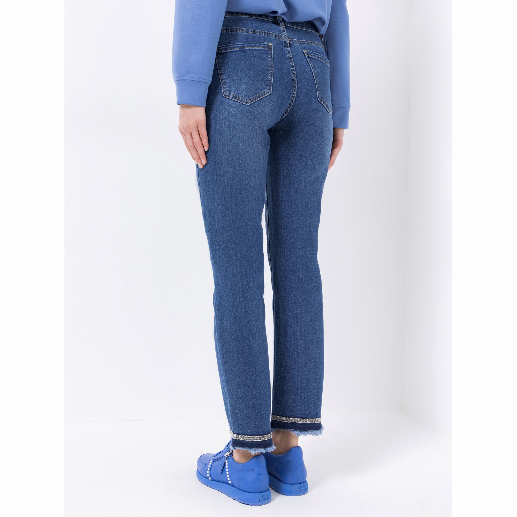 Für den lässigen, unangepassten Look: Die Designer-Jeans von STEFFEN SCHRAUT wirkt durch die Strass-Details glamourös und durch den ausgefransten Saum gleichzeitig sehr lässig.