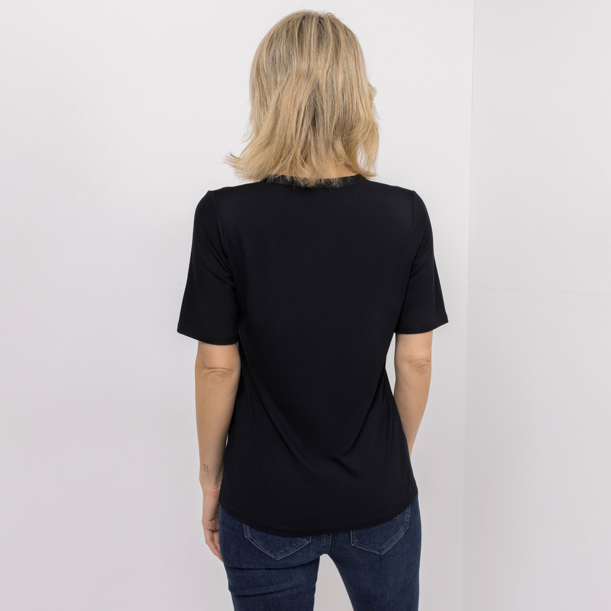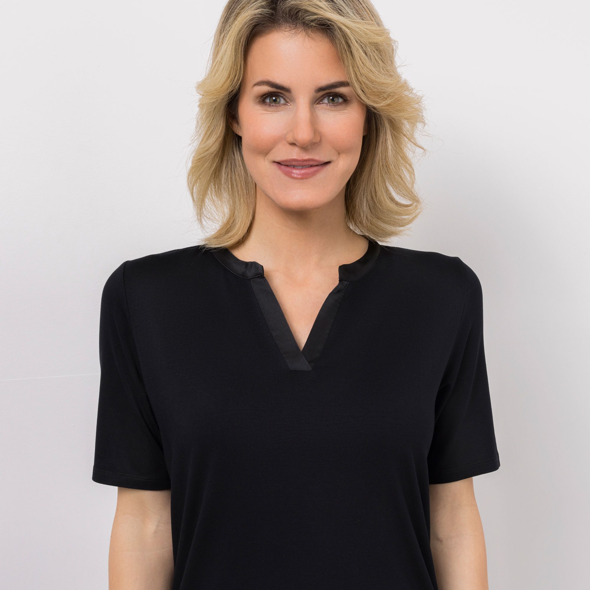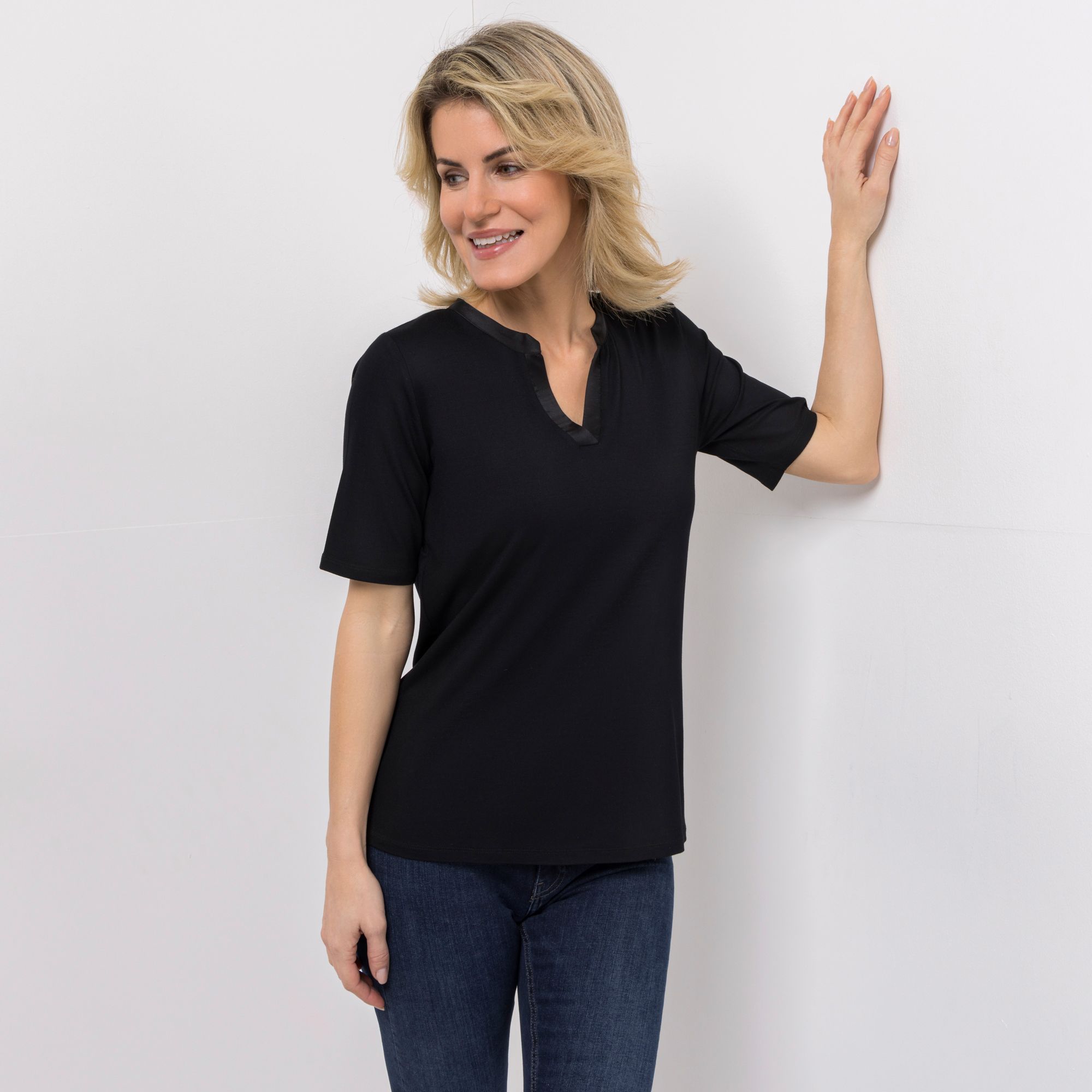 Mit dem charmanten Shirt von VIA MILANO kommt ein Hauch italienischer Eleganz in deinen Alltag – feine Satin-Details am Serafino-Ausschnitt verleihen dem Look einen raffinierten Akzent.