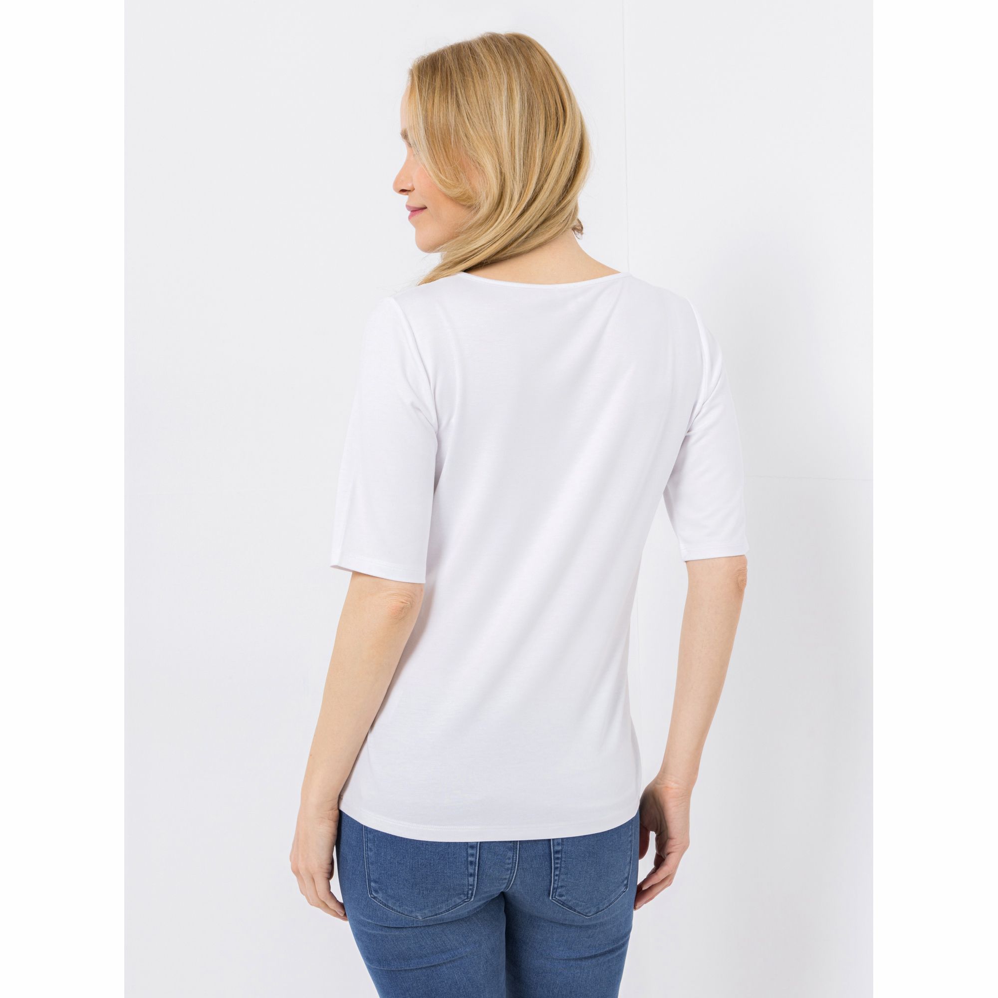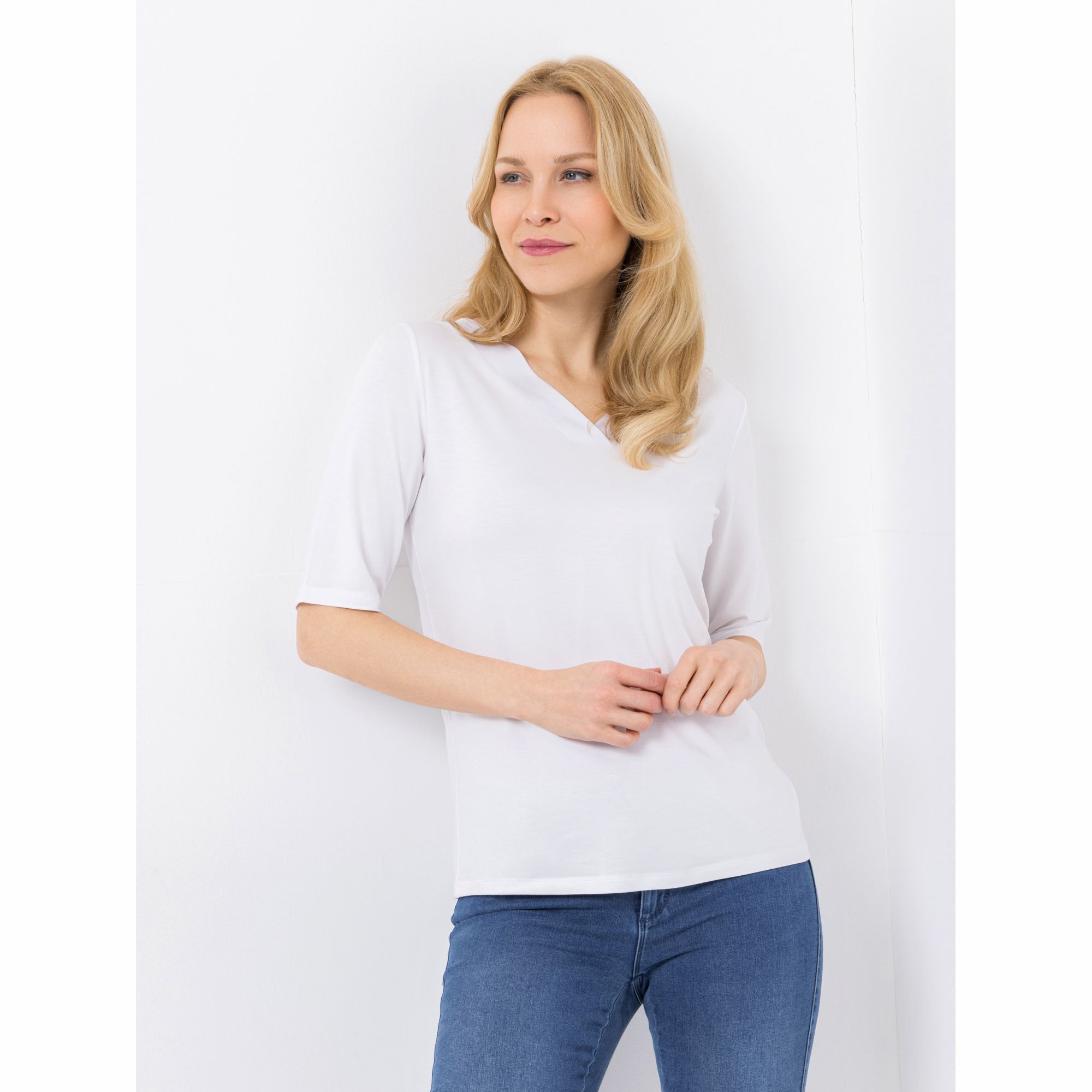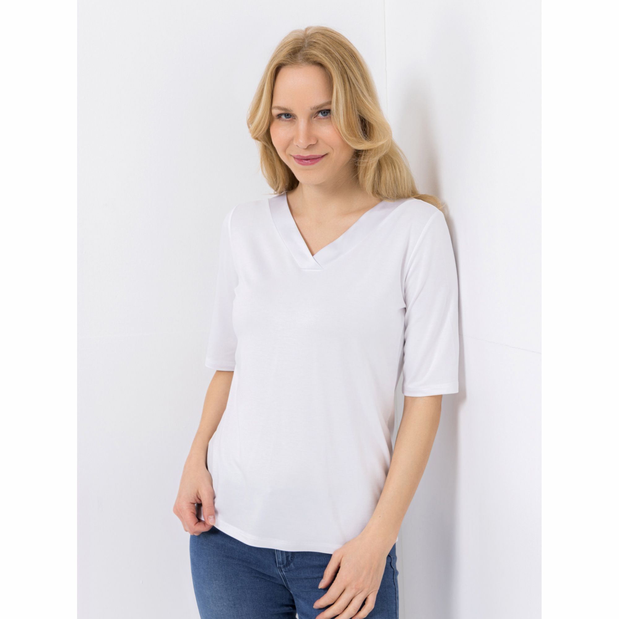 In exquisiter Satin-Optik schimmert der V-Ausschnitt des VIA MILANO Shirtes mit halblangen Ärmeln.