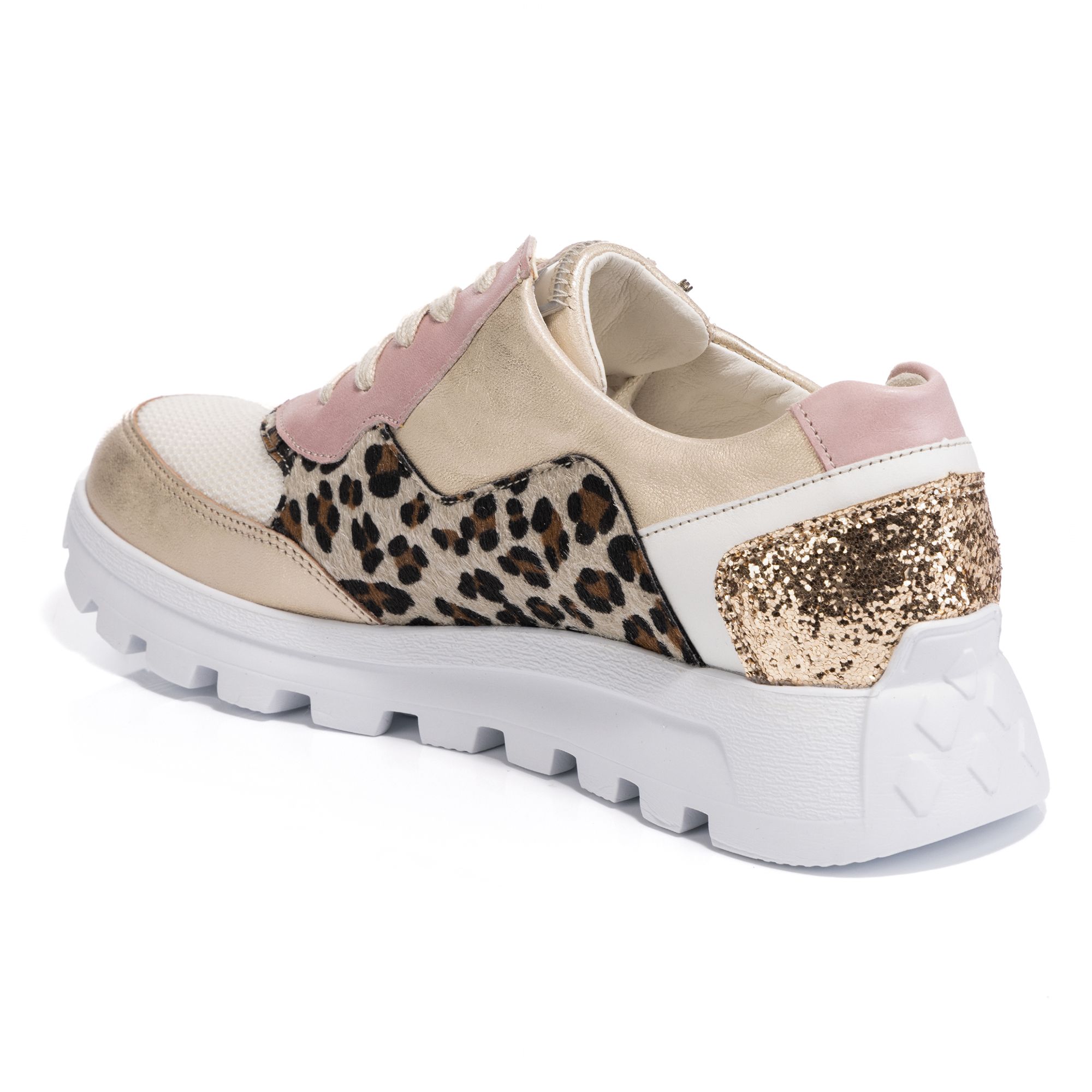 • textiles Pailettenmaterial an der Ferse, verschiedene Lederdetails am Rest des Schuhs
