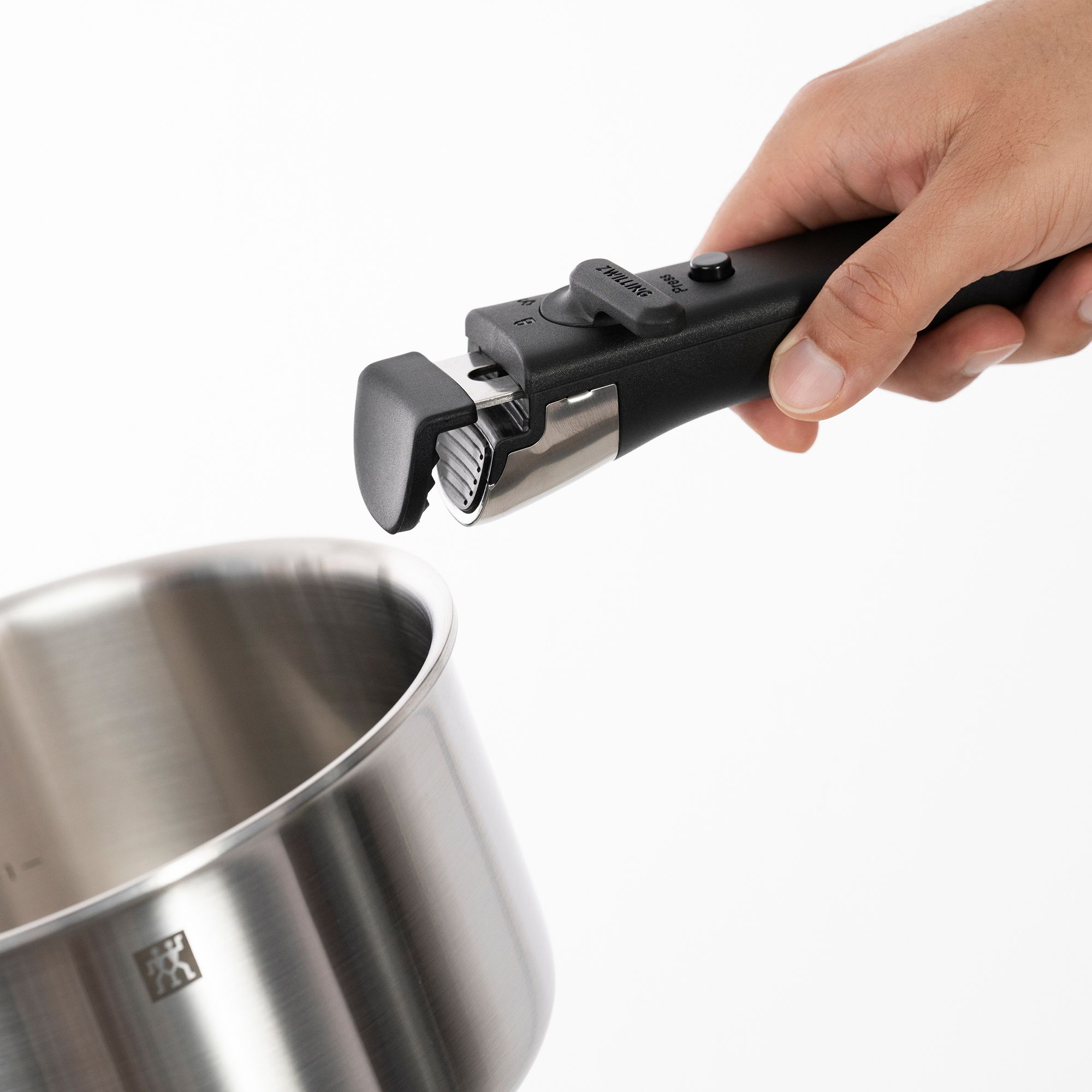 - Griff lässt sich binnen Sekunden anklicken oder entfernen – dann ist das Kochgeschirr platzsparend stapel- und verstaubar