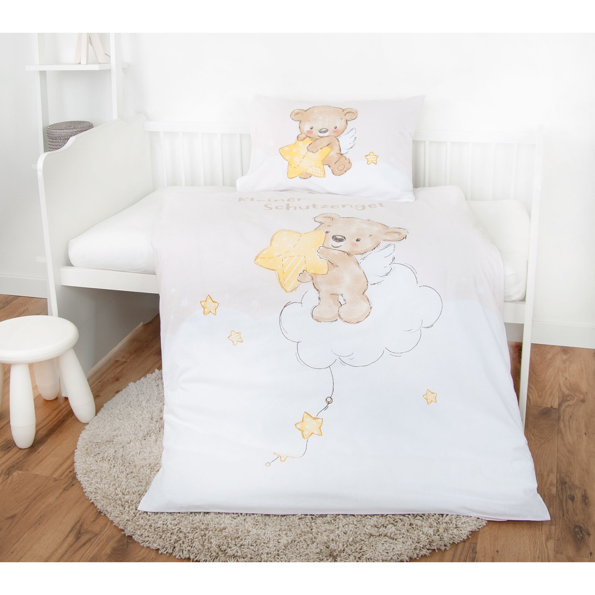 Mit der babybest® Wendebettwäsche "Kleiner Schutzengel" aus weichem Baumwoll-Flanell sorgst du für eine behagliche Atmosphäre im Kinderzimmer. Das liebevoll gestaltete Design mit Bär, Stern und Wolke lädt zum Träumen und Kuscheln ein.
