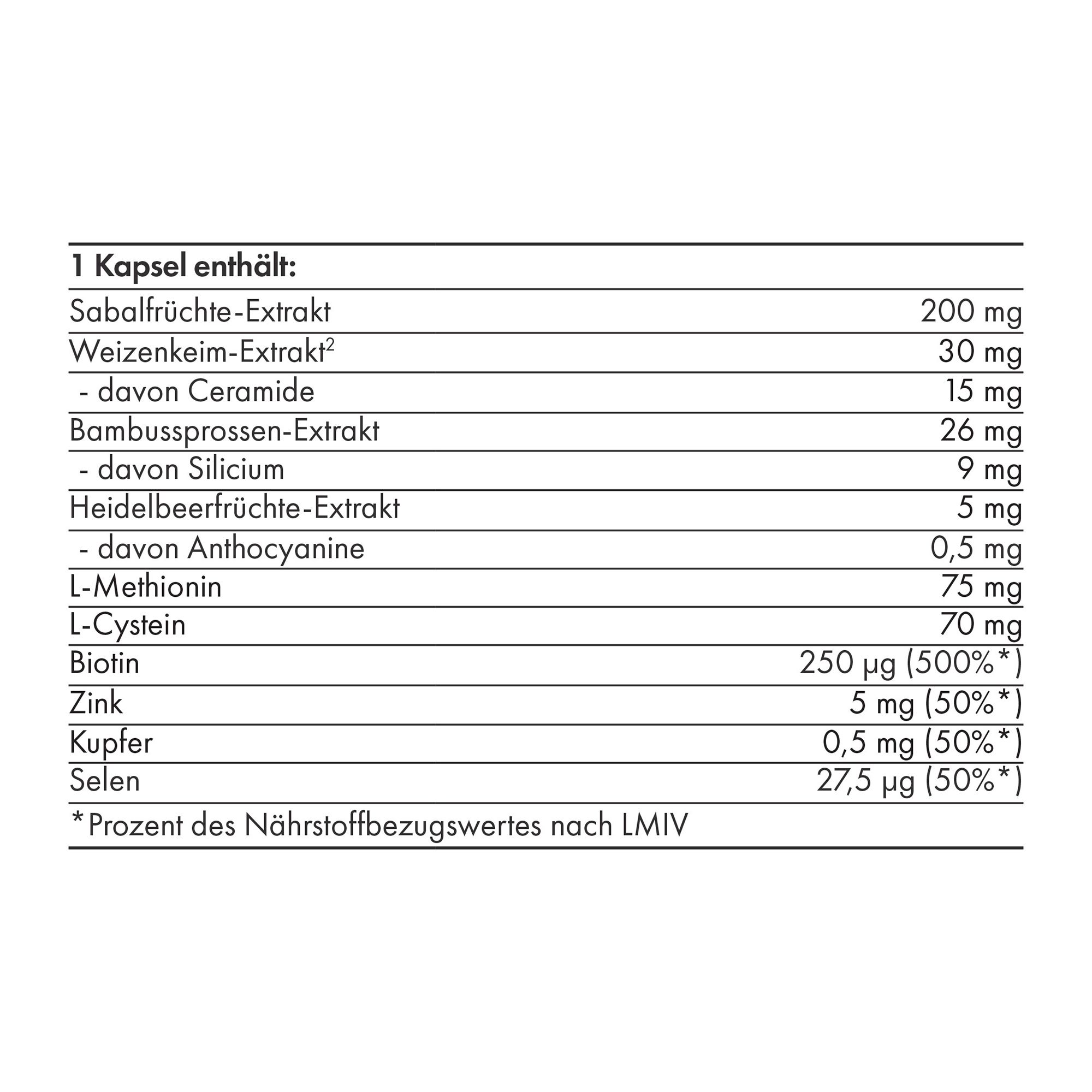 - hochwertiger Pflanzen-Komplex aus Sabalfrüchten (Serenoa repens), Weizenkeim-Extrakt (CeramosidesTM), Aminosäuren, Spurenelementen und Biotin.