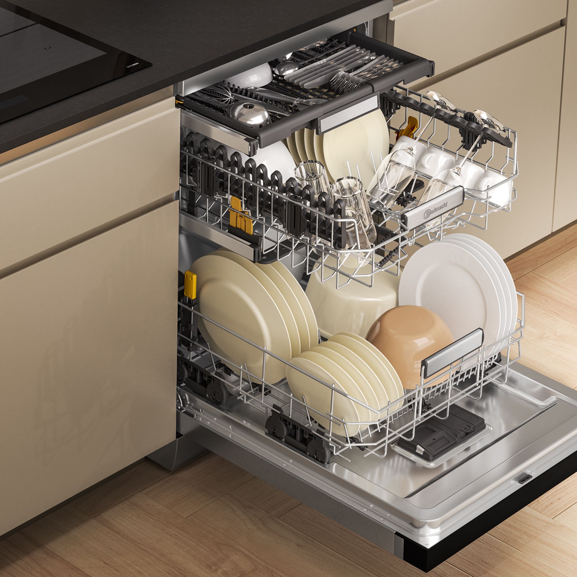 • 4 klappbare Tassenablagen im Oberkorb