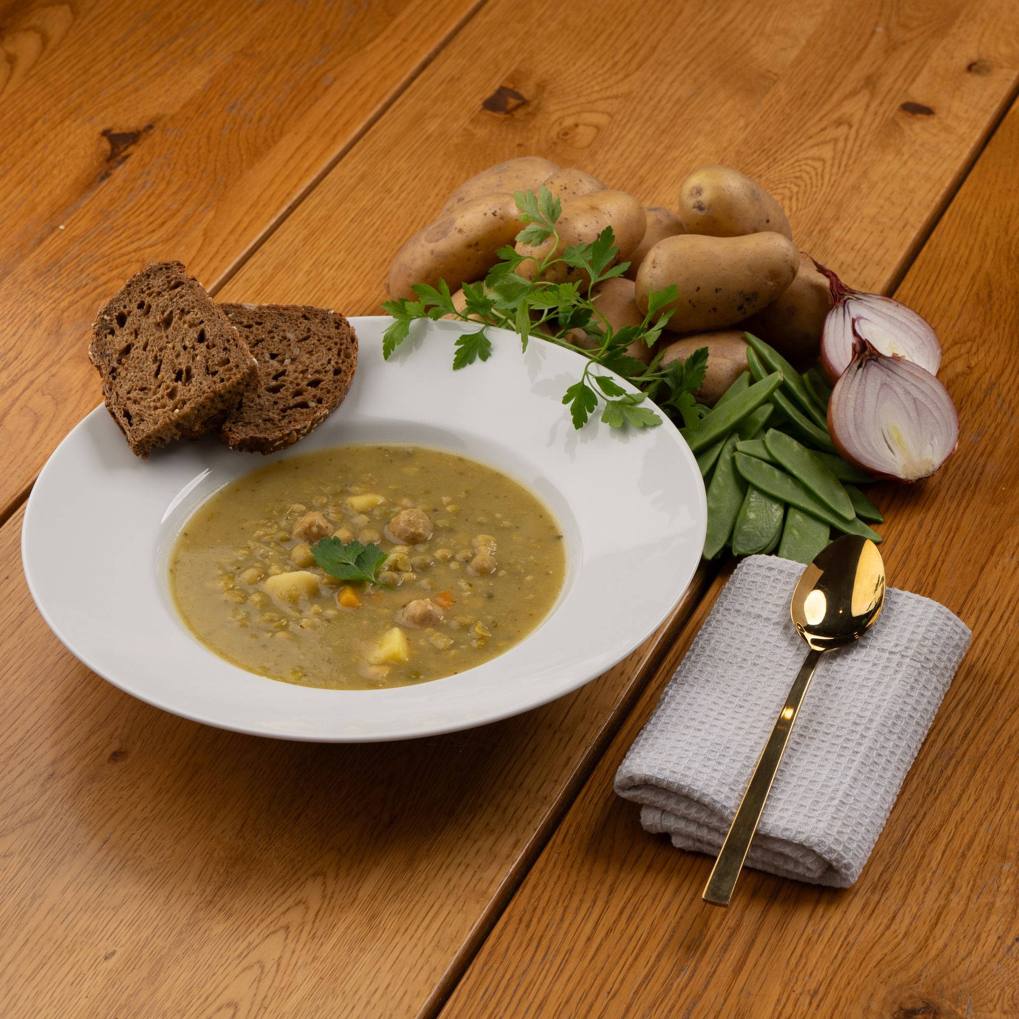 - Erbseneintopf mit herzhaften Fleischklößchen und Kartoffeln