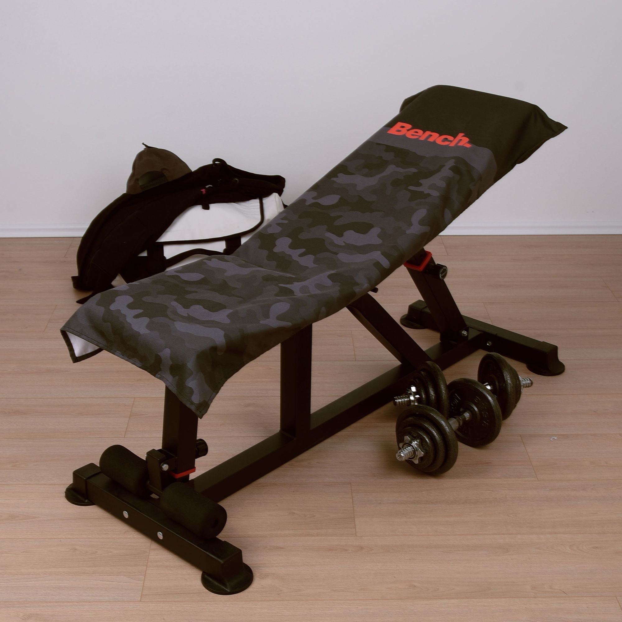 - Design: Camouflage-Grafik, orangefarbener Bench.-Schriftzug