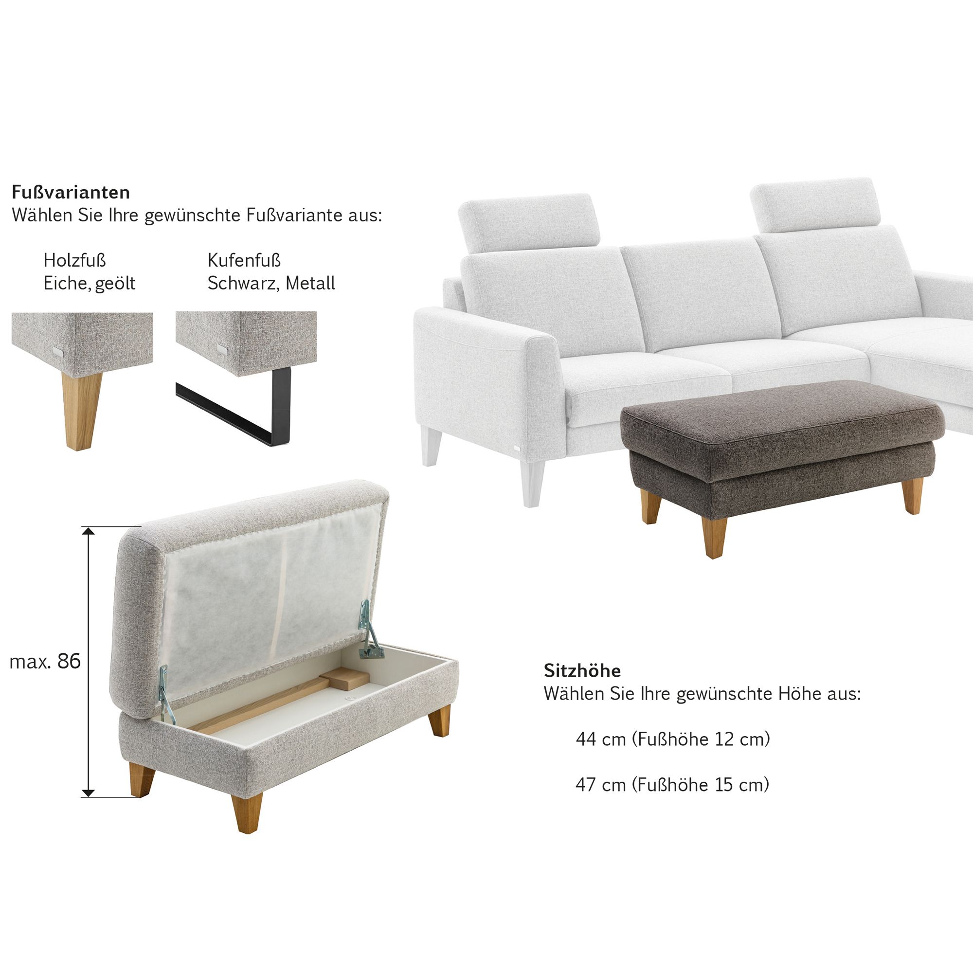 - Sitzhöhe: 44 cm (12 cm Fußhöhe) oder 47cm (15 cm Fußhöhe)