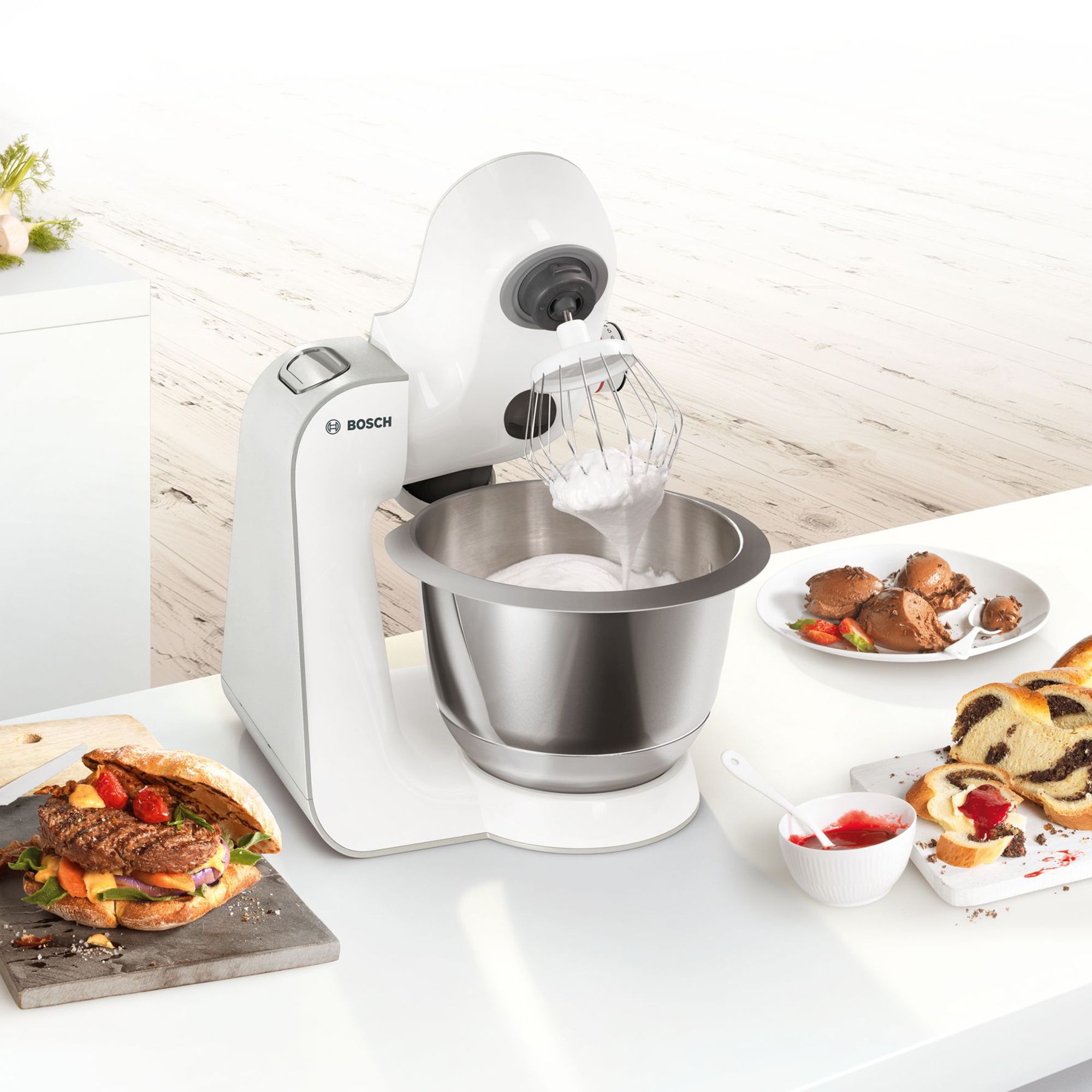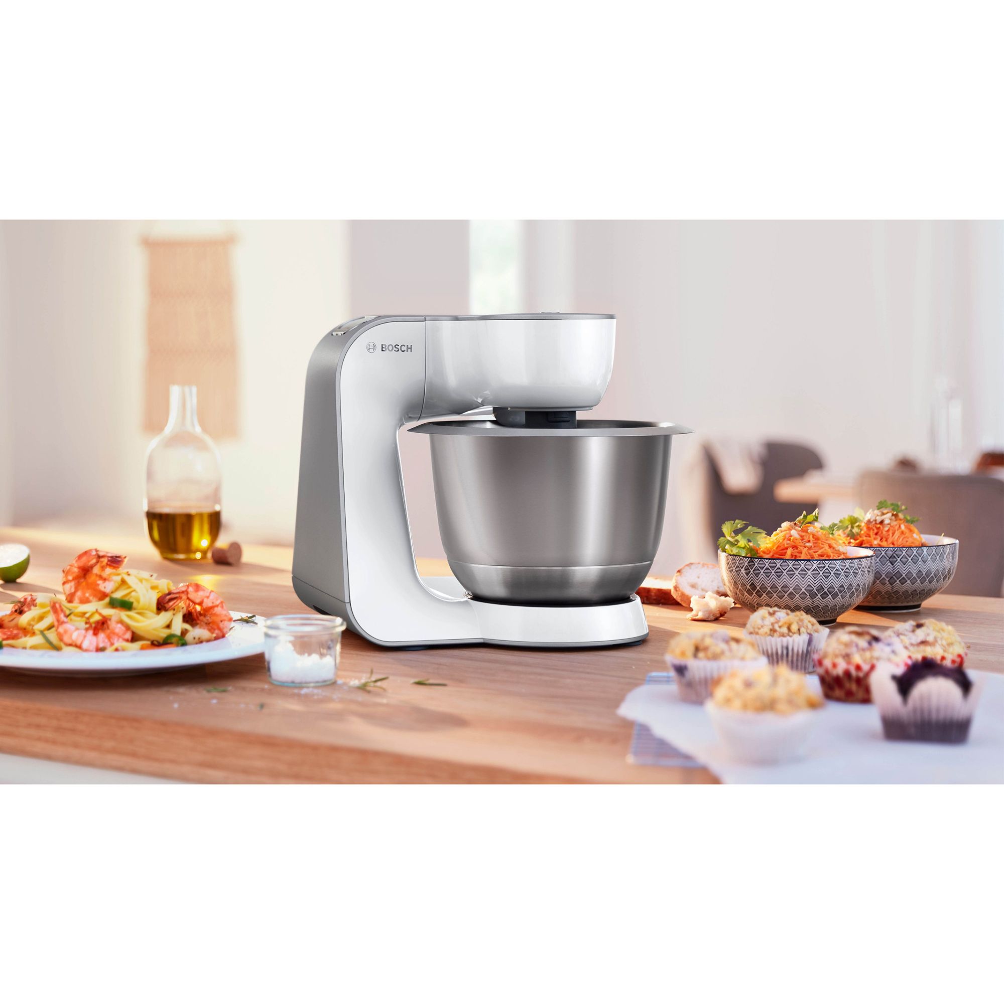 Unterstützung für alle, die beim Kochen und Backen gern kreativ werden und keine Kompromisse eingehen wollen: Die Küchenmaschine MUM58251 von BOSCH! Dank leistungsstarkem Motor verarbeitet sie auch anspruchsvolle Teigmassen zuverlässig, während die innovative 3D PlanetaryMixing-Technologie dafür sorgt, dass sämtliche Zutaten gleichmäßig vermengt werden. Außerdem bietet die hochwertige Edelstahlschüssel mit spezieller Innenform viel Raum für große Portionen und erleichtert dir die Zubereitung verschiedenster Rezepte. Perfekt für alle, die einfach mal alles ausprobieren wollen, Meal Prep für die ganze Woche machen oder auch gerne mehrere Gäste auf einmal verköstigen wollen.