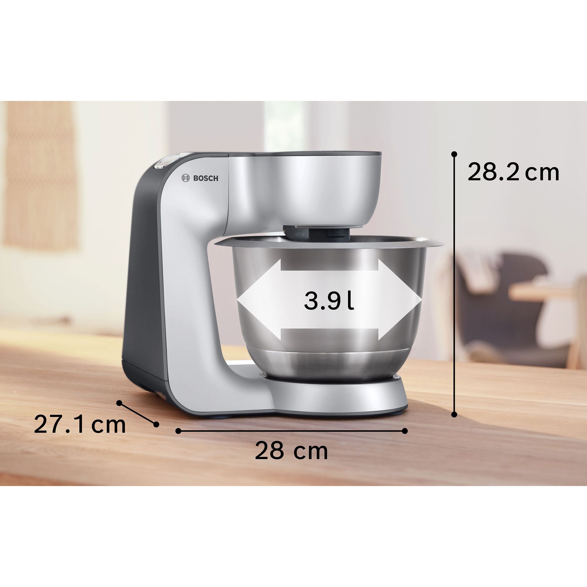 - große 3,9 l Edelstahlschüssel mit spezieller Innenform, ideal für bis zu 2,7 kg Rührteig oder 1,9 kg Hefeteig