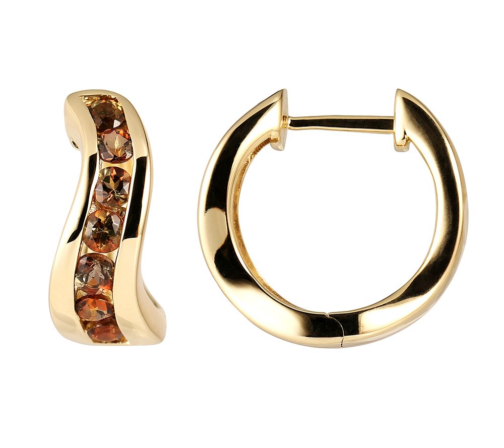 Veredeln Sie Ihren Look mit diesen grazilen Creolen aus unserer Brasilianischer Andalusit Schmuckkollektion, die feines 375er Gold mit den geheimnisvoll-verführerischen Farbnuancen von 14 channelgefassten Andalusiten mischen – für ein kunstvolles Gesamtergebnis, das Ihrem Gesicht schmeichelt.