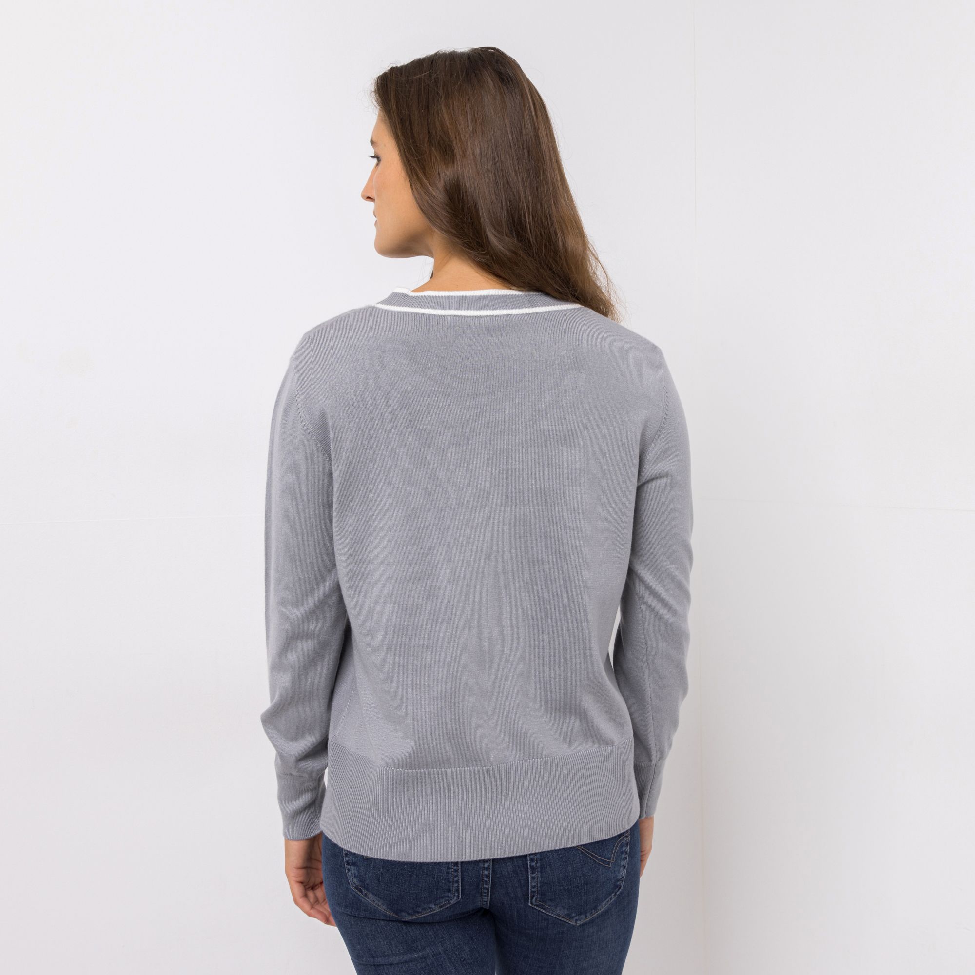 • Rippenabschluss an Ausschnitt und Knopfleiste sowie Bündchen und Saum