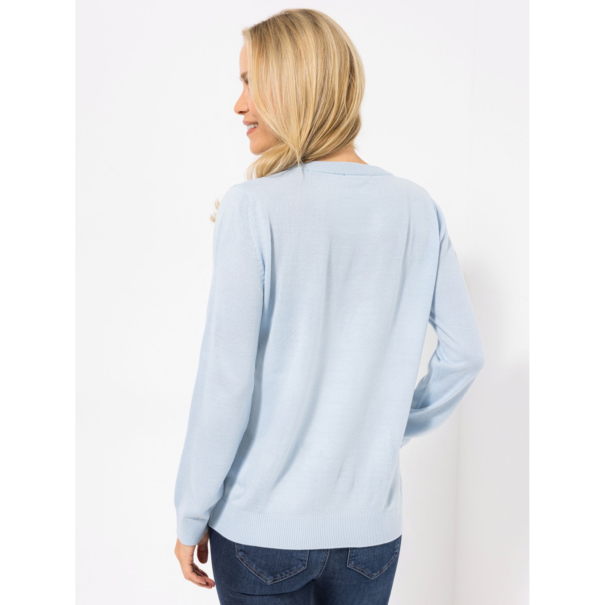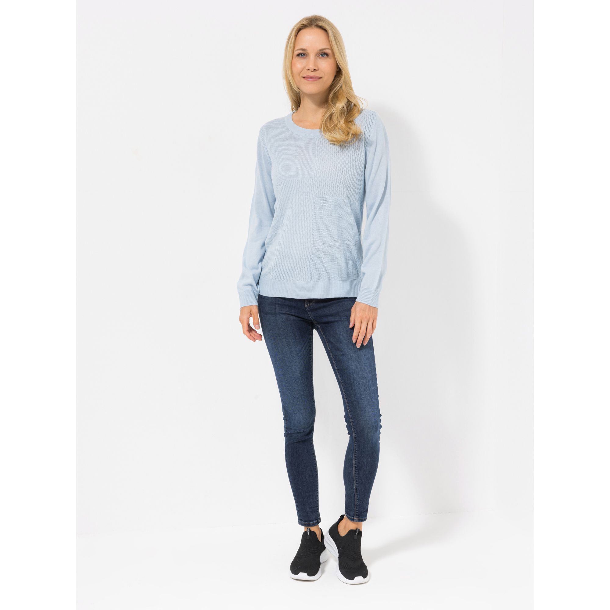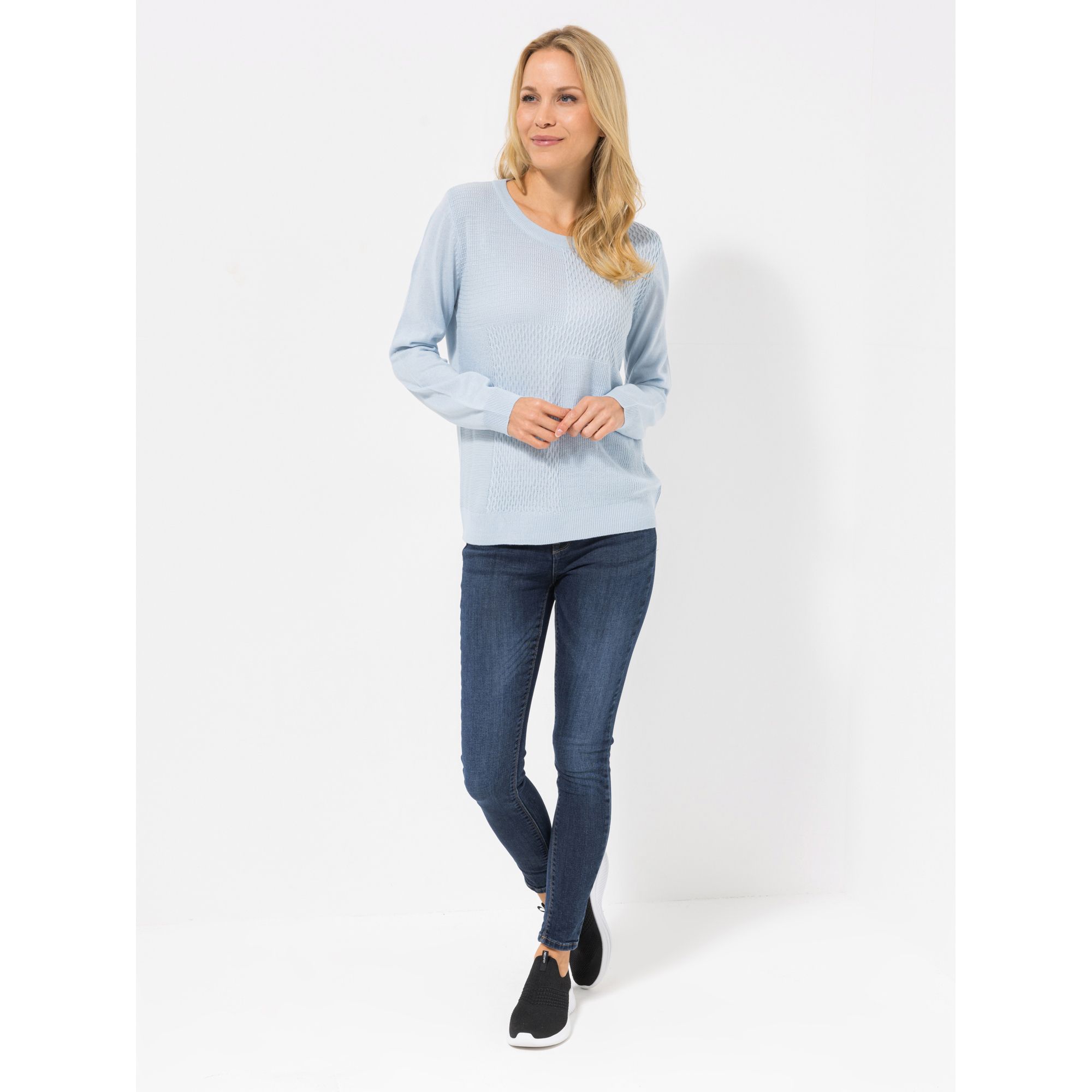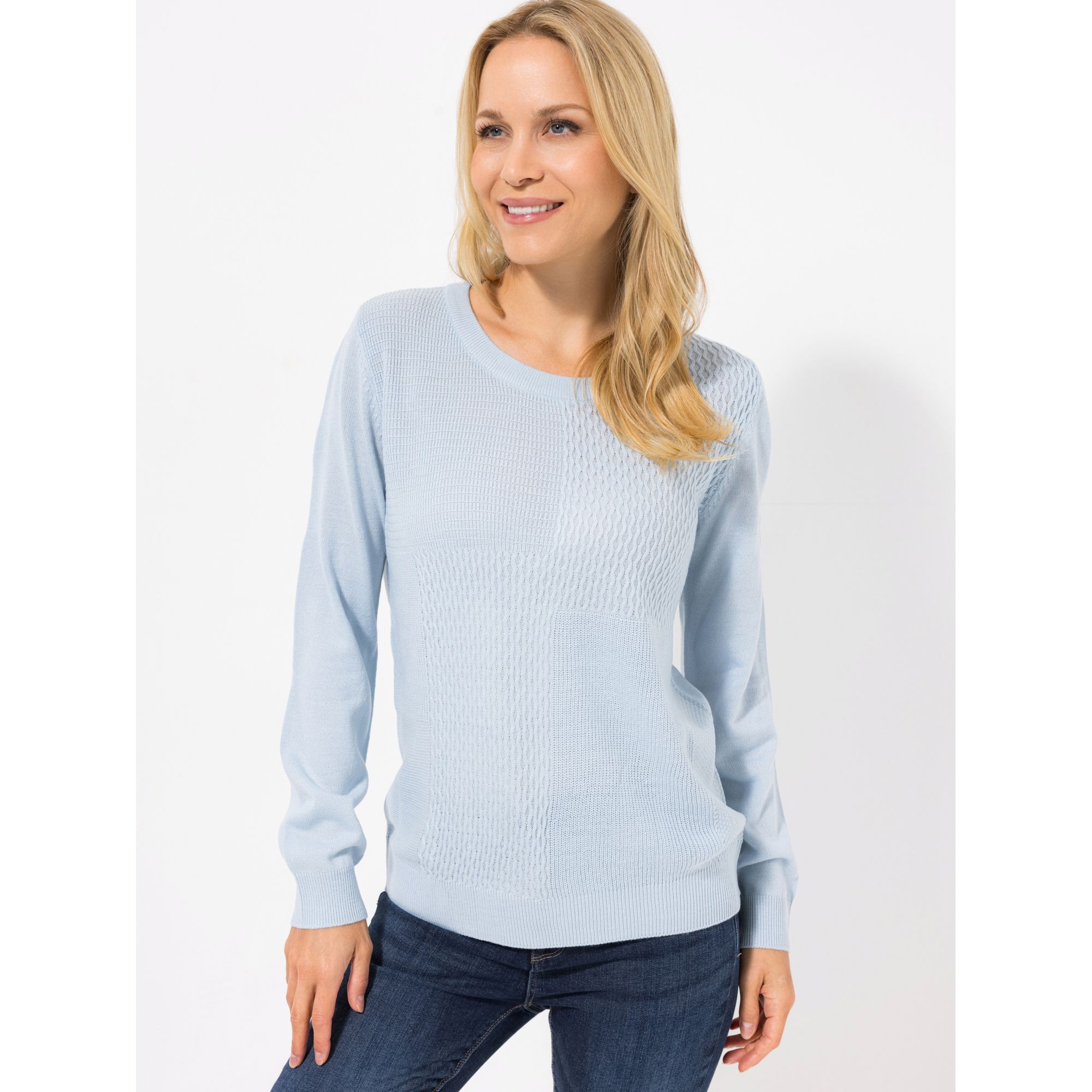 Passt perfekt, um im Handumdrehen einen aparten Look zu kreieren: Der hellblaue Strukturstrick-Pullover von CASHMASOFT braucht nur Jeans und Turnschuhe als Partner, schon ist dein sportlich-elegantes Outfit fertig.