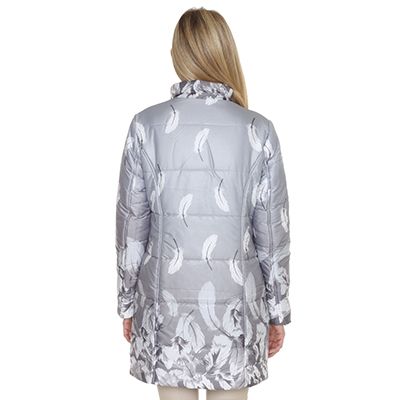 Diese warm wattierte CENTIGRADE Damenjacke trägt sich nicht nur federleicht, sondern sie kommt auch passend dazu mit einem wundervollen Federdruck-Design auf elegant-dunkelgrauem Grund. Ein stilvolles Outfit für jedes Wetter.
