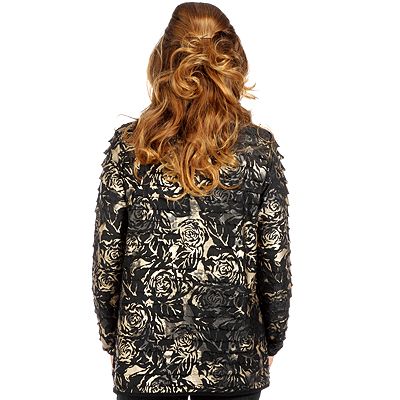Der CITIKNITS Cardigan wird offen getragen. Der abstrakte Rosendruck, das wahlweise goldfarbene oder silberfarbene Erscheinungsbild und die reiche Gestaltung mit Rüschen machen diesen Cardigan zu einem super weiblichen Oberteil.