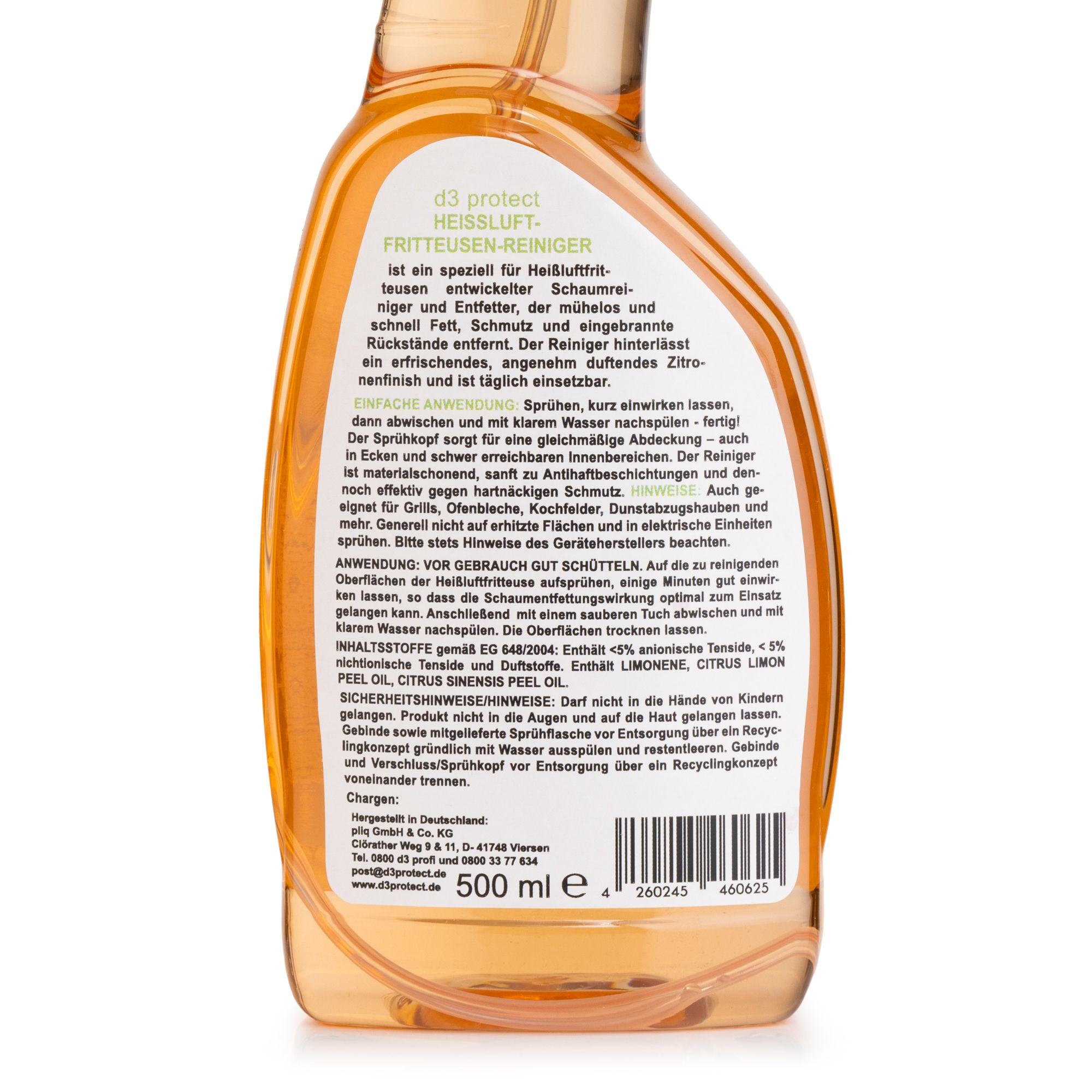 d3 protect® bringt frischen Glanz in deine Küche: Der Reiniger für Heißluftfritteusen mit Zitrusduft beseitigt hartnäckige Verschmutzungen und eingebranntes Fett im Handumdrehen. Mit der sanften Formel schützt du die Antihaftbeschichtung deiner Geräte und genießt eine einfache, sichere Anwendung.