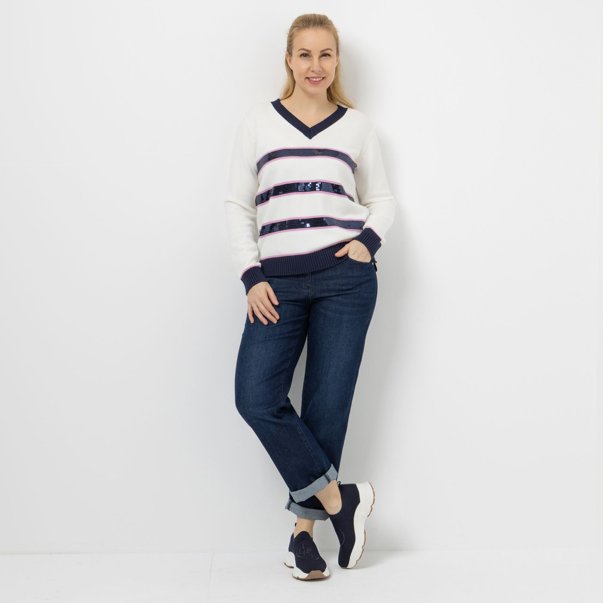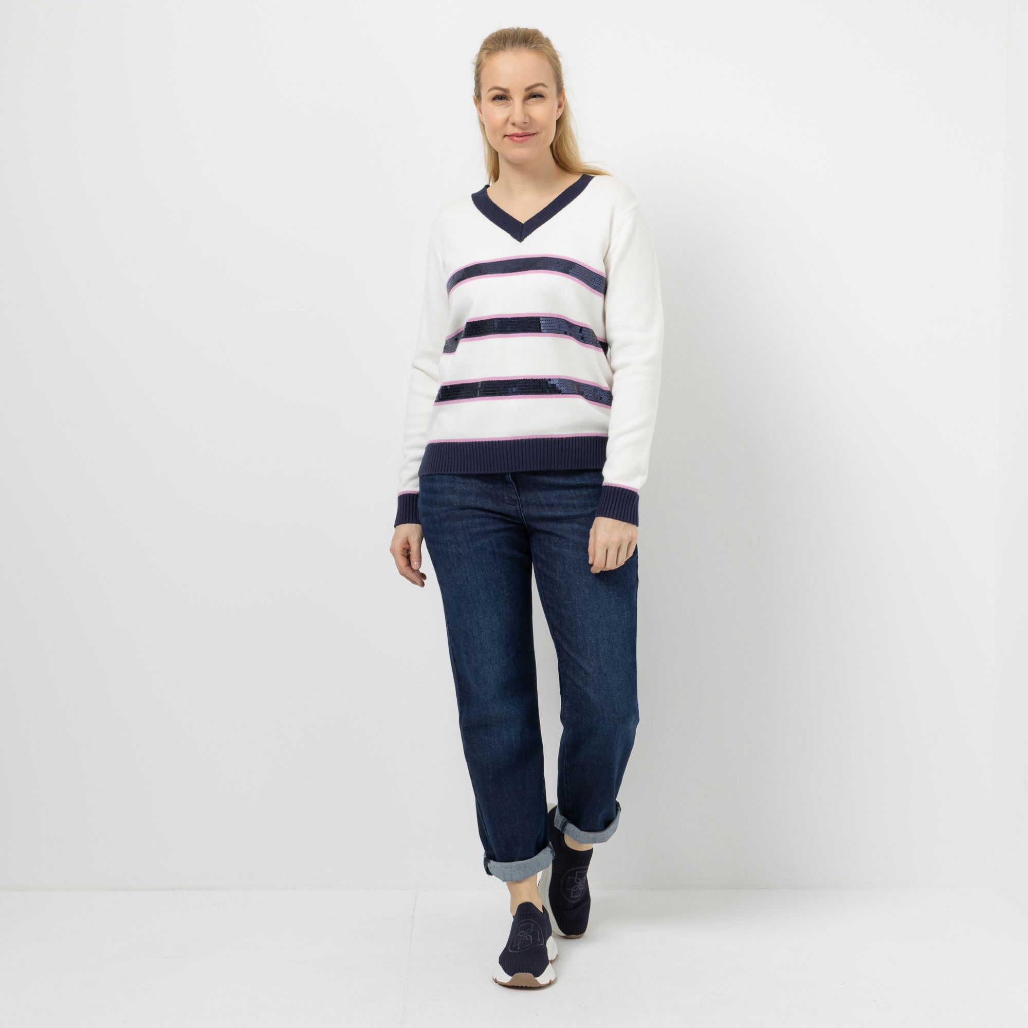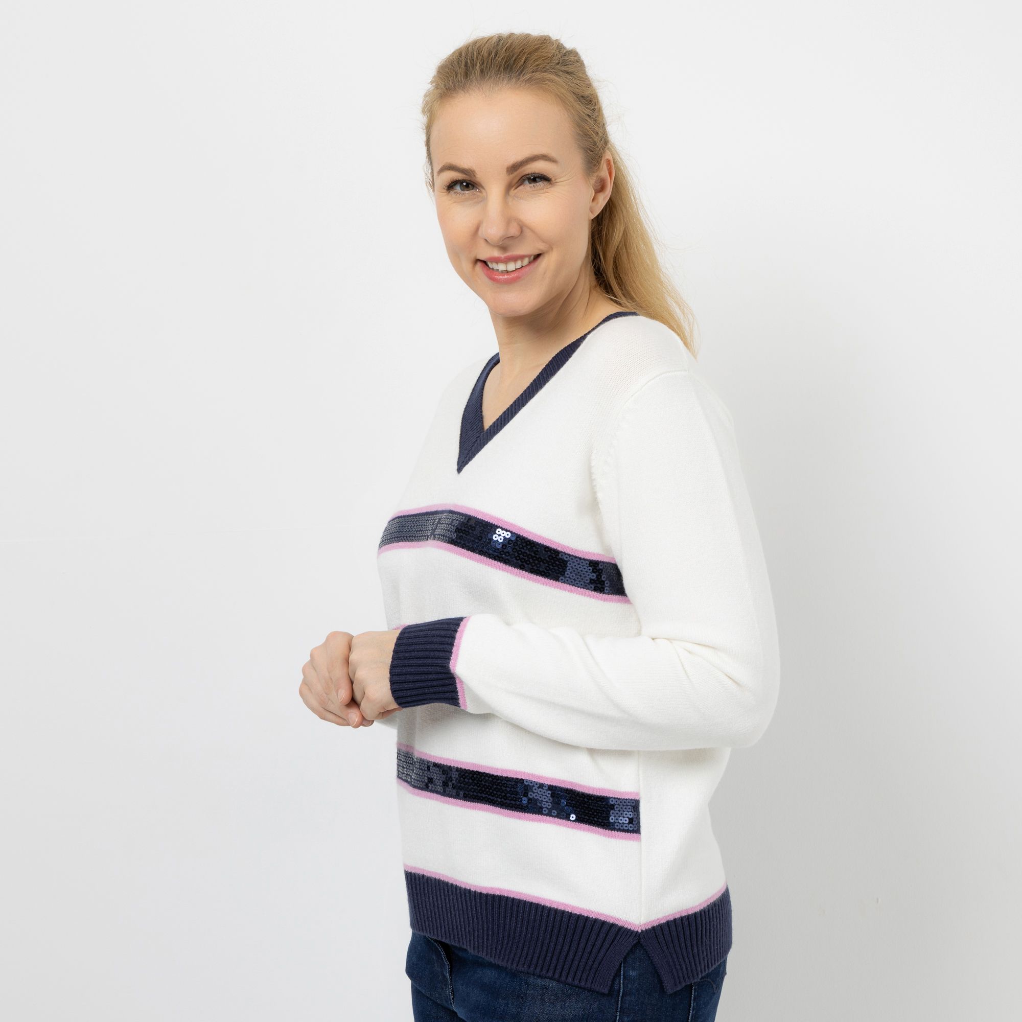 Mit dem DAWID by Dawid Tomaszewski Pullover bringst du frische Eleganz und liebevoll gesetzte Glanzakzente in deinen Alltag, denn auffällige Kontrastblockstreifen aus Pailletten harmonieren hier mit dem modernen Feinstrick und schmeicheln dabei jeder Bewegung.