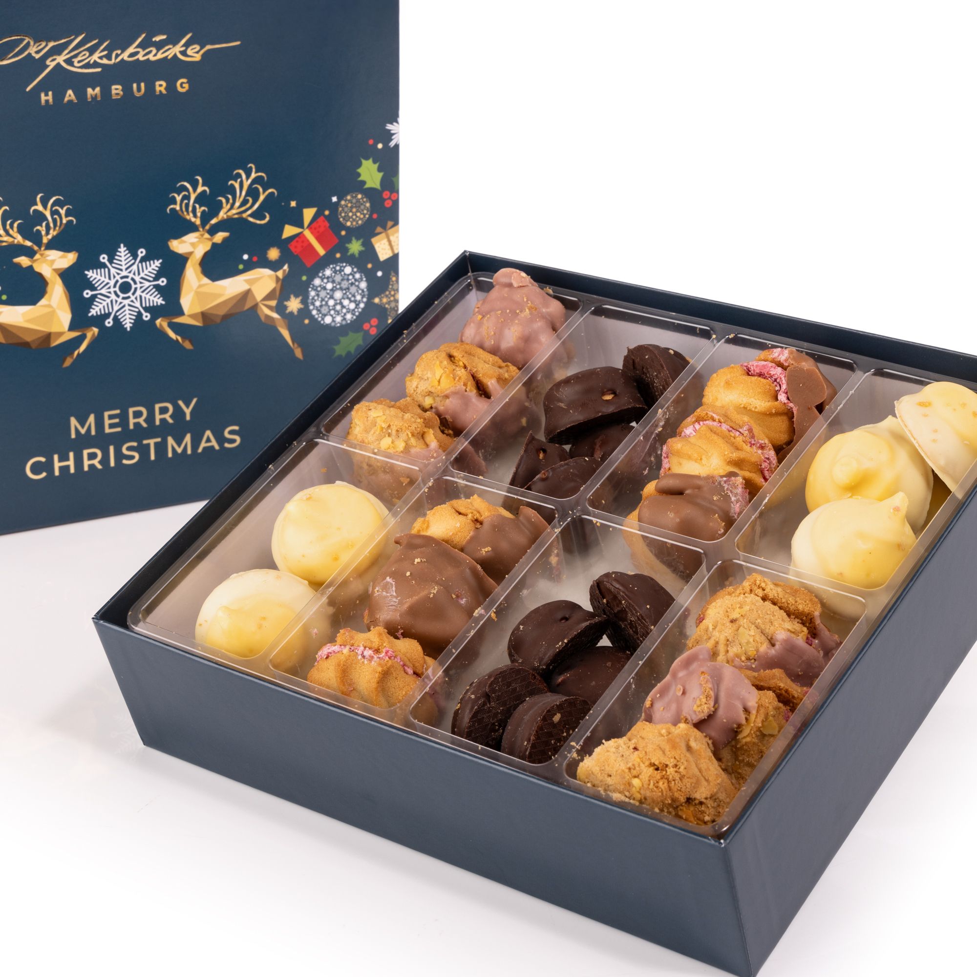 Feines Gebäck aus der Hamburger Manufaktur DER KEKSBÄCKER: Die exklusive Weihnachtsmischung vereint traditionelle Handwerkskunst mit innovativen Kreationen und bringt festlichen Genuss in vier raffinierten Sorten mit aromatischem Alkohol.