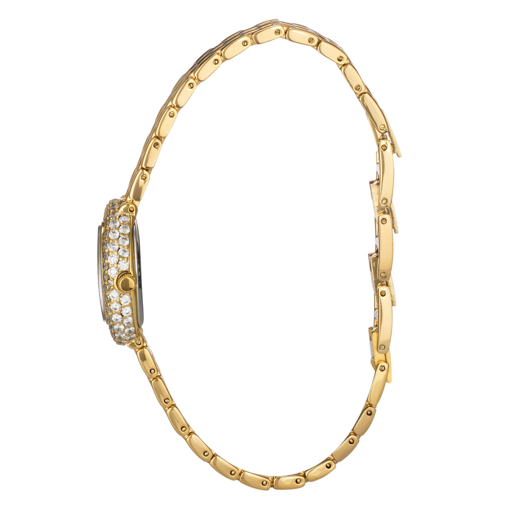 DIAMONIQUE® begeistert mit dieser glamourösen Damenuhr im ovalen Design, die ein Metallband mit funkelnden Zirkonia-Steinen und ein zart schimmerndes Perlmutt-Zifferblatt kombiniert