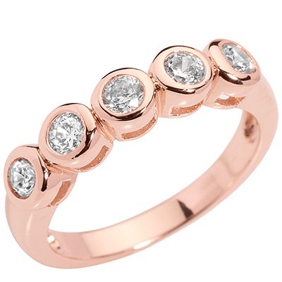 Dieser rosévergoldete Silber-Ring aus unserer DIAMONIQUE Schmuckkollektion präsentiert fünf weiße DIAMONIQUEs im Brillantschliff in Zargenfassung. Ein funkelndes Schmuckstück für viele Anlässe. Details