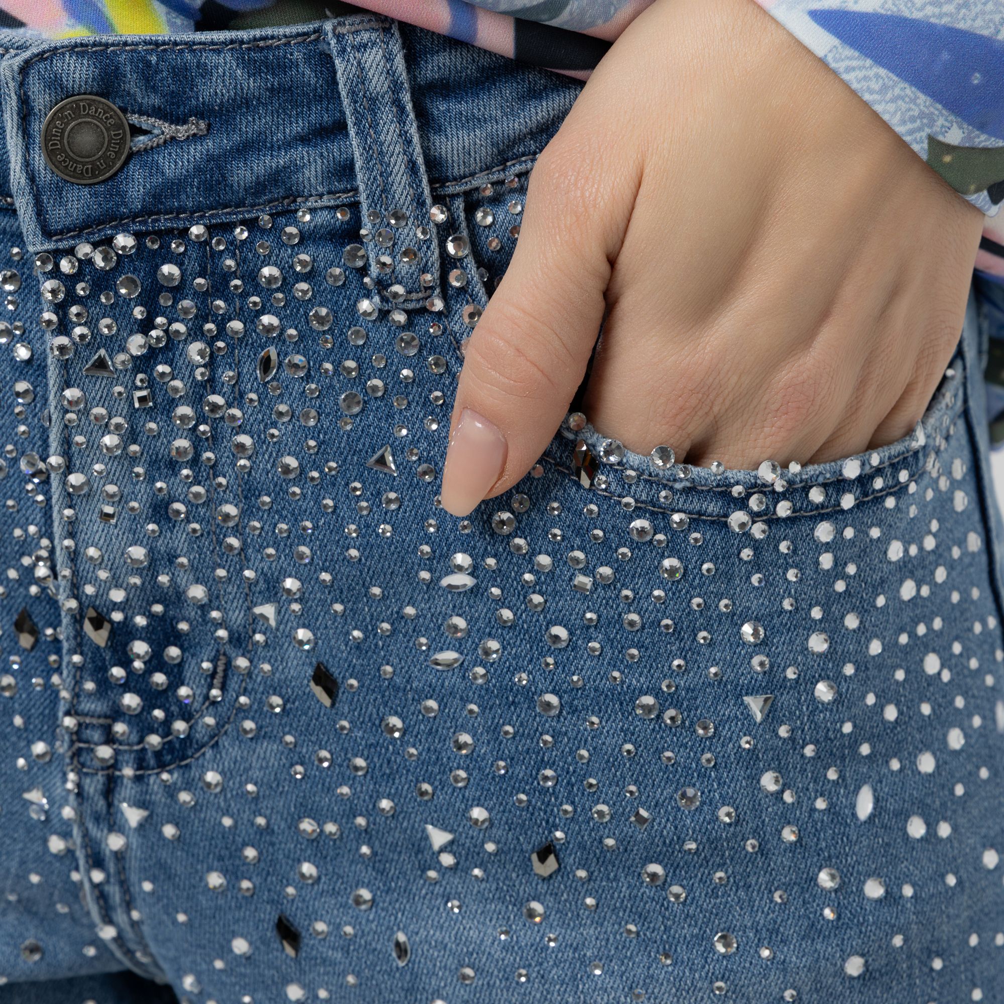 Mit DINE 'N' DANCE wird deine neue Lieblingsjeans zum echten Hingucker: Die raffinierte Strassverzierung auf der Vorderhose sorgt für das gewisse Funkeln im Alltag.